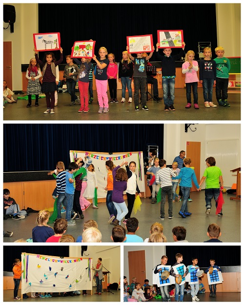 Nach dem Gottesdienst ging es zur Einschulungsfeier ins Bürgerhaus Dachsenhausen. Unsere „alten Schulhasen“ begrüßten ihre neuen Mitschüler mit Gesang, Tanz und kleinen Darbietungen.