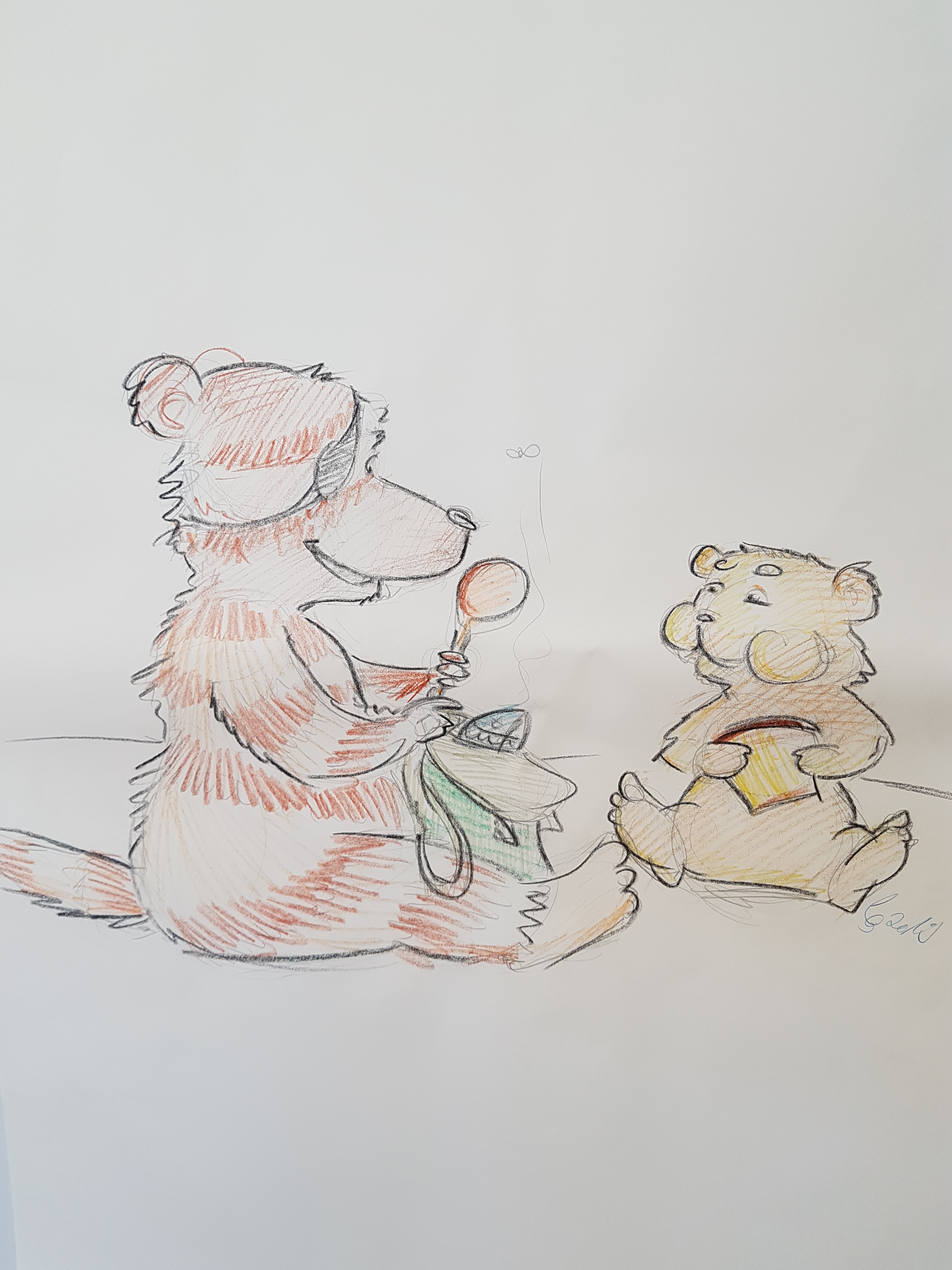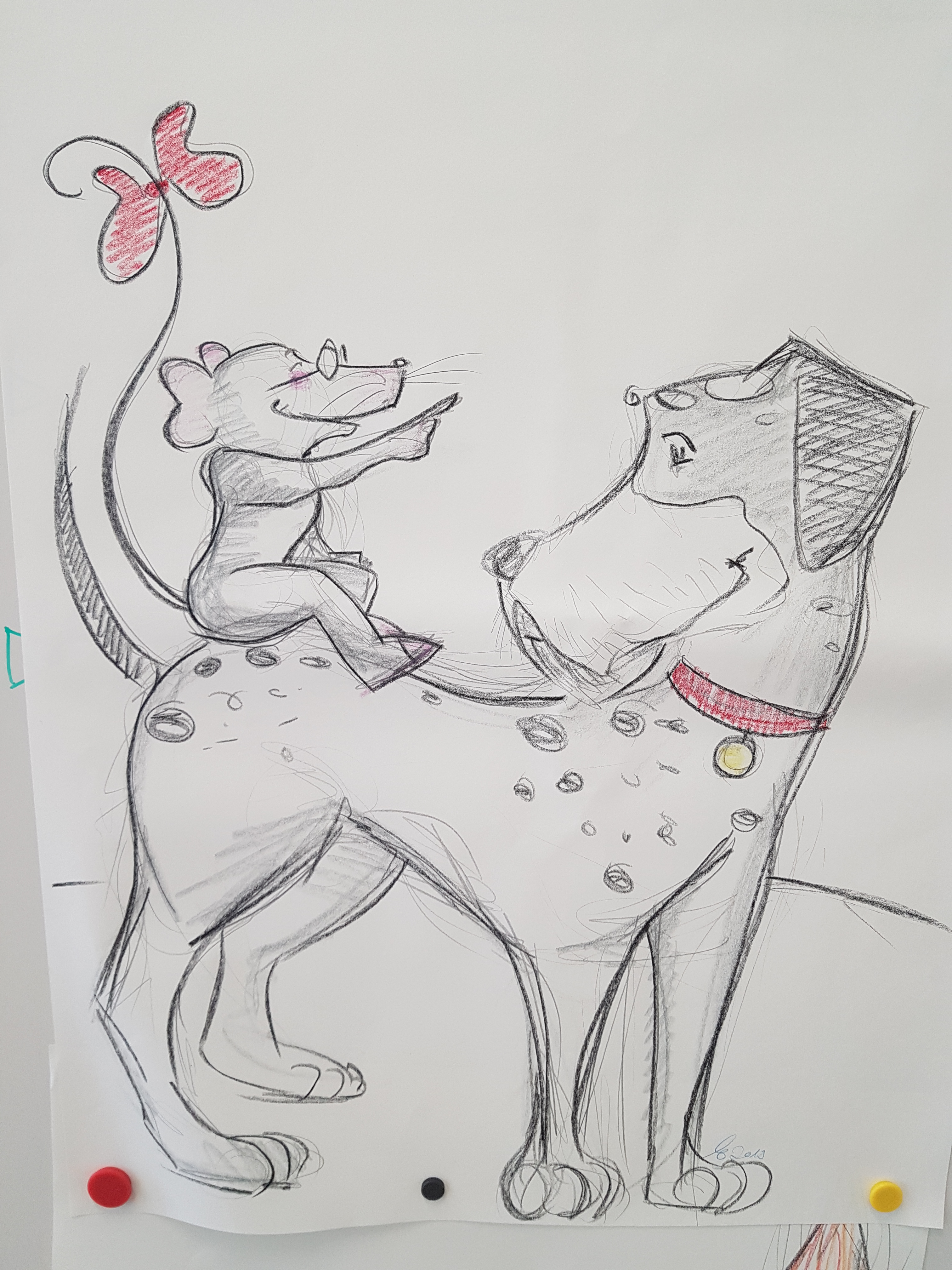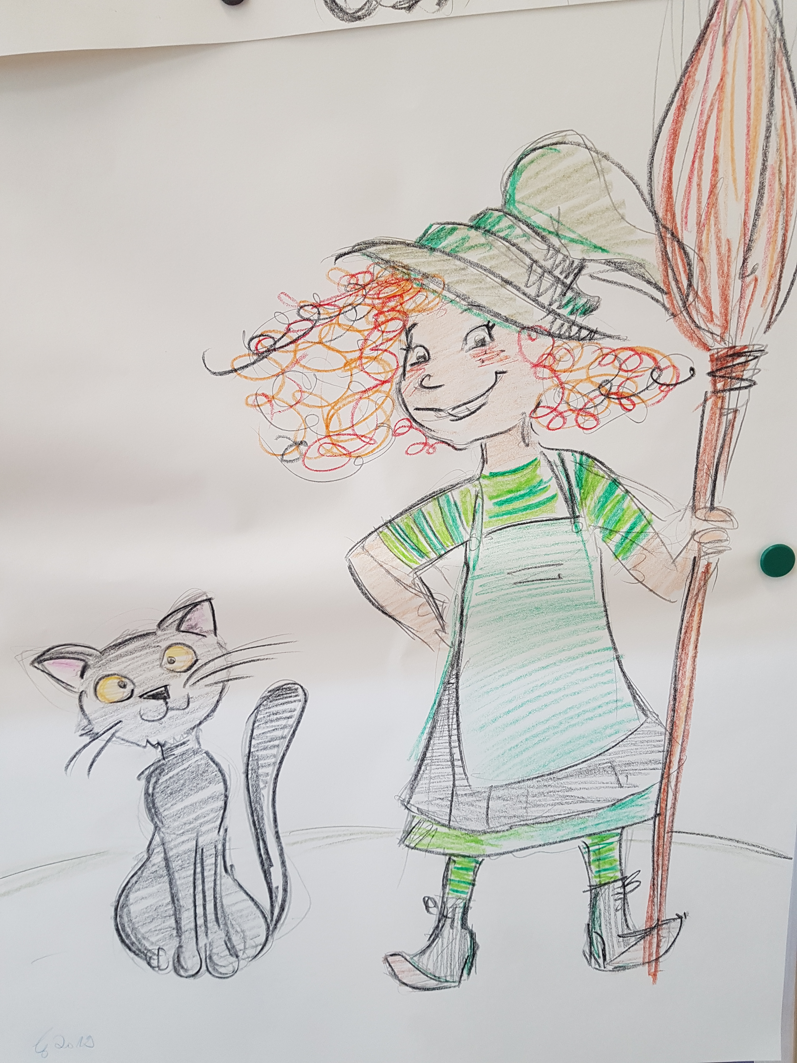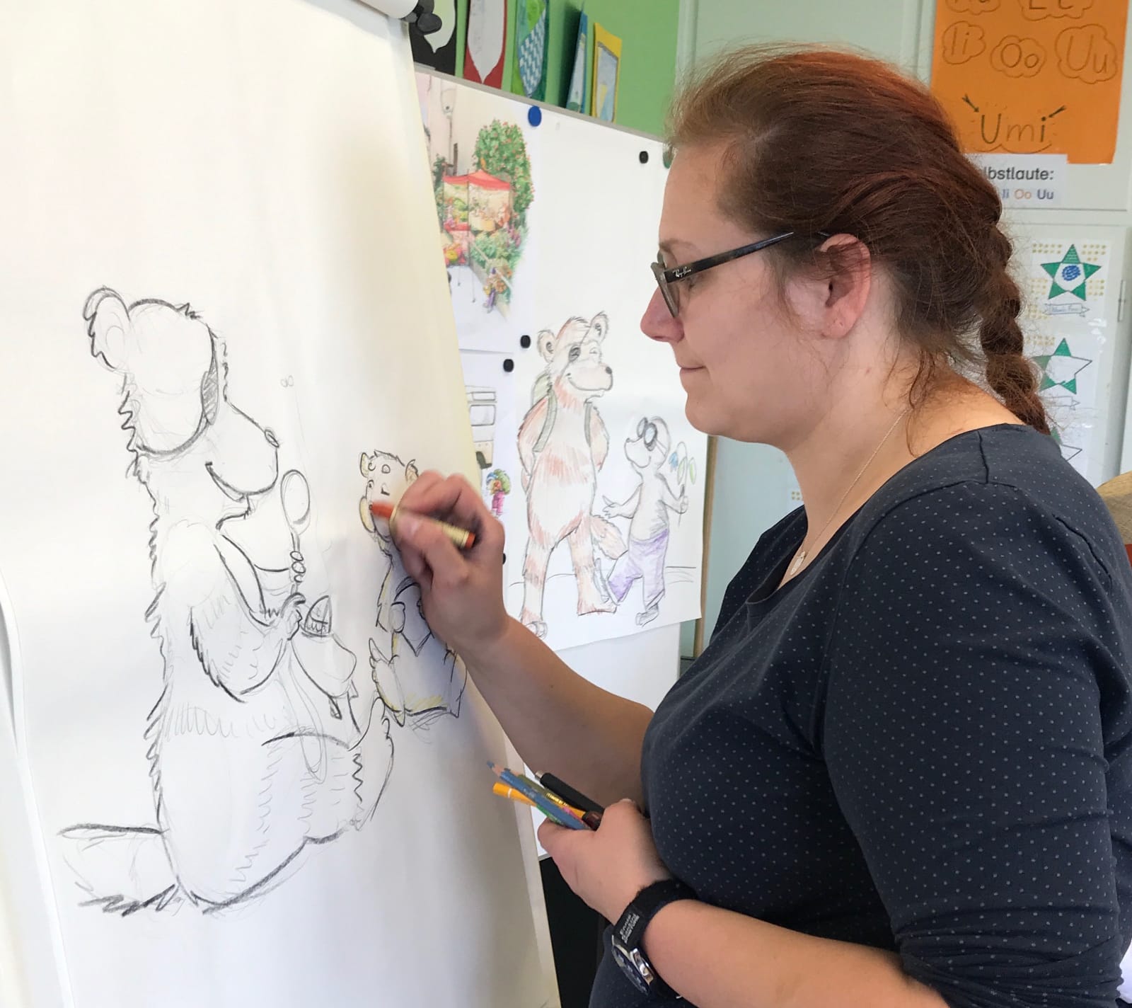 Sehr lebhaft las der Erzähler Arminius verschiedene Abschnitte aus dem Buch vor und erweckte die Geschichte somit zum Leben, was sich in den faszinierten und gespannten Blicken der Kinder wiederspiegelte. Dabei lernten die Schüler nicht nur Luzie und Lione sowie weitere Freunde der beiden besser kennen, sondern erfuhren auch einige interessante Informationen über die Marksburg. Während Arminius vorlas, verhalf die Illustratorin Catherina Baldauf der Geschichte in besonderem Maße zum Leben, indem sie freier Hand mehrere Szenen aus der Geschichte und die verschiedenen Figuren auf einem Flipchart zeichnete. So entstanden in kurzer Zeit 7 wunderschöne originale Zeichnungen, welche nun den Flur der Grundschule als Erinnerung schmücken. Nach einer gemeinsamen Verabschiedung bedankten sich Schüler und Lehrer mit einem großen Applaus und einem kleinen Dankeschön bei den Dreien und alle waren sich sicher, dass diese lebhafte Autorenlesung der Grundschule noch lange in Erinnerung bleiben wird.