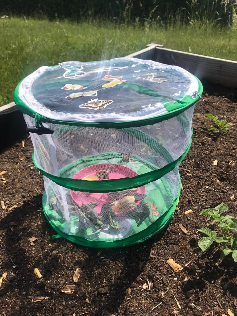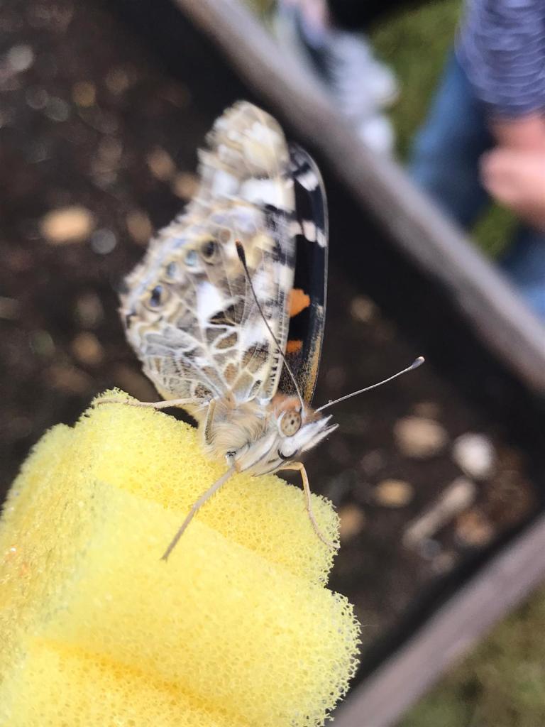 Während die Raupen zu Beginn sehr gefräßig waren, haben sie schon nach wenigen Tagen aufgehört zu fressen und sich für die Verpuppung bereit gemacht. Hierzu krochen sie zum Deckel des Aufzuchtbehälters. An diesem spann jede Raupe einen kleinen Seidenknopf, an welchem sie sich dann kopfüber und in J-Form hing. Nun stand die Verpuppung unmittelbar bevor. Bevor die Schmetterlinge schlüpften, wurden sie in einen speziellen Flugkäfig umgesiedelt. Nun verbrachten sie einige Zeit in ihrem Kokon, bis es dann endlich so weit war. Teilweise hatten die Kinder Glück und konnten sogar live dabei sein, während ein Schmetterling geschlüpft ist. Für die Kinder war es ein Highlight diesen Prozess hautnah mitzuerleben. Die Schmetterlinge konnten nun bei all ihren Tätigkeiten beobachtet werden. Sie bekamen täglich frisches Futter. Besonders spannend war es, den Schmetterlingen beim Fressen zuzuschauen, wenn sie ihren langen Rüssel ausrollten, um süße Flüssigkeiten zu trinken. Distelfalter leben in der Regel 2-5 Wochen. Das Beobachten der Schmetterlinge war für die Kinder spannend, lehrreich und ein unvergessliches Erlebnis. Aber nach wenigen Tagen hieß es dann Abschied nehmen. Die Klassen sind mit ihren Lehrerinnen Frau Fußinger und Frau Igel nach draußen gegangen und haben die Schmetterlinge freigelassen. Einige Schmetterlinge flogen direkt weg, andere blieben noch ein wenig in der Nähe der Klassen, sodass die kleinen Forscher eine letzte Möglichkeit bekamen die Schmetterlinge zu beobachten. Alle sind sich einig – das Schmetterlingsprojekt war ein voller Erfolg!