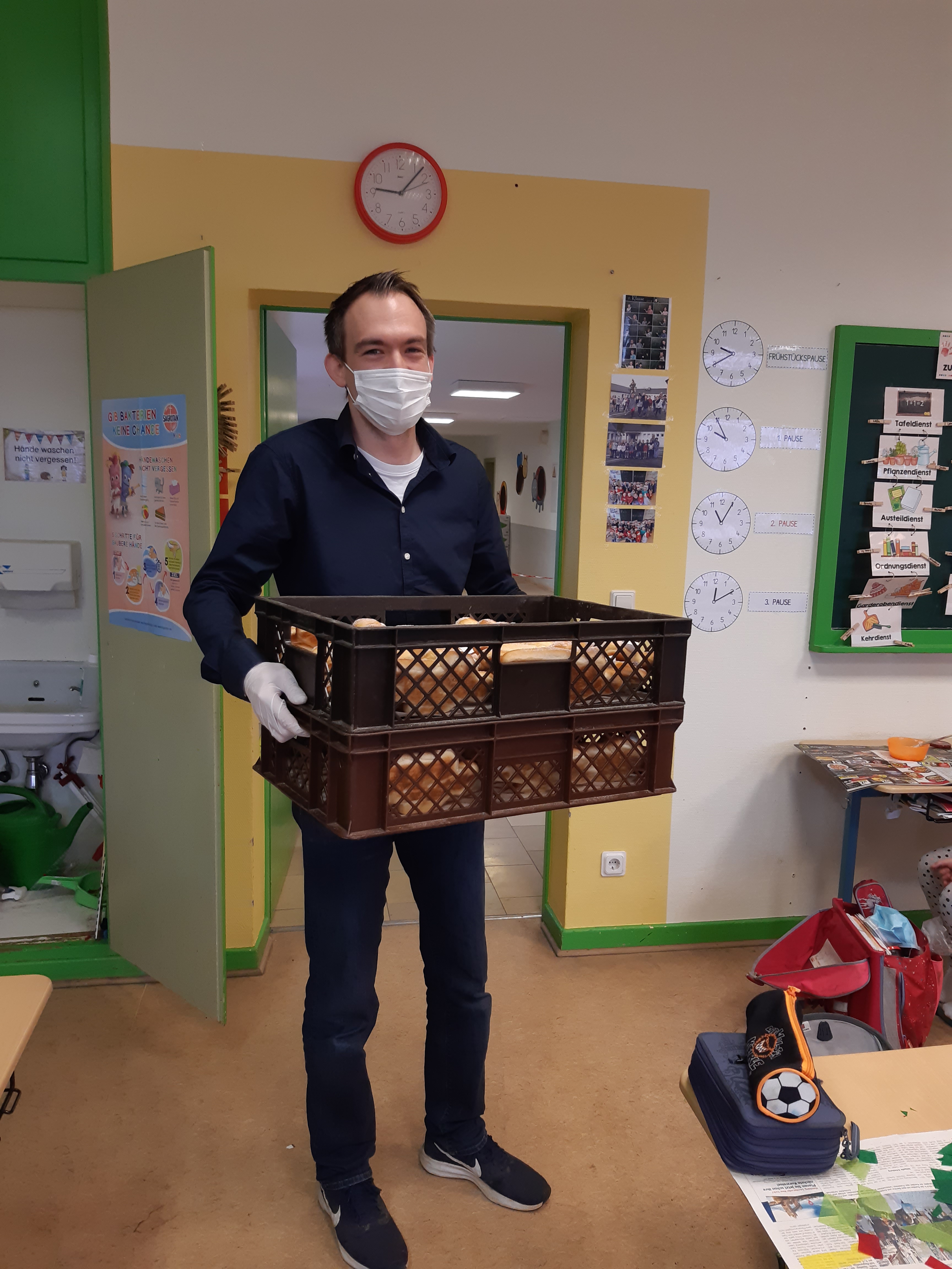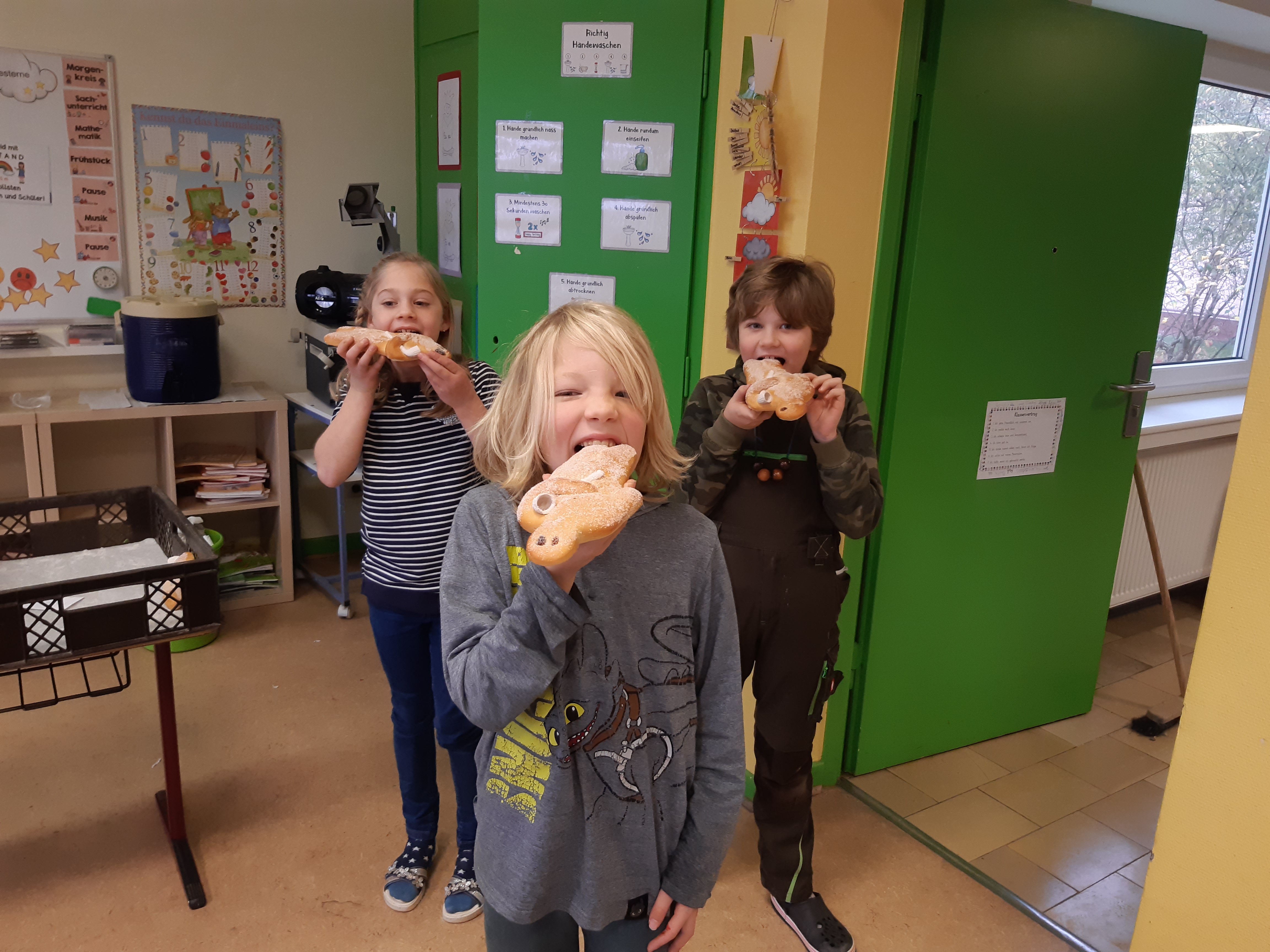 Des Weiteren gab es viele verschiedene Stationen, an denen sich die Kinder mit St. Martin, seinem Leben und den Sankt Martins Traditionen auseinandersetzten. Natürlich durfte das gemeinsame Singen nicht fehlen, Dafür trafen sich alle Schülerinnen und Schüler auf dem Schulhof der Grundschule Dachsenhausen. Doch was wäre Sankt Martin ohne Weckmann? Als Überraschung bekamen alle Kinder einen leckeren Weckmann – die Freude darüber war riesig! Ein großes Dankeschön geht hierbei an Dietmar Debus, der sich bereit erklärte die Weckmänner für die Kinder zu spenden!