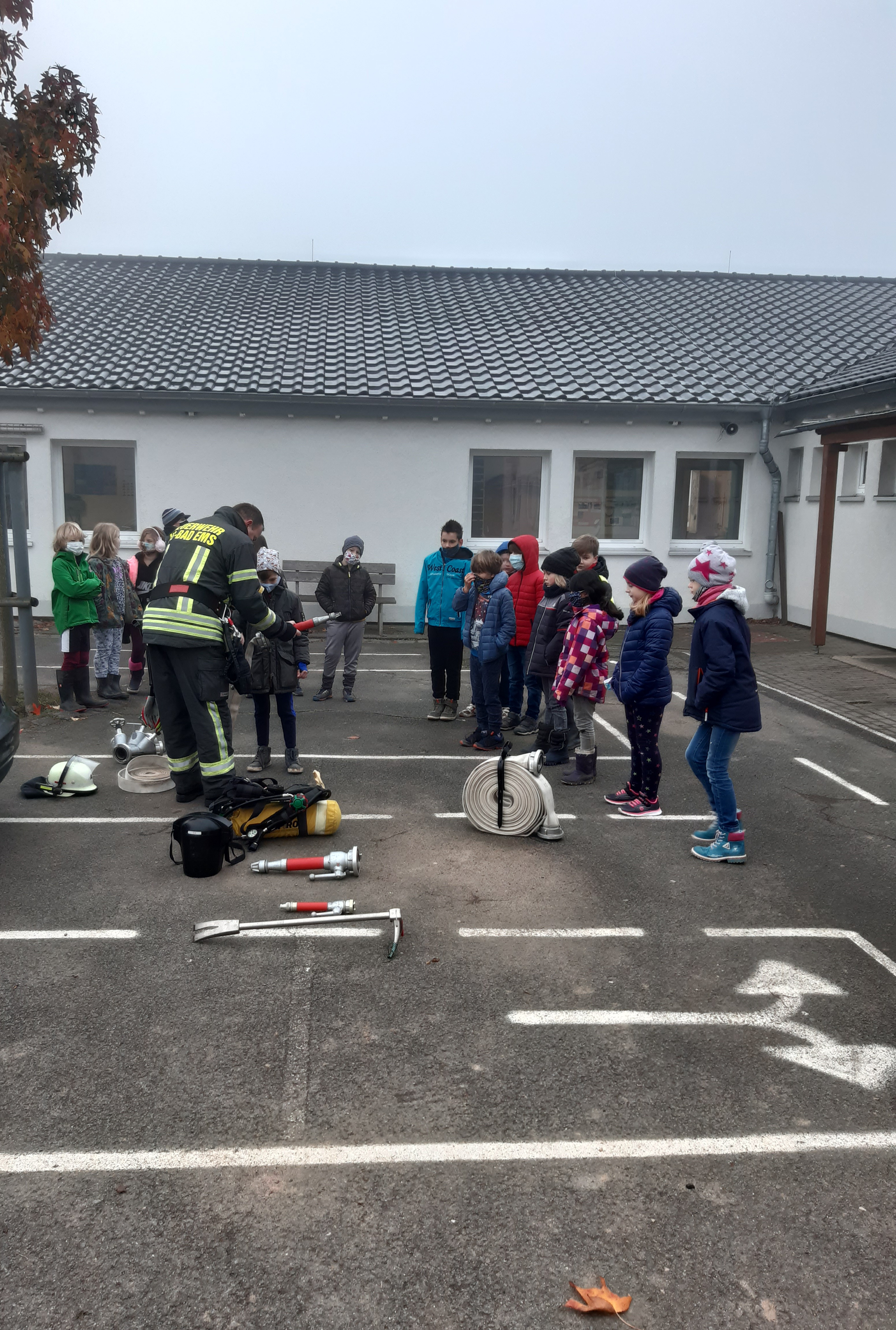 Im Rahmen der Unterrichtseinheit Feuer&Feuerwehr bekam die dritte Klasse der Grundschule Dachsenhausen am 26.11.2020 Besuch von Timo Schwarz, der ehrenamtlich bei der freiwilligen Feuerwehr tätig ist und sich bereit erklärt hat den Kindern einige wichtige Dinge über die Feuerwehr zu erklären. Wie werde ich Feuerwehrmann? Was muss ich beim Löschen eines Brandes beachten? Dies waren nur einige der Fragen, die den Kindern sprichwörtlich unter den Nägeln brannten und im Laufe des Vormittags geklärt wurden. Besonders interessant waren die Gegenstände, die Herr Schwarz mit auf den Schulhof der Grundschule Dachsenhausen brachte. Darunter die Ausrüstung der Feuerwehrleute, die sie bei einem Einsatz tragen müssen. Die Kinder staunten, was ein Feuerwehrmann im Einsatz alles anziehen muss und vor allem wie schwer alles zusammen ist. Neben der Ausrüstung durften die Feuerwehrschläuche nicht fehlen, die sie sogar selbst an einen Hydranten anschließen durften. Besonders viel Spaß hatten sie dabei gemeinsam mit dem Feuerwehrschlauch in der Hand eine Runde über den Schulhof zu gehen. Abschließend erklärte uns Herr Schwarz noch den „Kinderfinder“, ein Aufkleber, den man durch seine neongelbe Farbe auch bei starker Rauchentwicklung erkennen kann und in Kinderzimmern anzubringen ist. Alle waren sich einig – der Tag war sehr lehrreich und hat großen Spaß gemacht! An dieser Stelle noch einmal vielen Dank an Herrn Schwarz.
