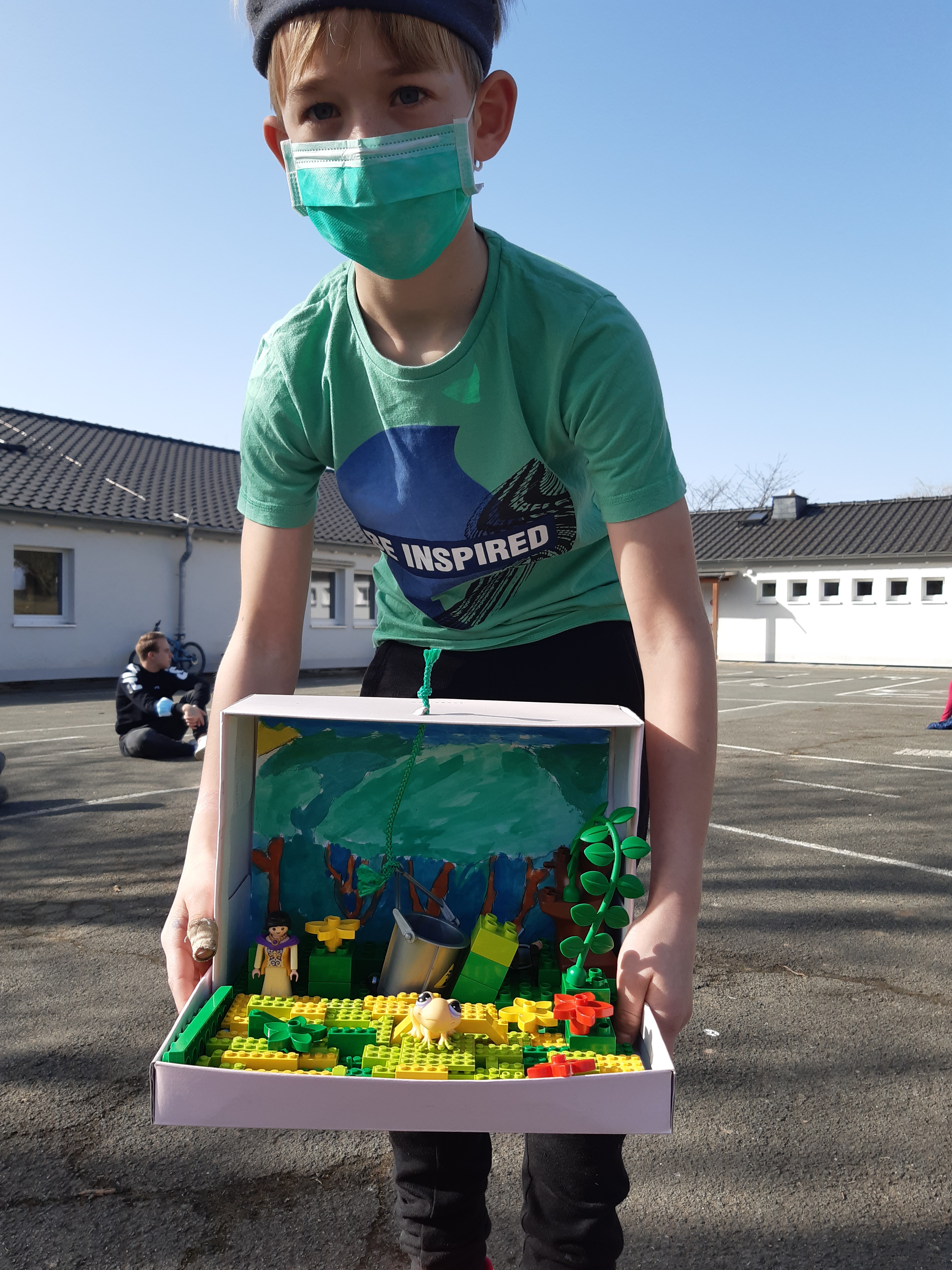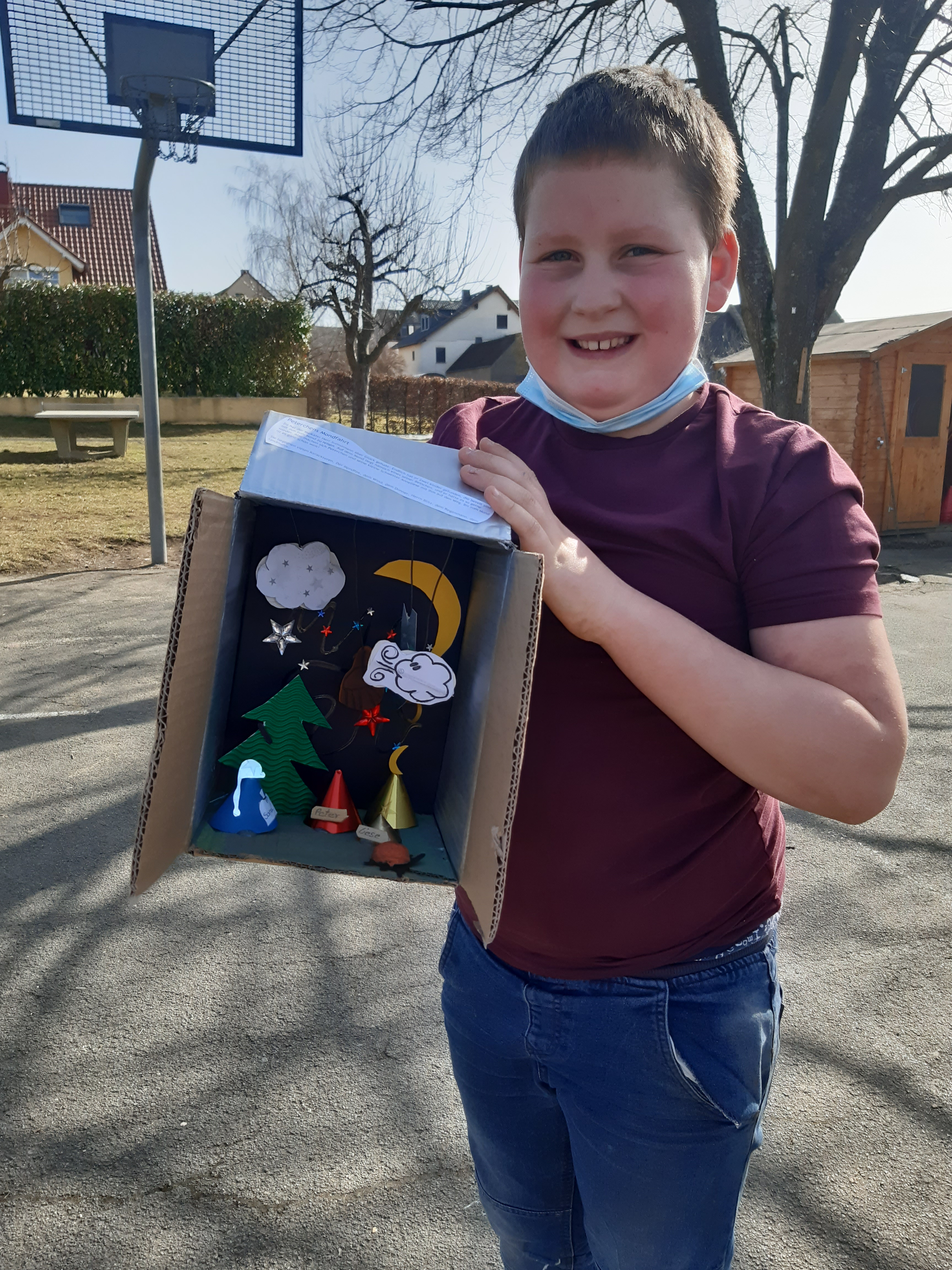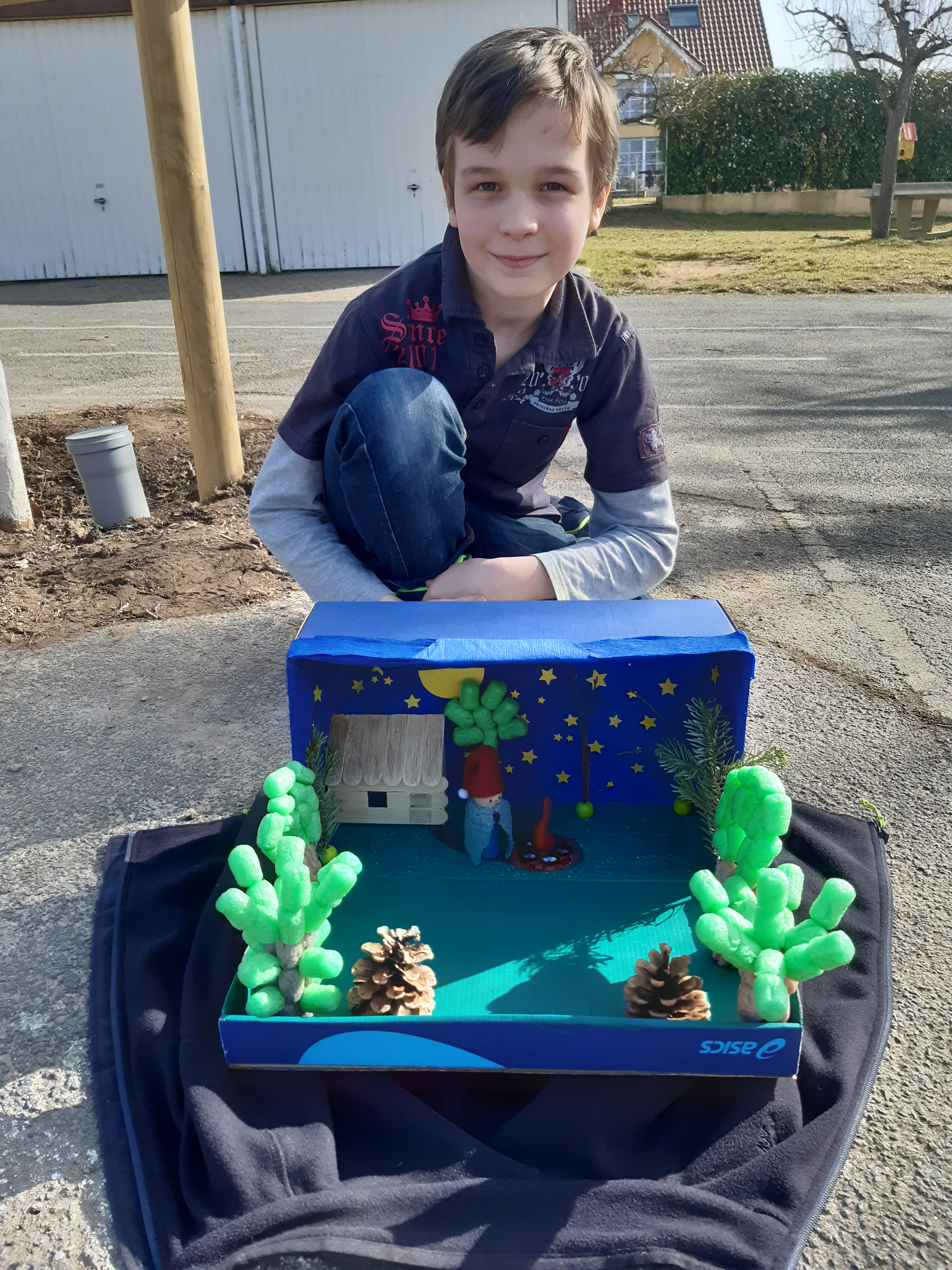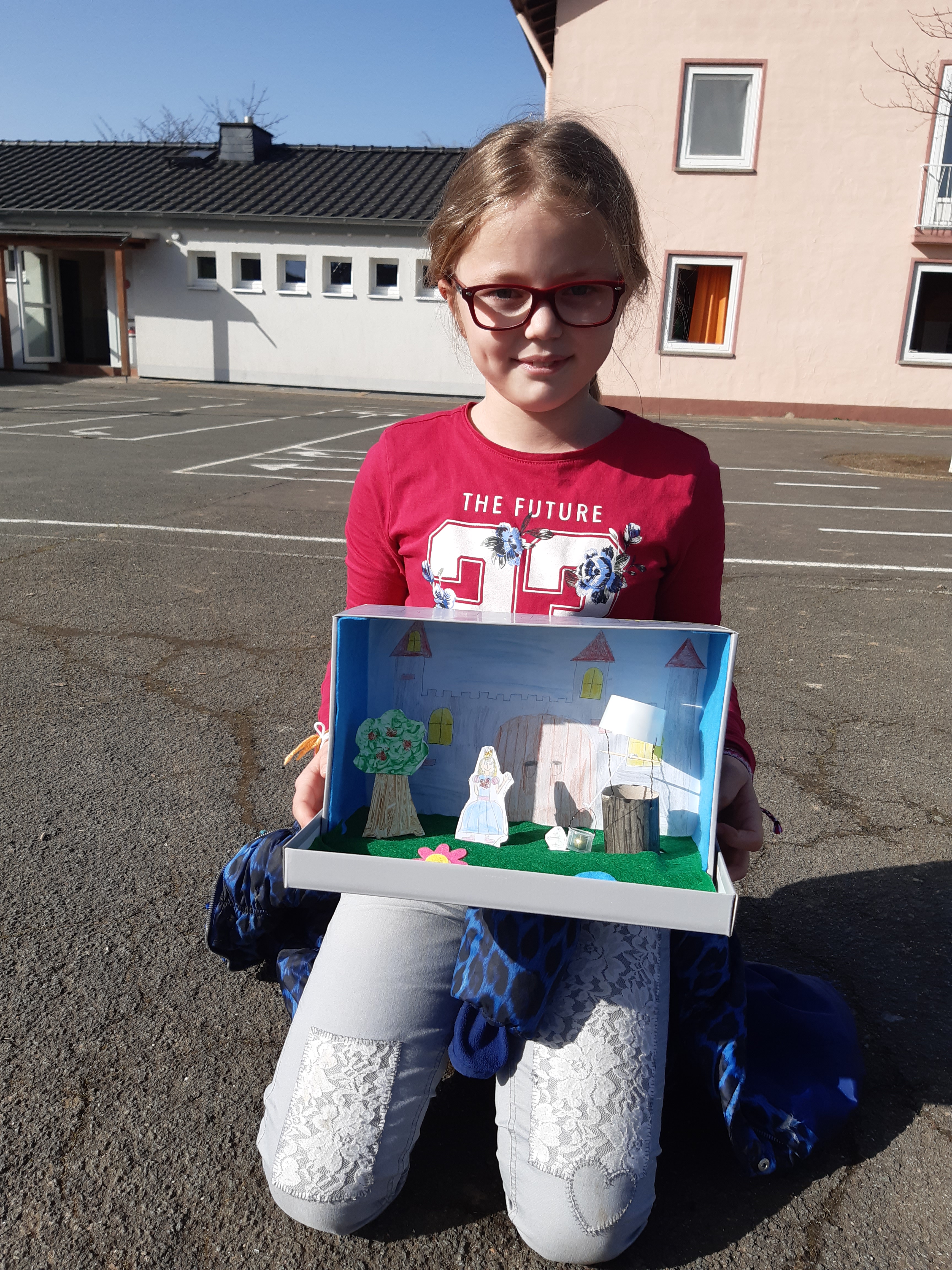 Die Klasse wurde jedoch nicht nur als Märchenautoren kreativ. Von ihrem Klassenlehrer Herr von Glasow bekamen die Kinder die Aufgabe, ein „Märchen im Schuhkarton“ zu gestalten. Die Kinder sollten sich hierfür ein Lieblingsmärchen aussuchen und zu einer bestimmten Szene dieses Märchens einen Schuhkarton gestalten, der somit als Märchenbühne dient. So entstanden im Homeschooling viele tolle Schuhkarton-Märchen, welche auf der Homepage bestaunt werden können. Mal sehen, ob ihr alle Märchen erraten könnt.
