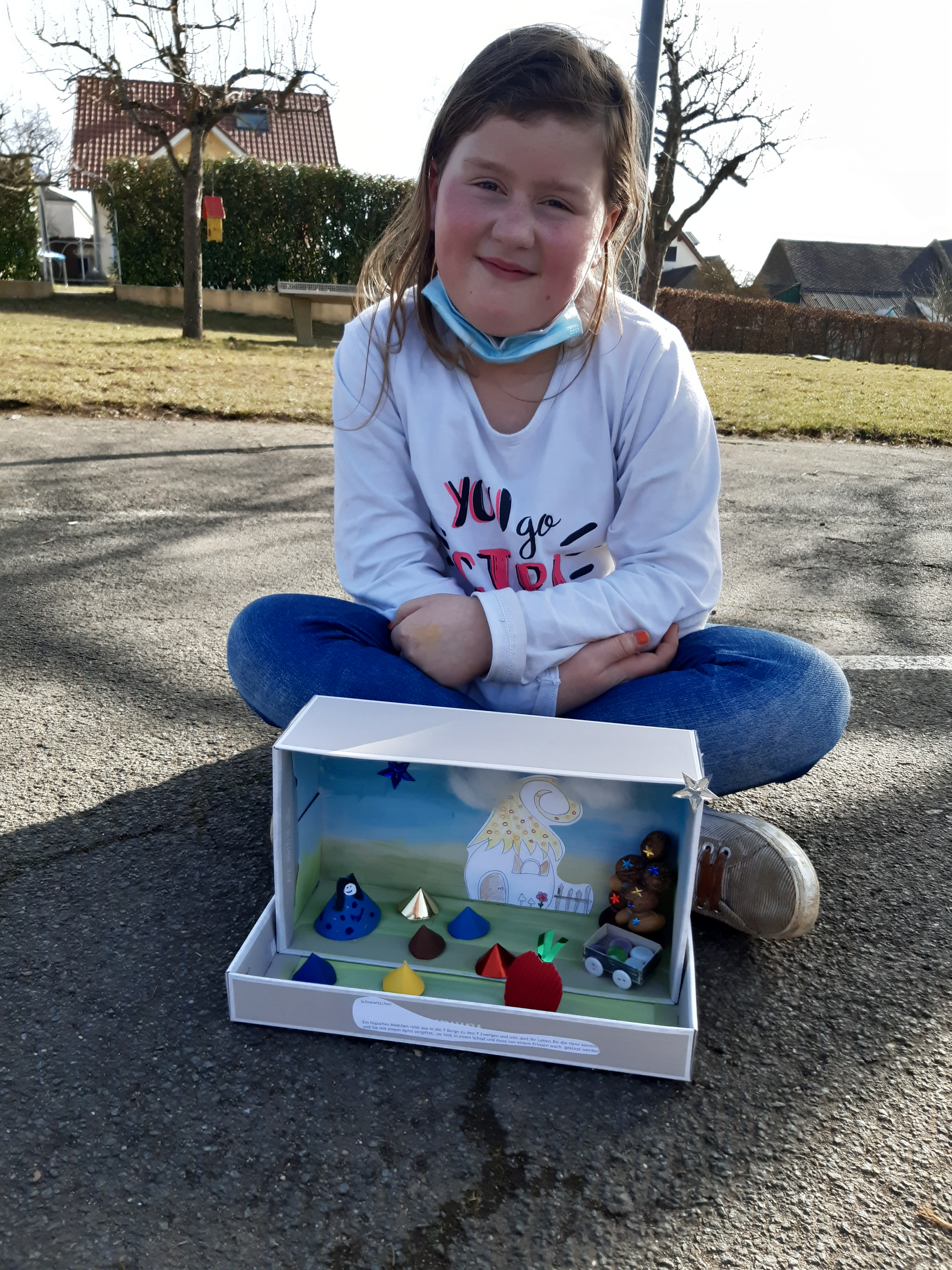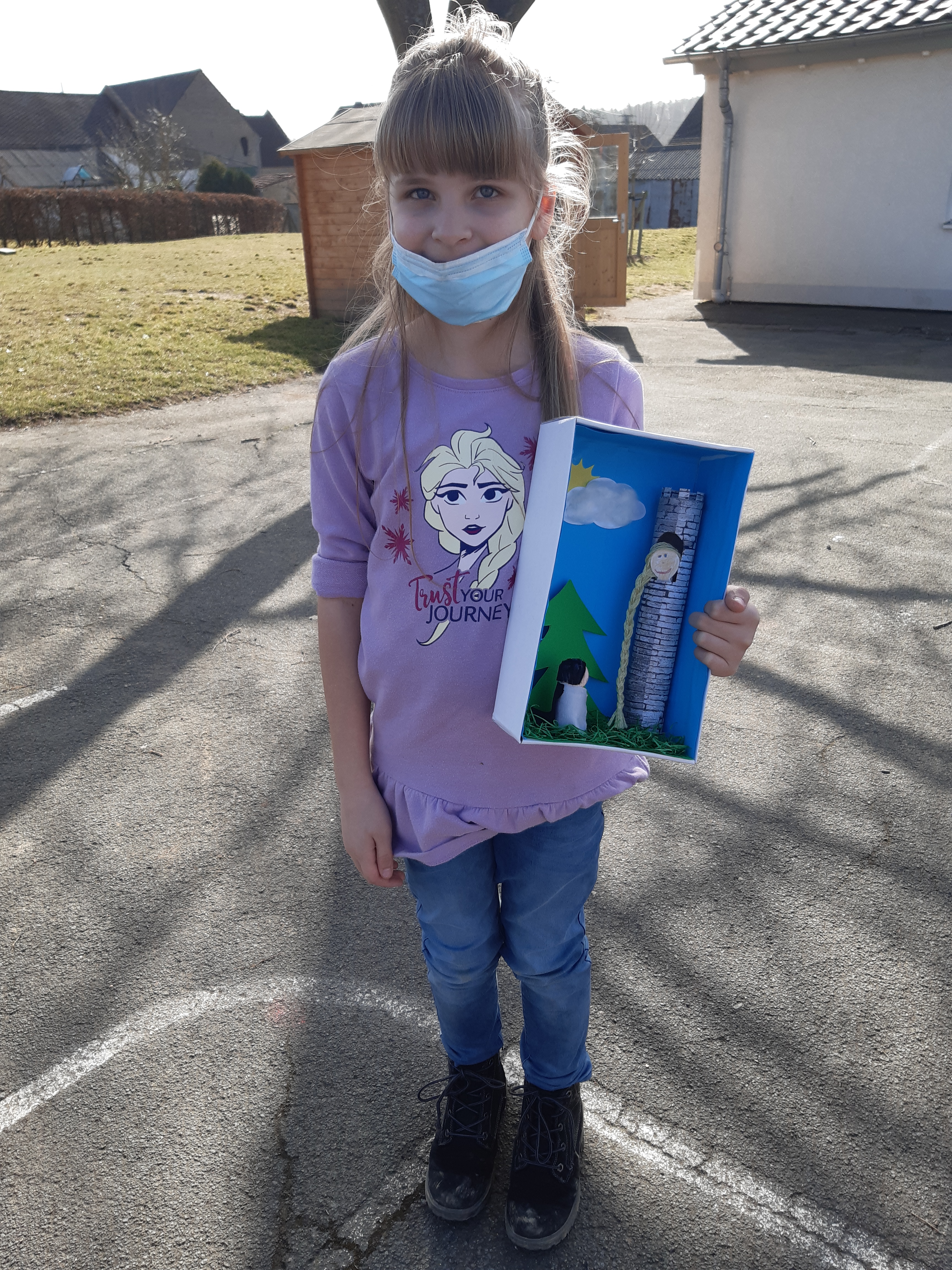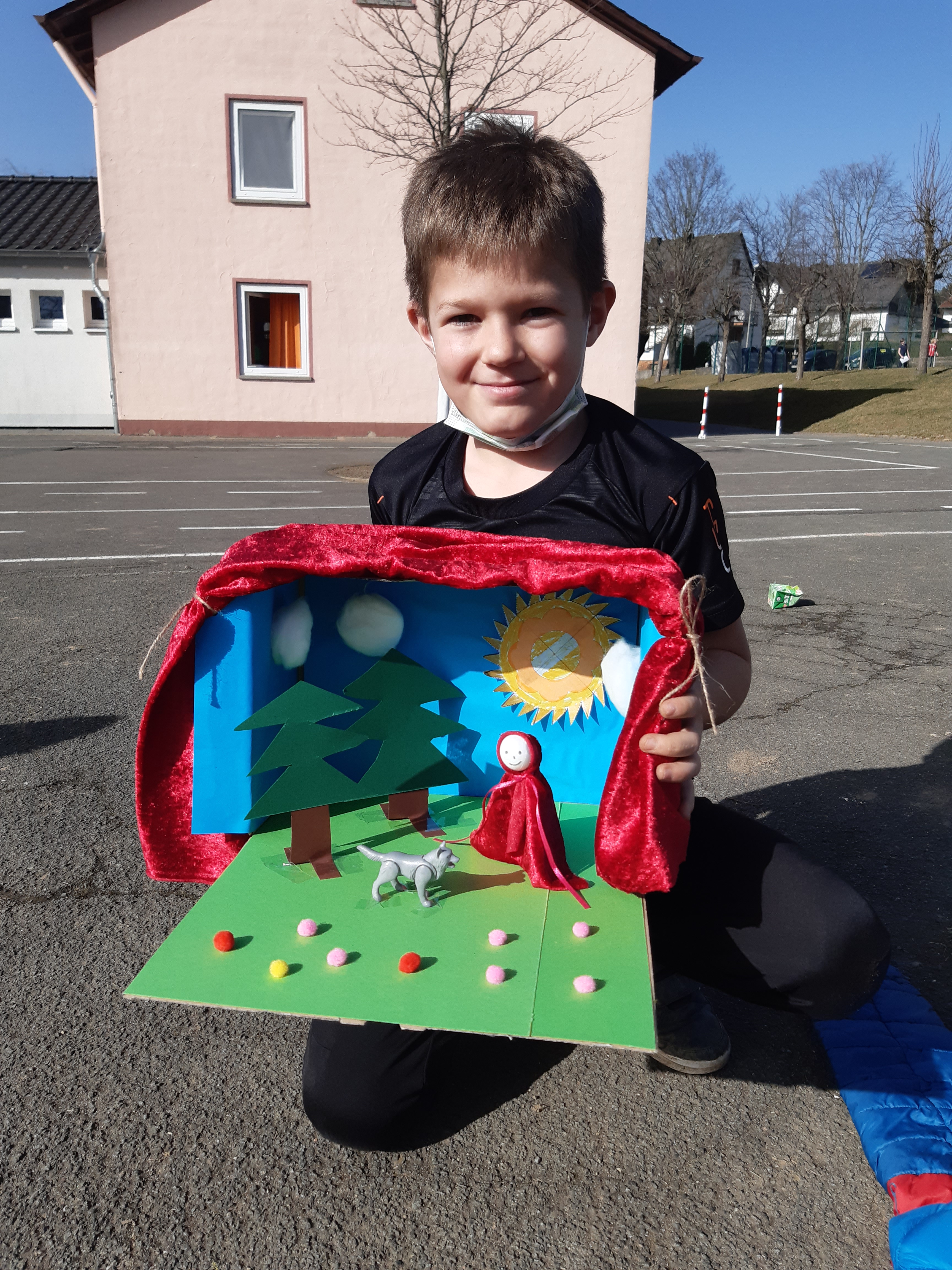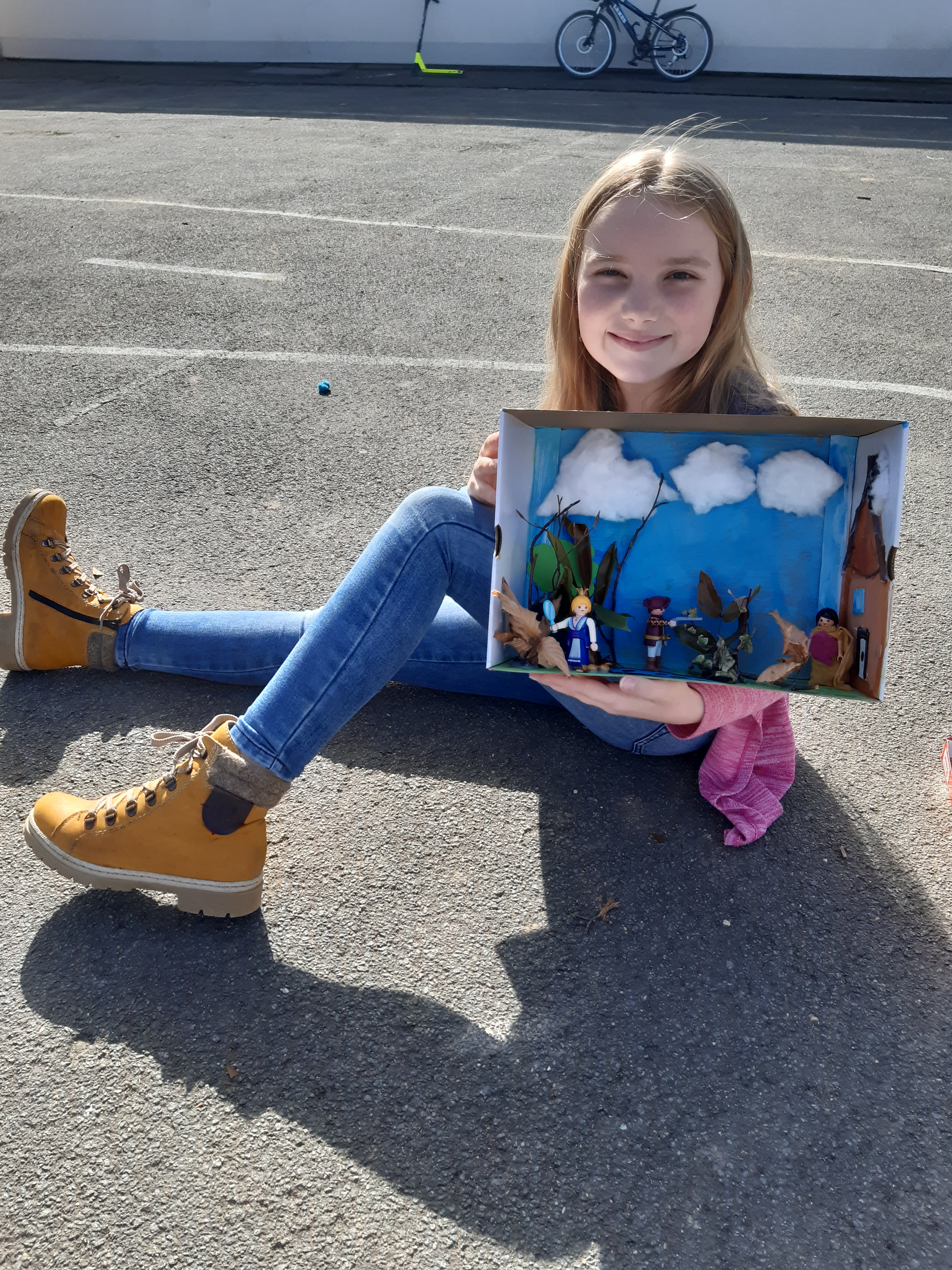 Die Klasse wurde jedoch nicht nur als Märchenautoren kreativ. Von ihrem Klassenlehrer Herr von Glasow bekamen die Kinder die Aufgabe, ein „Märchen im Schuhkarton“ zu gestalten. Die Kinder sollten sich hierfür ein Lieblingsmärchen aussuchen und zu einer bestimmten Szene dieses Märchens einen Schuhkarton gestalten, der somit als Märchenbühne dient. So entstanden im Homeschooling viele tolle Schuhkarton-Märchen, welche auf der Homepage bestaunt werden können. Mal sehen, ob ihr alle Märchen erraten könnt.