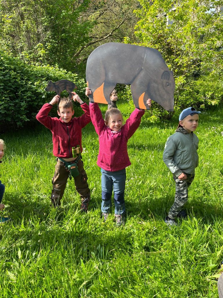 Eine Person durfte an diesem Tag allerdings nicht fehlen, Waldpädagoge Willi Bausch-Weiß, der sich wieder mal ein abwechslungsreiches Programm für die Kinder ausgedacht hatte. Den Namen „Willi“ konnten sich die Kinder leicht merken, denn ihr Klassenmaskottchen Willi der Waschbär war auch Teil des Ausfluges. Viele Teambuildingspiele wie zum Beispiel die Riesenwippe, bei der es darum ging als Klasse das Gleichgewicht zu halten oder auch der Transport einer Holzkugel mit Seilen haben die Kinder als Gemeinschaft mit Bravour gemeistert. Neben den spielerischen Aktivitäten lernten die Kinder auf einem Pirschpfad die verschiedenen Tiere des Waldes näher kennen und erforschten eine Fledermaushöhle. Auf kindgerechte Weise wurde so nicht nur das Wissen über den Wald erweitert, sondern ein Bewusstsein für die Bedeutung des Waldes als Naherholungsraum geweckt.
