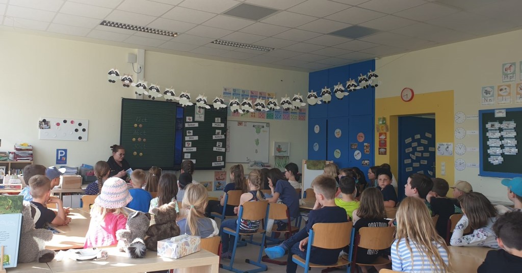 Schon konnte es losgehen. Alle Kinder trafen sich im Klassenzimmer der Klasse 1. Dort wartete ein ganz besonderer Gast auf sie: Illustratorin Catherina Baldauf, die zu dem Erfinderteam rund um Bücher von Luzie und Leone gehört. Lione ist ein junger Hund aus Frankreich, der in Koblenz sein neues Zuhause findet und sich gespannt auf den Weg macht, die Stadt kennenzulernen. Auf seiner Entdeckungstour trifft Lione dabei auf die kleine Altstadtmaus Luzie, in welcher Lione schnell eine neue Freundin findet und die ihm vieles über seine neue Heimat und deren Sehenswürdigkeiten erzählt und zeigt – genauer die Koblenzer Seilbahn und die Festung Ehrenbreitstein.