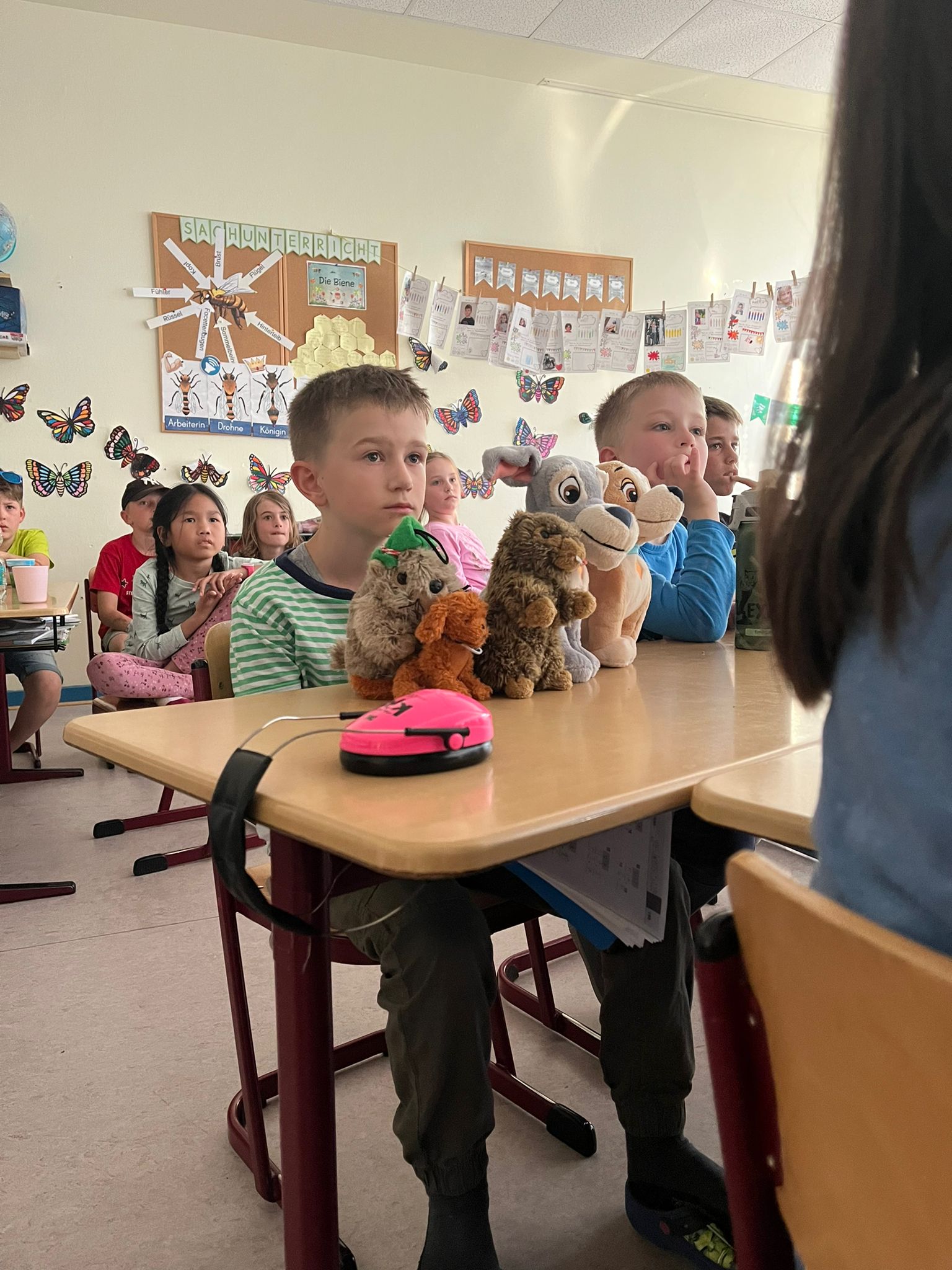 Schon konnte es losgehen. Alle Kinder trafen sich im Klassenzimmer der Klasse 1. Dort wartete ein ganz besonderer Gast auf sie: Illustratorin Catherina Baldauf, die zu dem Erfinderteam rund um Bücher von Luzie und Leone gehört. Lione ist ein junger Hund aus Frankreich, der in Koblenz sein neues Zuhause findet und sich gespannt auf den Weg macht, die Stadt kennenzulernen. Auf seiner Entdeckungstour trifft Lione dabei auf die kleine Altstadtmaus Luzie, in welcher Lione schnell eine neue Freundin findet und die ihm vieles über seine neue Heimat und deren Sehenswürdigkeiten erzählt und zeigt – genauer die Koblenzer Seilbahn und die Festung Ehrenbreitstein.