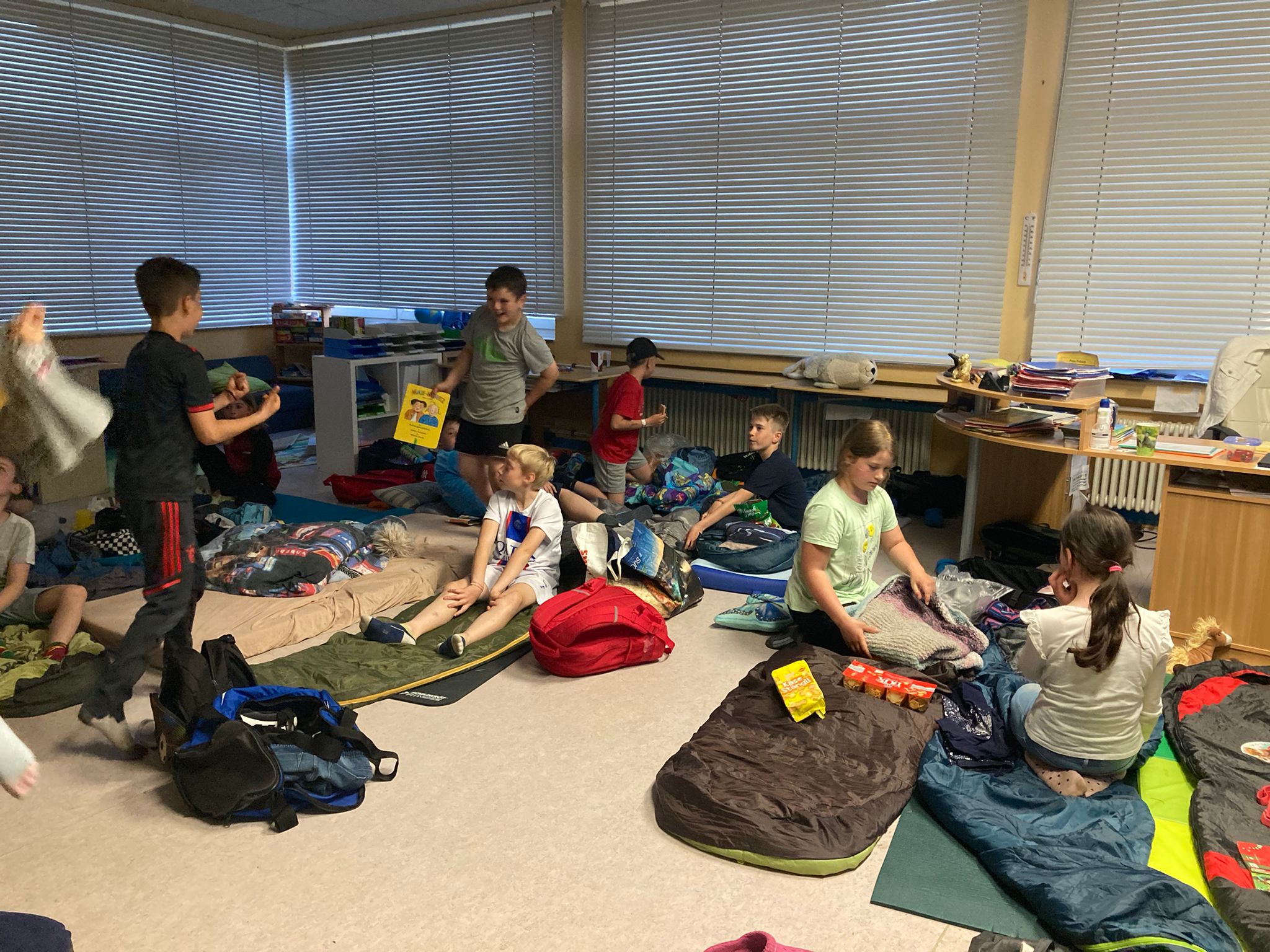 Für die Kinder der Klassen 2-4 der Grundschule Dachsenhausen hieß es am Donnerstagnachmittag, den 25.05.2023, Sachen packen und ab in die Schule. Ausgestattet mit Schlafsack, Isomatte, Kuscheltier und Lieblingsbuch freuten sich die Kinder auf ihre erste gemeinsame Lesenacht. Zu Beginn wurden mit Hilfe der Eltern die Schlafplätze für die Nacht hergerichtet – so verwandelten sich die Klassenzimmer blitzschnell zu gemütlichen Schlafgemächern.