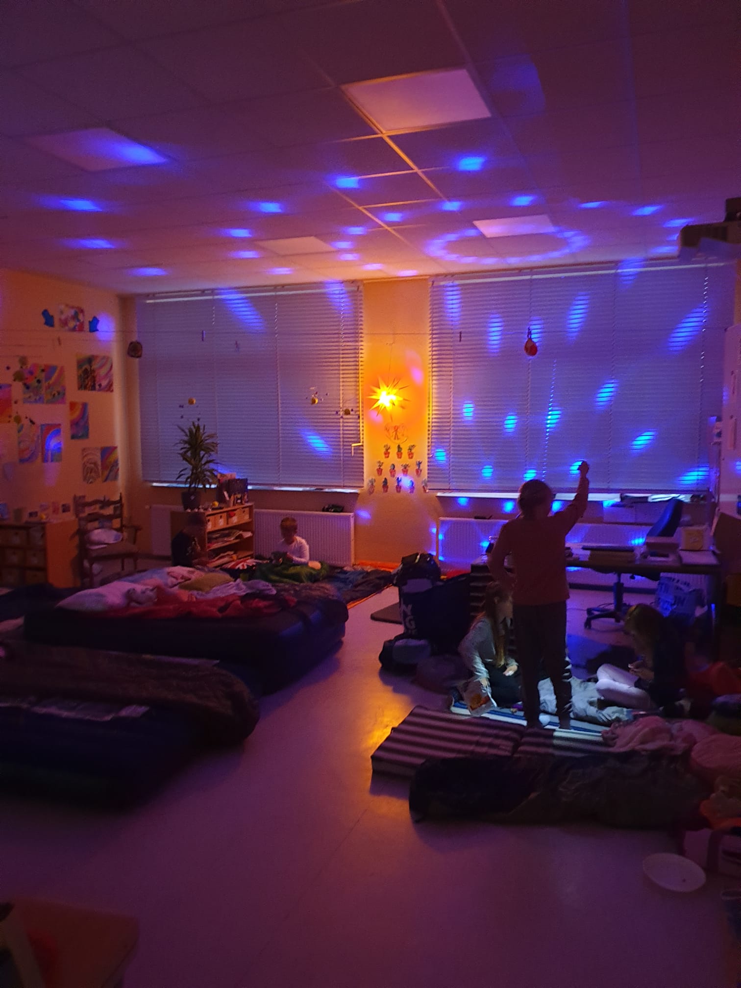 Nun durften sich alle bei leckerer Pizza im Klassenkino der Klasse 1 stärken. Gesättigt vom Abendessen verkrochen sich die Kinder nach und nach in ihre Schlafsäcke. Die Taschenlampen gingen an und es wurde fleißig gelesen, bis es irgendwann hieß: „Lichter aus“.