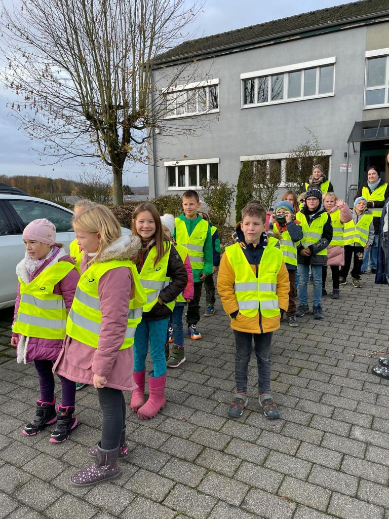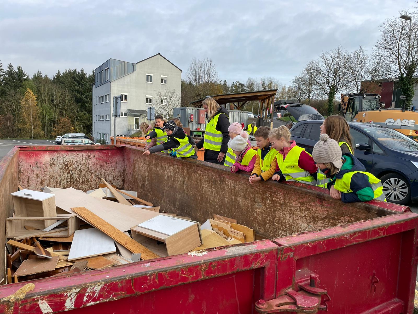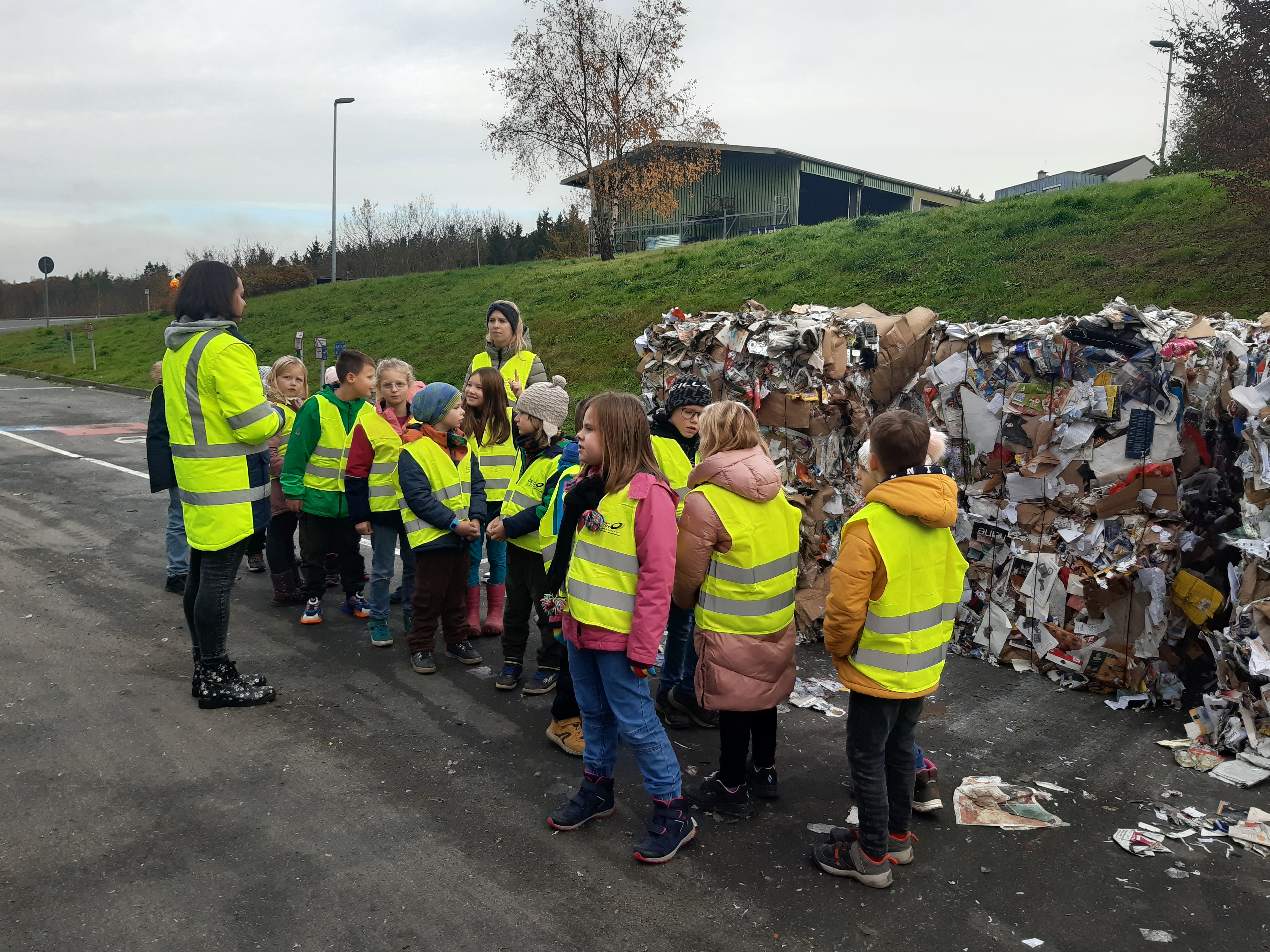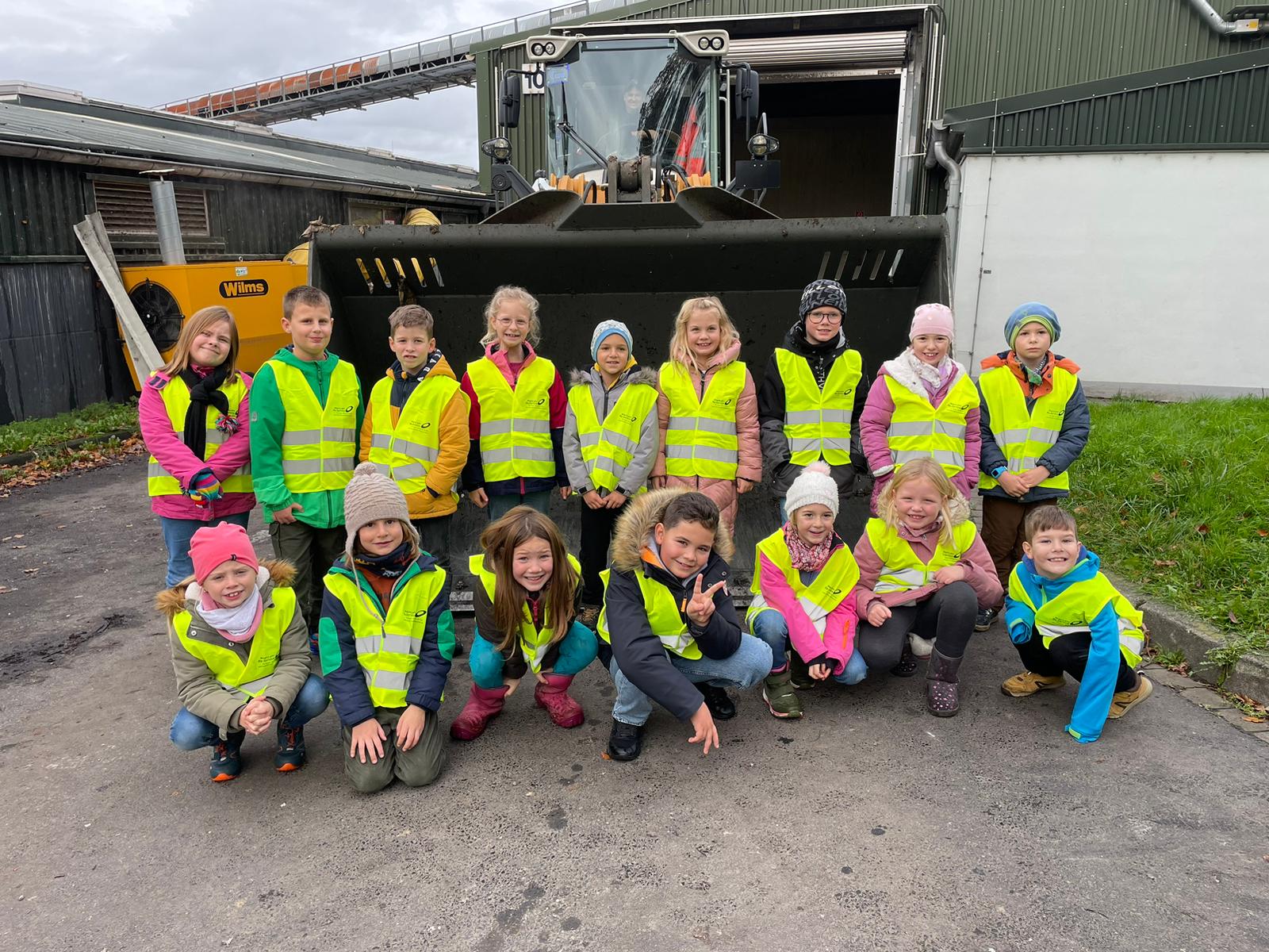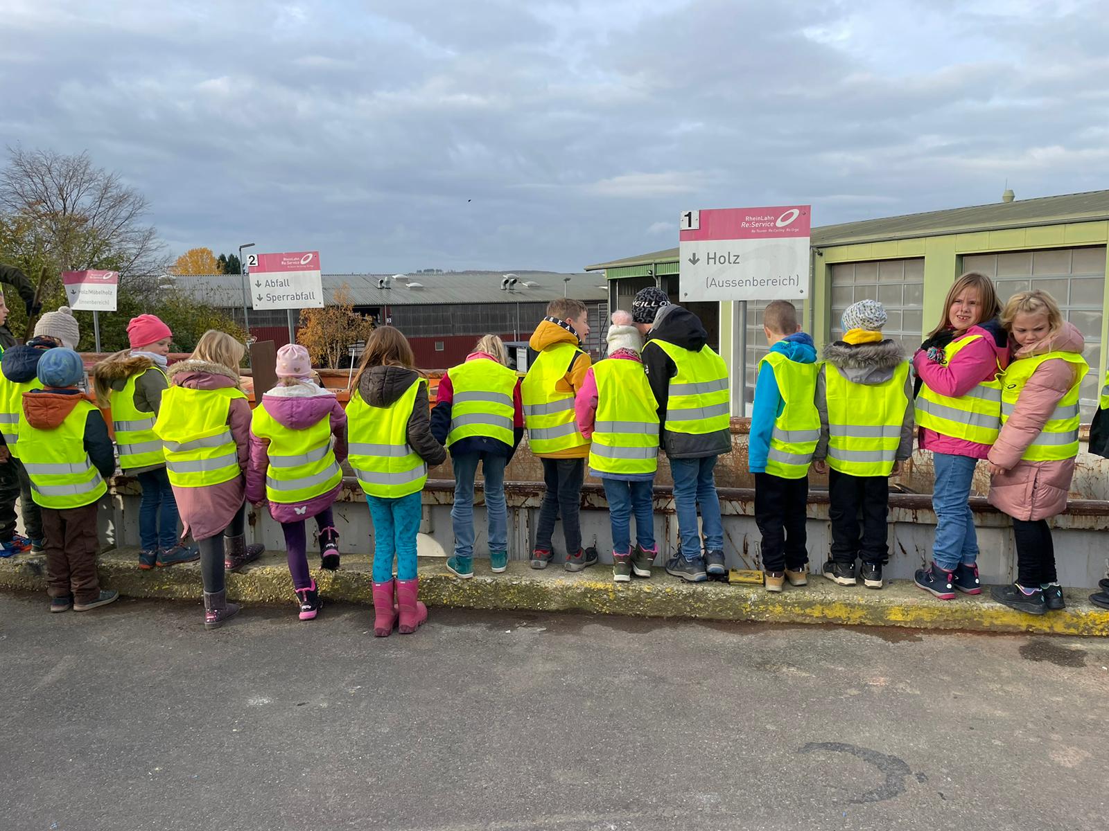 Was passiert eigentlich mit unserem Abfall, nachdem die Müllabfuhr ihn abgeholt hat? Und woher weiß die Müllabfuhr, was in welcher Tonne drinsteckt? Im Rahmen der Sachunterrichtseinheit zum Thema „Müll“ machte sich die zweite Klasse der Grundschule Dachsenhausen am 16.11.2023 auf den Weg zum Abfallwirtschaftszentrum nach Singhofen, um diesen Fragen auf den Grund zu gehen. Gemeinsam mit Frau Alexandra Meier, einer Mitarbeiterin des AWZ, und ausgestattet mit Warnwesten, konnten die Kinder das ganze Gelände unter die Lupe nehmen. Zunächst haben sie sich die verschiedenen Container mit Sperrmüll angeschaut und dabei viele Dinge entdeckt. Weiter ging es zur Halle, in der der Restmüll abgeladen und sortiert wird, bis hin zur Altpapierpresse. Viele große Päckchen aus Altpapier gab es hier zu bestaunen. Frau Meier erklärte, was mit den verschiedenen Stoffen nach der Lagerung passiert und warum die Mülltrennung so wichtig ist. Außerdem stellte sie sich allen Fragen der Schülerinnen und Schüler. Ein stechender Geruch stieß den Kindern am Sickerwasserbecken in die Nase. Ein riesengroßes Becken voller „Müllwasser“ war der Grund dafür. Ein besonderes Highlight wartete allerdings bei der Weiterverarbeitung des Restmülls auf die Kinder. Sie konnten einem nigelnagelneuen Radlader, der für den Transport des Mülls innerhalb der Anlage zuständig ist, hautnah bei der Arbeit zusehen. Aufgrund seiner Größe waren die Kinder besonders fasziniert. Dieser diente im Anschluss auch als Motiv für unser Gruppenfoto. Am Ende erhielten die Kinder noch ein kleines Geschenk in Form einer kleinen schwarzen Mülltonne, einem Armband und Gummibärchen.