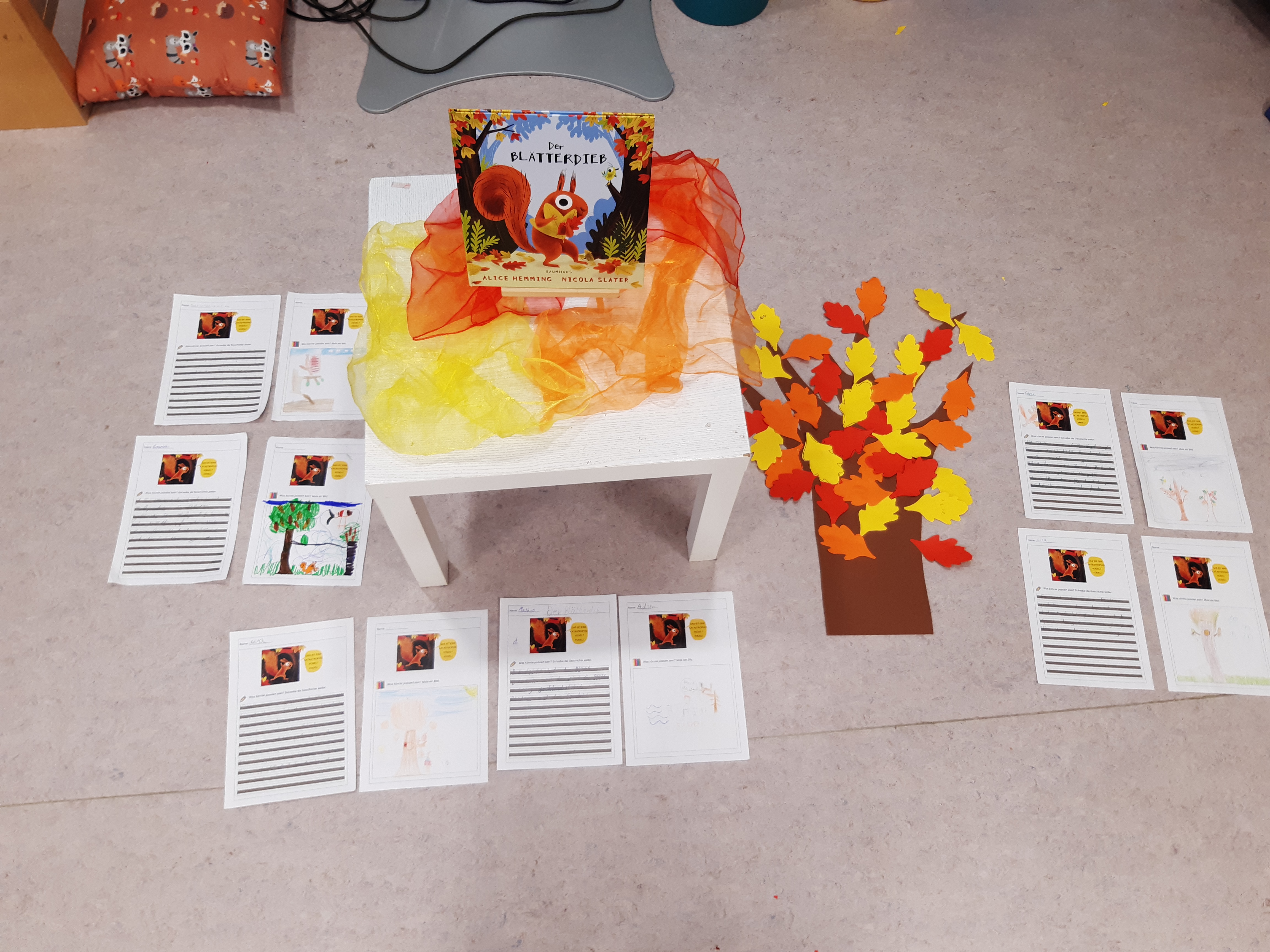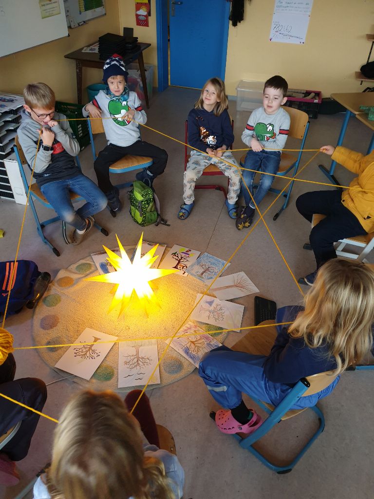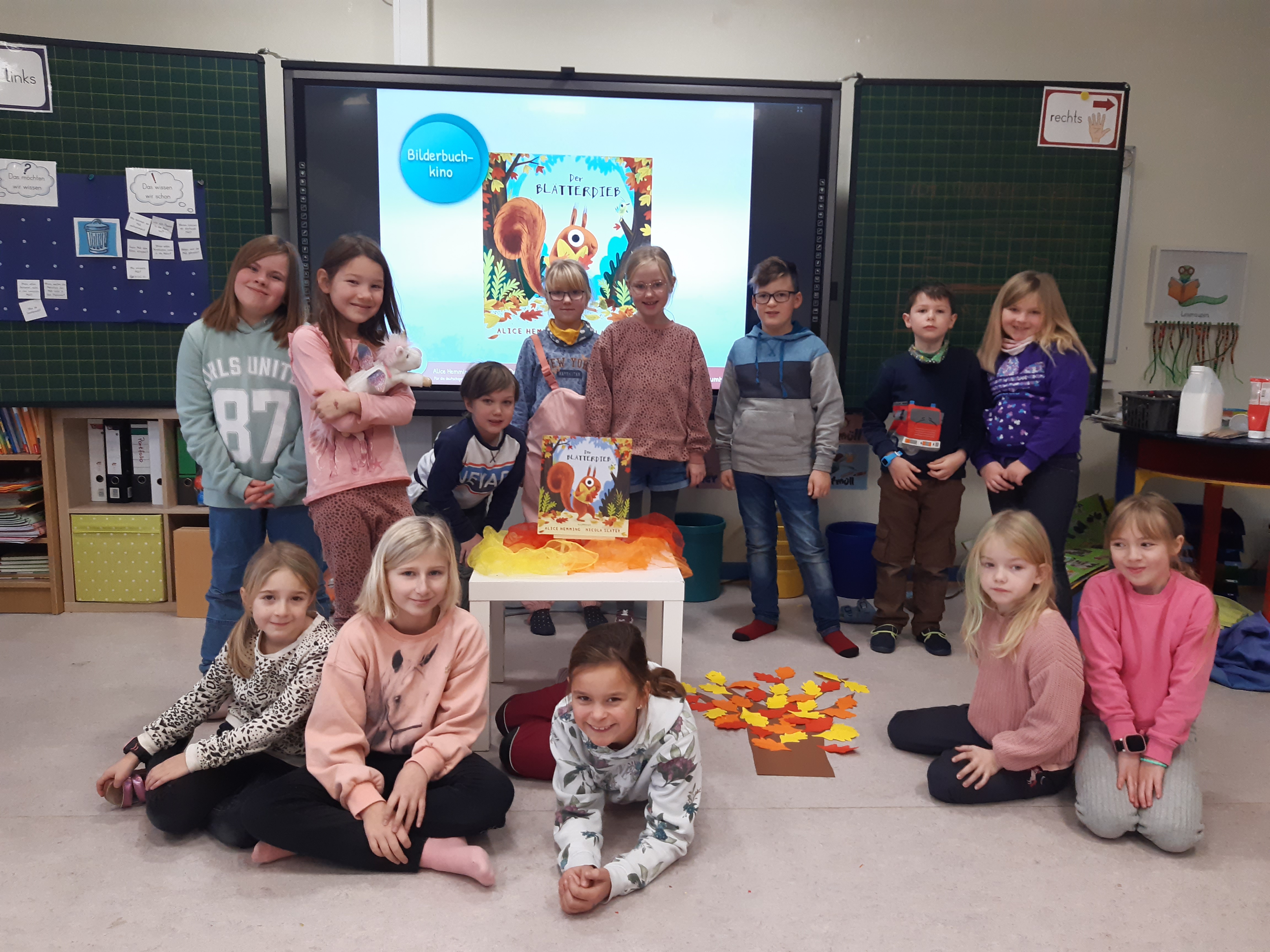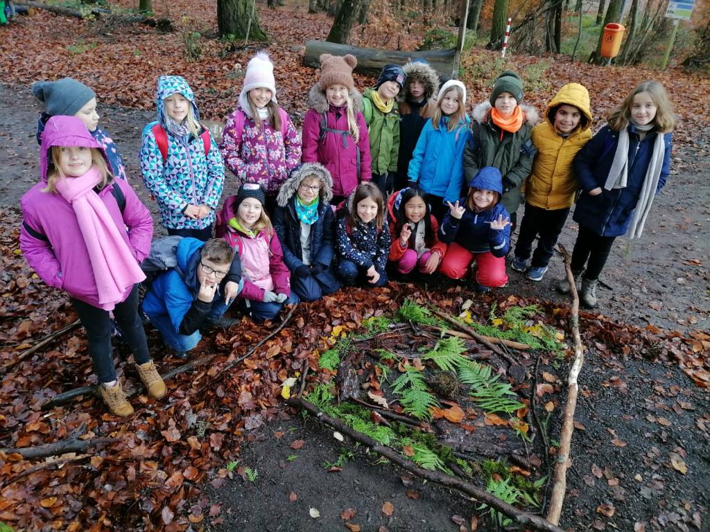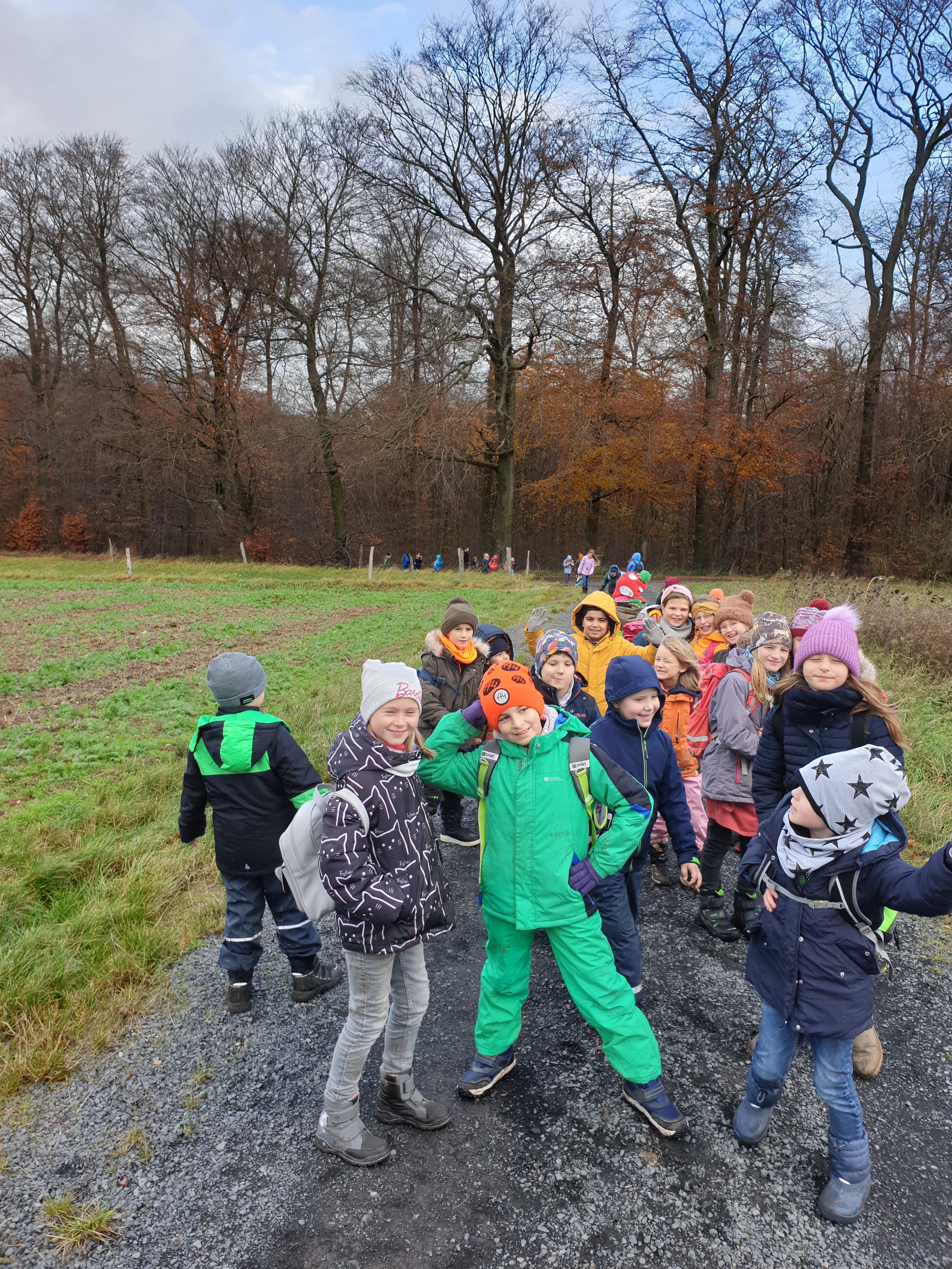 In Anlehnung an den bundesweiten Vorlesetag veranstaltete die Grundschule Dachsenhausen am 24.11.2023 einen Projekttag zum Thema Natur und Wald. In den ersten beiden Stunden stand das Vorlesen zur Förderung der Lesekultur im Fokus. Im Vorfeld durften die Kinder ganz nach ihrem Interesse zwischen 5 Büchern wählen. In jahrgangsübergreifenden Gruppen fanden sich die Kinder am Morgen zusammen und lauschten gespannt den verschiedenen Geschichten, die von den „Streithörnchen“, über „Robin Hood“, „Die Hüterin des Waldes“ und „Mein Baum“ zu „Der Blätterdieb“ reichten. Im Anschluss daran setzen sich die Schülerinnen und Schüler auf verschiedensten Weisen mit den Inhalten der Bücher auseinander. Nach einer ausgiebigen Frühstückspause machte man sich auf den Weg in den naheliegenden Wald. Dort konnten die Kinder an verschiedenen Stationen auf Entdeckungstour gehen. Die Kinder wurden zu Tippi- und Türmebauern und sammelten dafür fleißig Stöcke und Steine. Außerdem machten sie sich beim Spiel „Naturmemory“ auf die Suche nach Naturmaterialien. Ein besonderes Highlight war das Naturmandala, bei dem jede Klasse ihrer Kreativität freien Lauf lassen konnte, indem sie jeweils ein Stück eines abgesteckten Bereiches gestalteten. Am Ende entstand ein tolles Gemeinschaftsbild. An der Schule angekommen, wartete eine leckere Bratwurst zur Stärkung auf die Kinder. Ein großer Dank geht an unsere Grillmeisterinnen Frau Kohl und Frau Klein, an den SEB sowie an den Förderverein, der uns die Bratwürste spendierte.