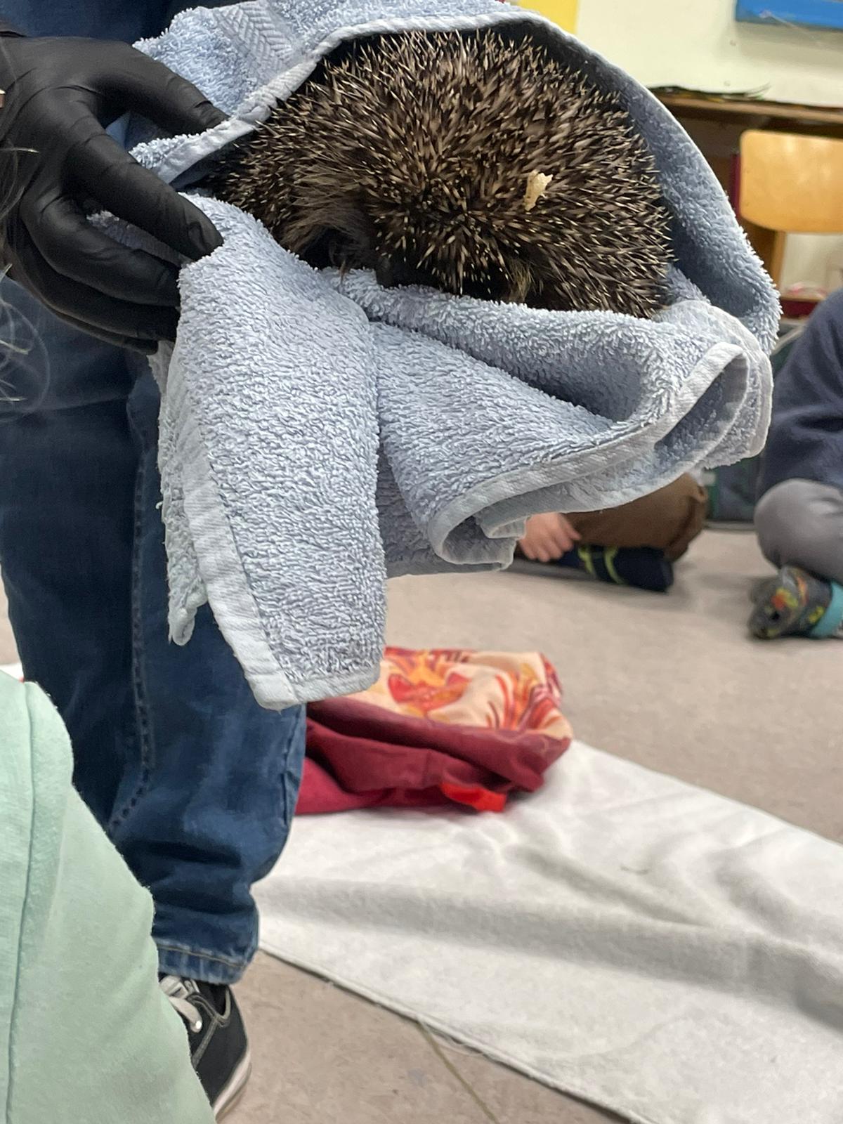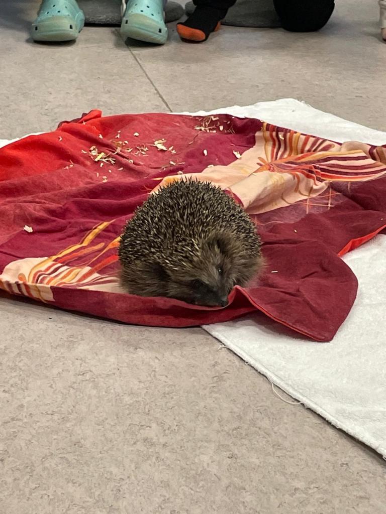Für viele Kinder war es die erste nahe Begegnung mit einem lebenden Igel. Dante aus nächster Nähe zu betrachten, war zweifellos das Highlight des Tages. Julia setzte ihn auf ein Handtuch in der Mitte des Kreises. Zunächst war er noch ängstlich und zu einer Kugel eingerollt. Doch schnell gewöhnte er sich an die Umgebung und schaute sich neugierig um. Zum Abschluss hob Julia Dante noch einmal hoch und ging nah an den Kindern vorbei, sodass sie den Igel nochmal genau betrachten konnten.