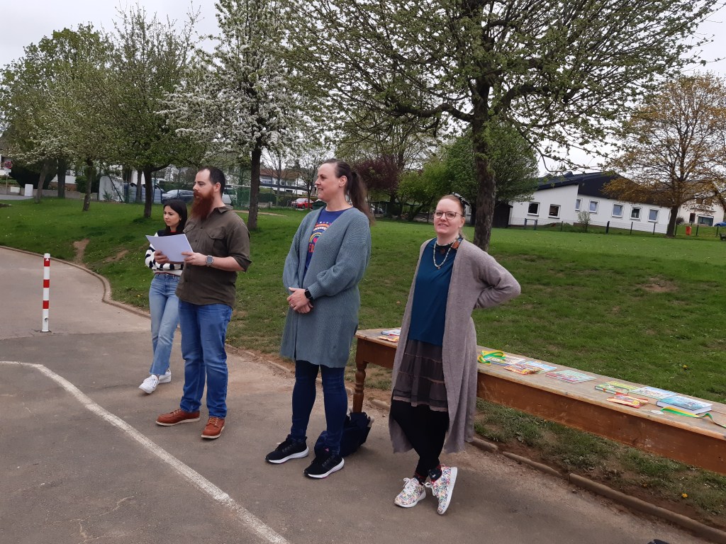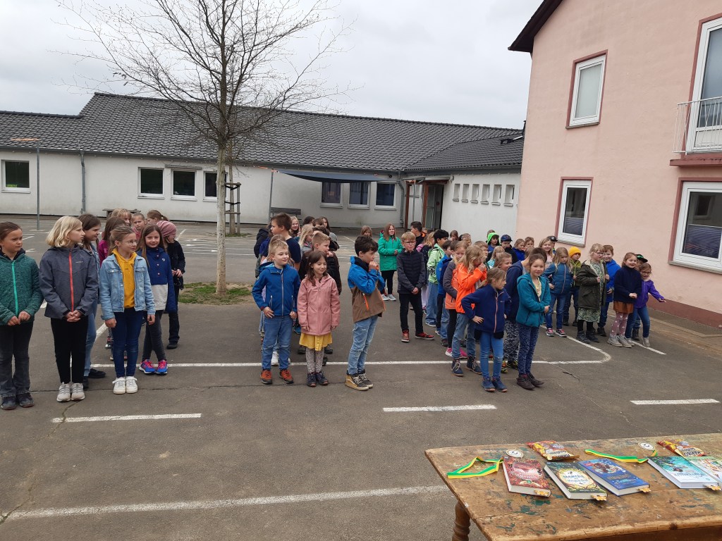 Die Jury vergab dabei Punkte und bestimmte die besten Vorleser der jeweiligen Klassenstufen. Nach einer kurzen Beratungspause der Jury kamen alle Schülerinnen und Schüler der Grundschule auf dem Schulhof der Schule zur großen Siegerehrung zusammen. Die Spannung stieg. Nun wurden die Sieger des Lesewettbewerbs verkündet.