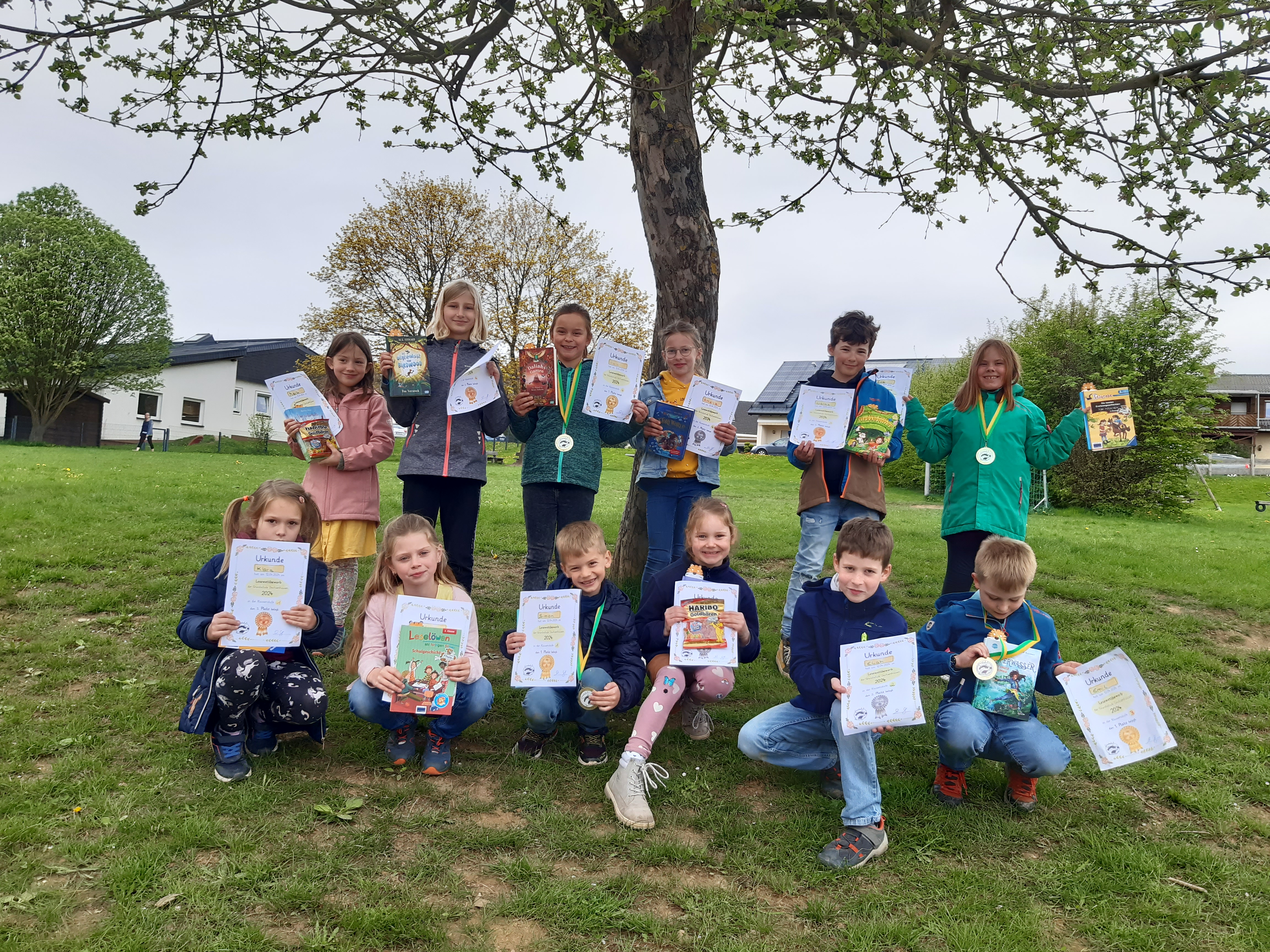 Die Jury vergab dabei Punkte und bestimmte die besten Vorleser der jeweiligen Klassenstufen. Nach einer kurzen Beratungspause der Jury kamen alle Schülerinnen und Schüler der Grundschule auf dem Schulhof der Schule zur großen Siegerehrung zusammen. Die Spannung stieg. Nun wurden die Sieger des Lesewettbewerbs verkündet.