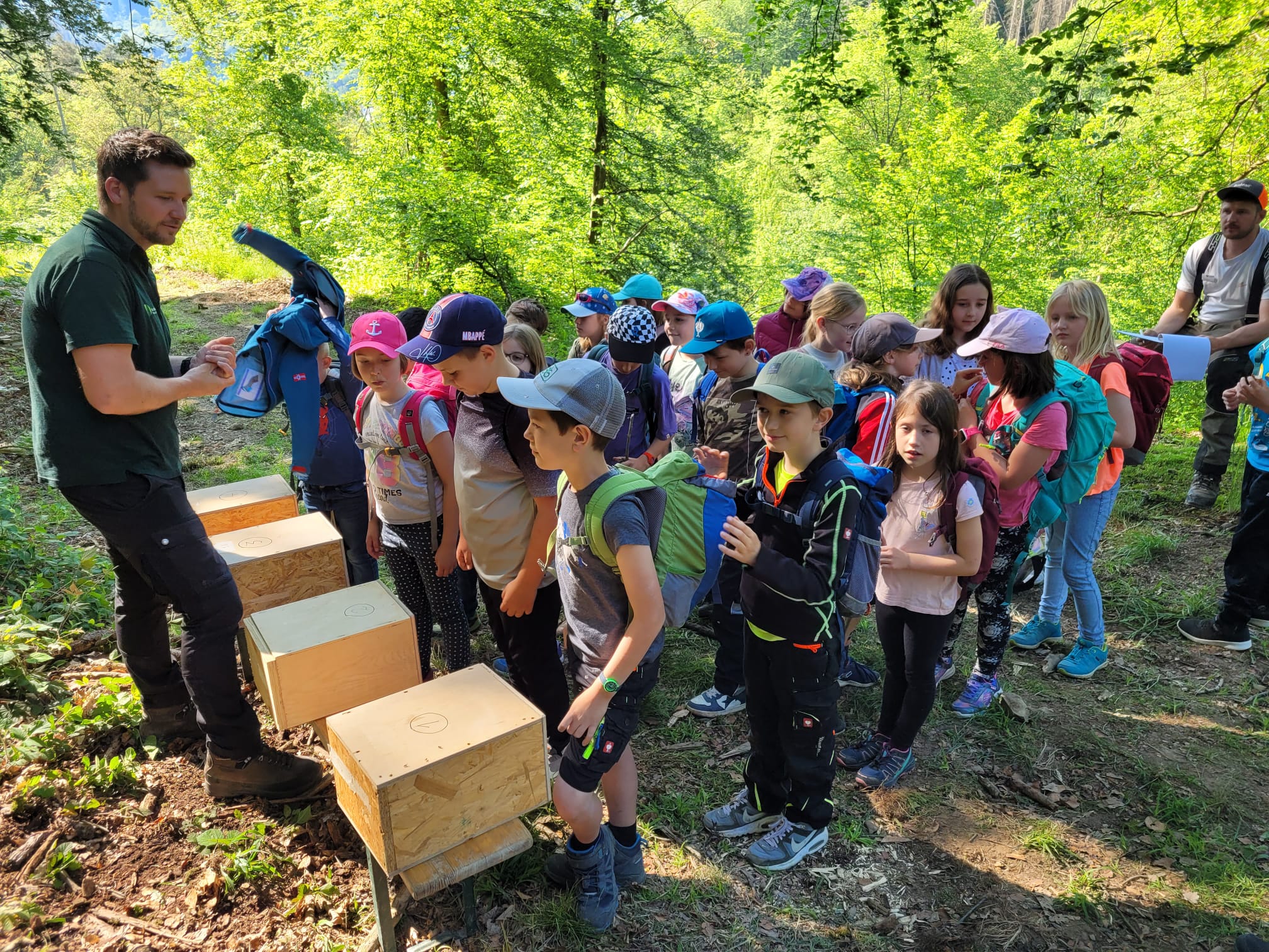 Bei strahlendem Sonnenschein ging es für die Schülerinnen und Schüler auf einen circa drei Kilometer langen Waldparcours mit 13 Stationen. Begleitet von Herrn von Glasow und Frau Igel sowie dem Patenförster Florian Becker mit seinem Hund Wilma gab es einige knifflige Aufgaben zu lösen, bei denen die Kinder ihr Wissen zum Thema Lebens- und Naturraum Wald und dessen Leistungen für den Klimaschutz, zur nachhaltigen Bewirtschaftung aber auch zu klimabedingten Herausforderungen unter Beweis stellen konnten. Die Kinder mussten dabei Baumarten bestimmen, Tiere am Waldrand suchen und deren Fährten erkennen sowie selbst einmal als Förster oder Försterin agieren und dafür sorgen, dass im Wald nicht mehr Bäume geerntet werden als auch nachwachsen.