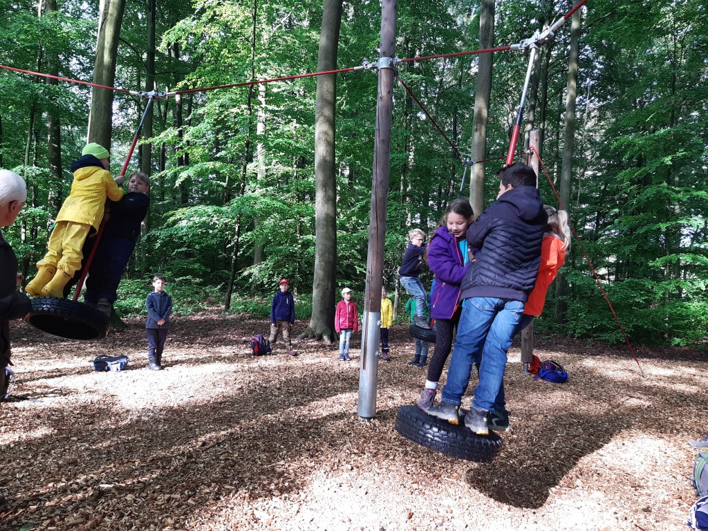 Begleitet wurden sie natürlich von Waldpädagogen Willi Bausch-Weiß, der sich wieder mal ein abwechslungsreiches Programm überlegt hatte. Darunter viele Balance- und Kletterspiele, bei denen die Kinder sich sehr auf sich und ihren Körper verlassen und Teamgeist beweisen mussten. Besonders viel Spaß hatten die Kinder auf der Pendelschaukel. Mit eines der Highlights war die Berg- und Taltreppe, die die Kinder mit verbundenen Augen herunterliefen sowie der Stelzenparcours.