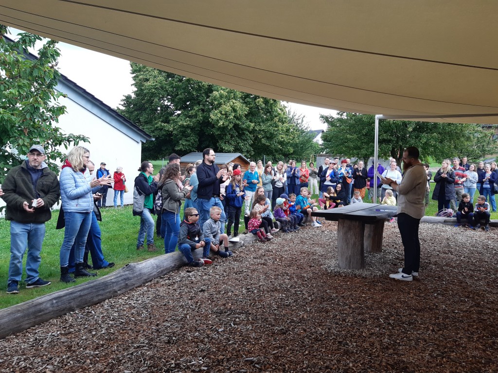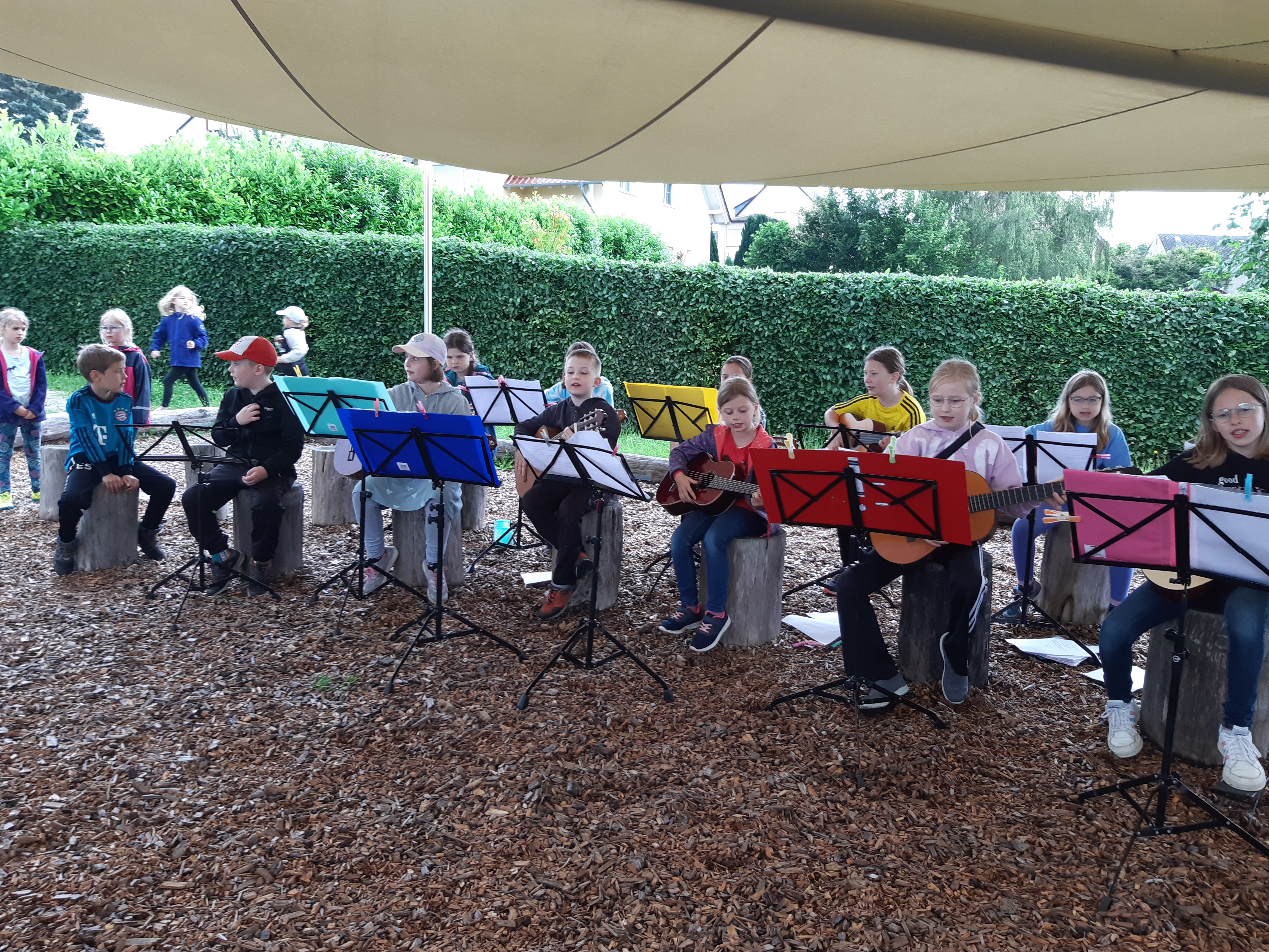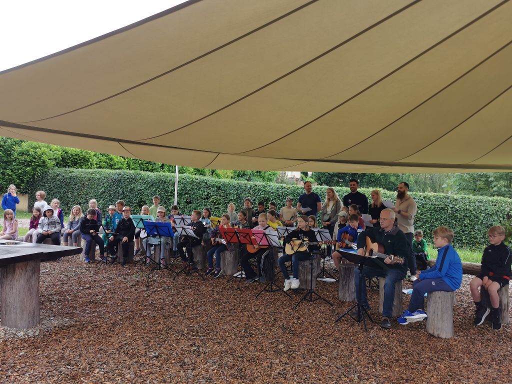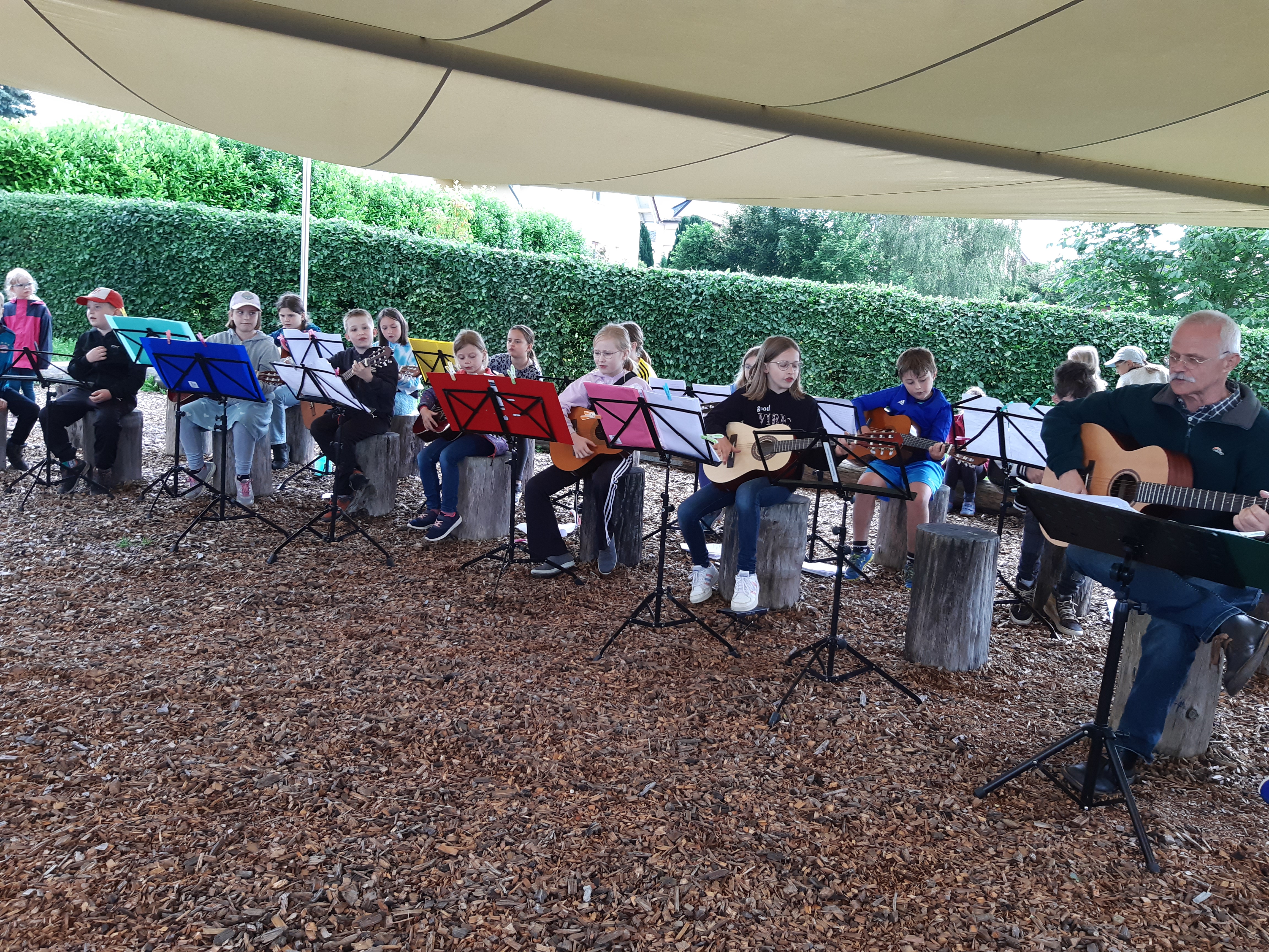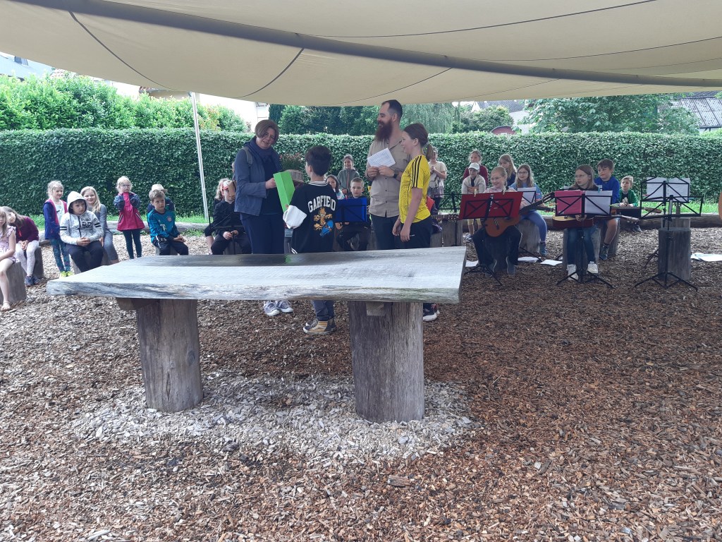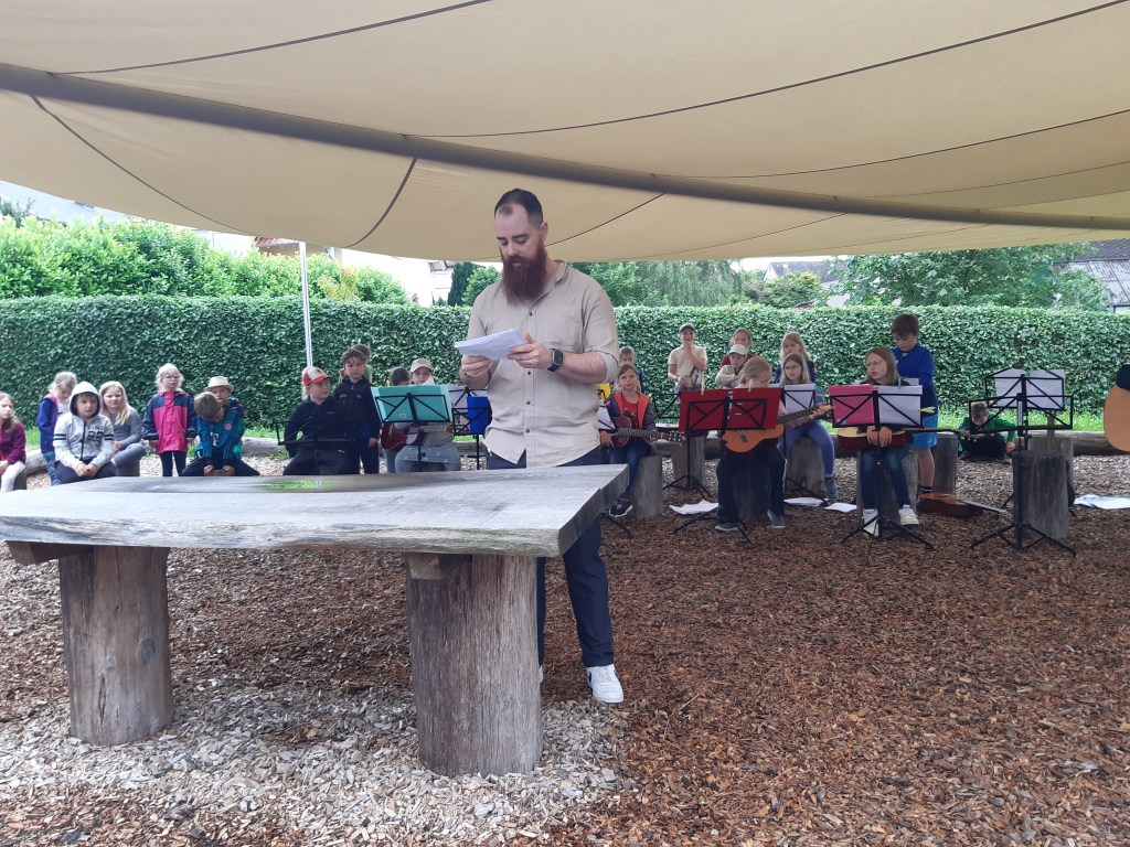 Im Anschluss daran wurde das Sonnensegel für das grüne Klassenzimmer feierlich eingeweiht und zu einem gemütlichen Beisammensein mit Kaffee und Kuchen eingeladen. Die musikalische Begleitung übernahm Helmut Knopp mit der Gitarren-AG der Grundschule Dachsenhausen. Schulleiter Patrick Bender begrüßte alle Anwesenden mit einer kleinen Rede und hieß Frau Cordula Simmons von der Else Schütz Stiftung, Herrn Sebastian Haupt, den neu gewählten und zukünftigen Ortsbürgermeister von Dachsenhausen, sowie den Beigeordneten Gottfried Göttert von der Verbandsgemeinde Loreley herzlich willkommen.