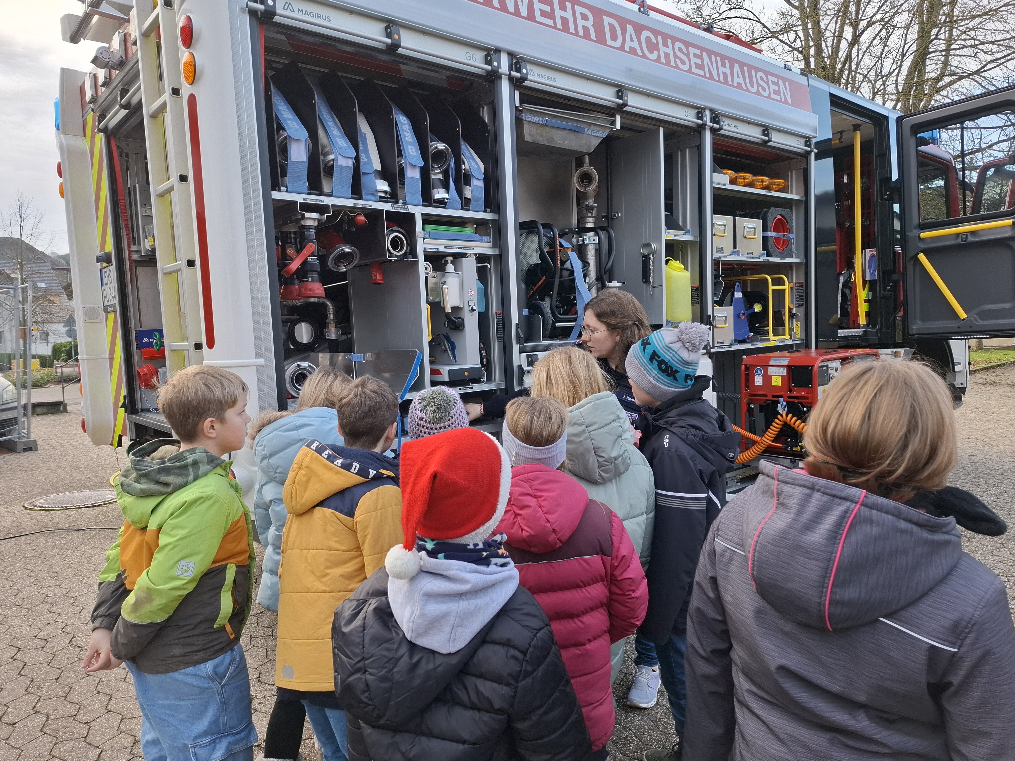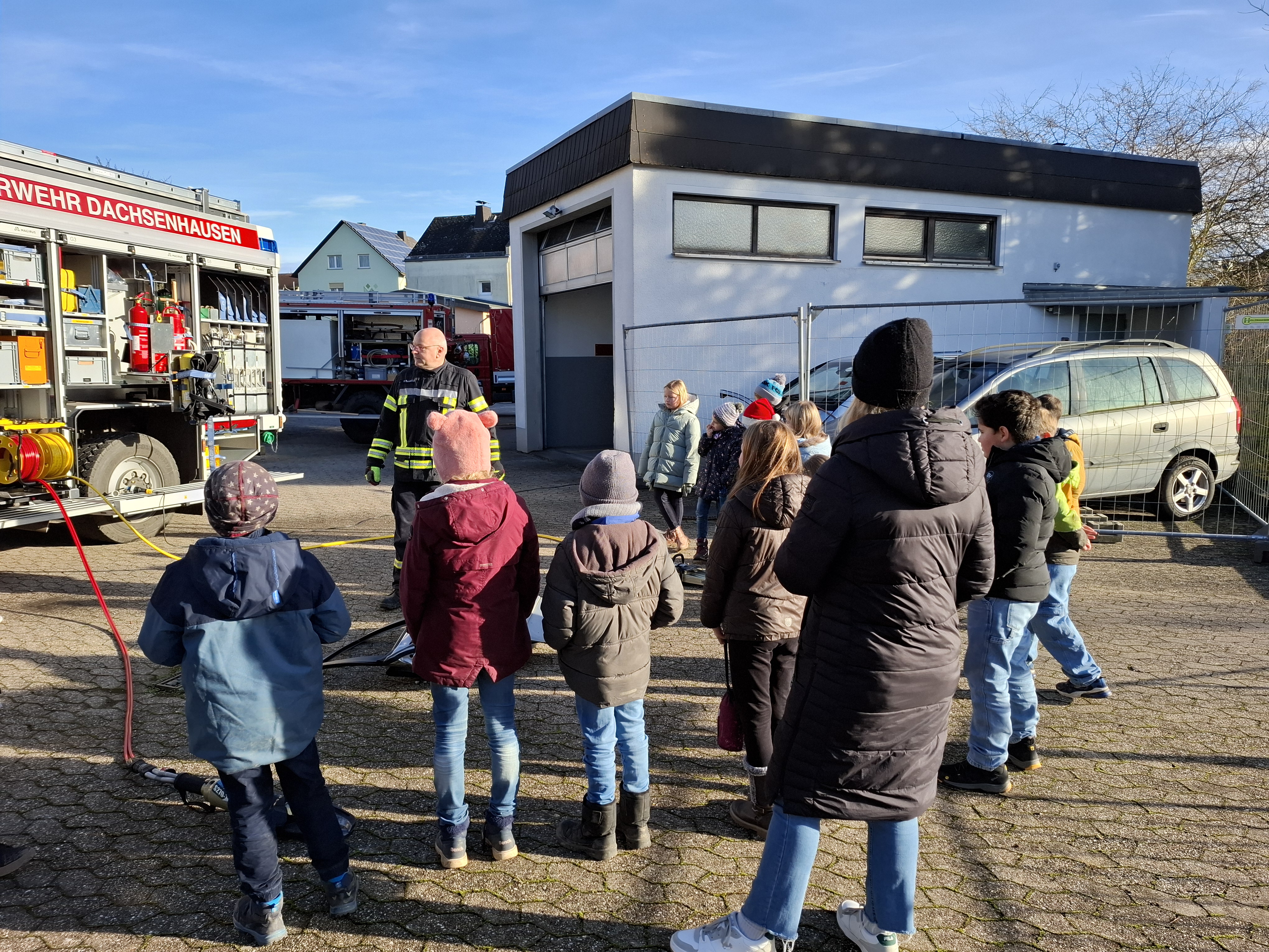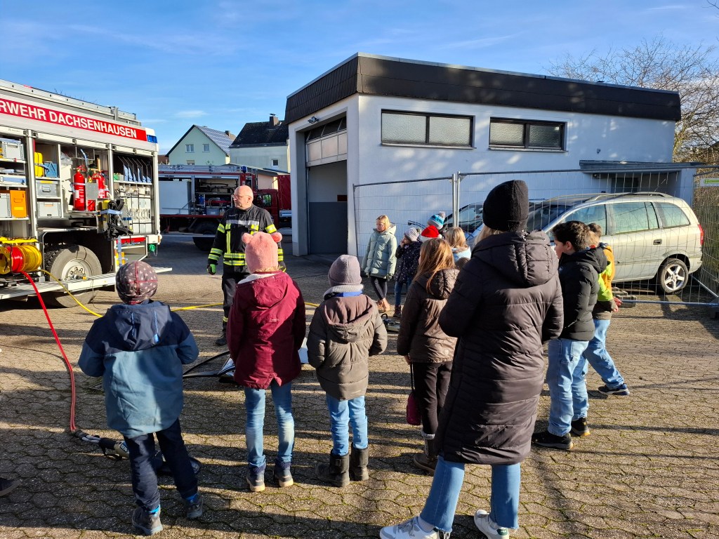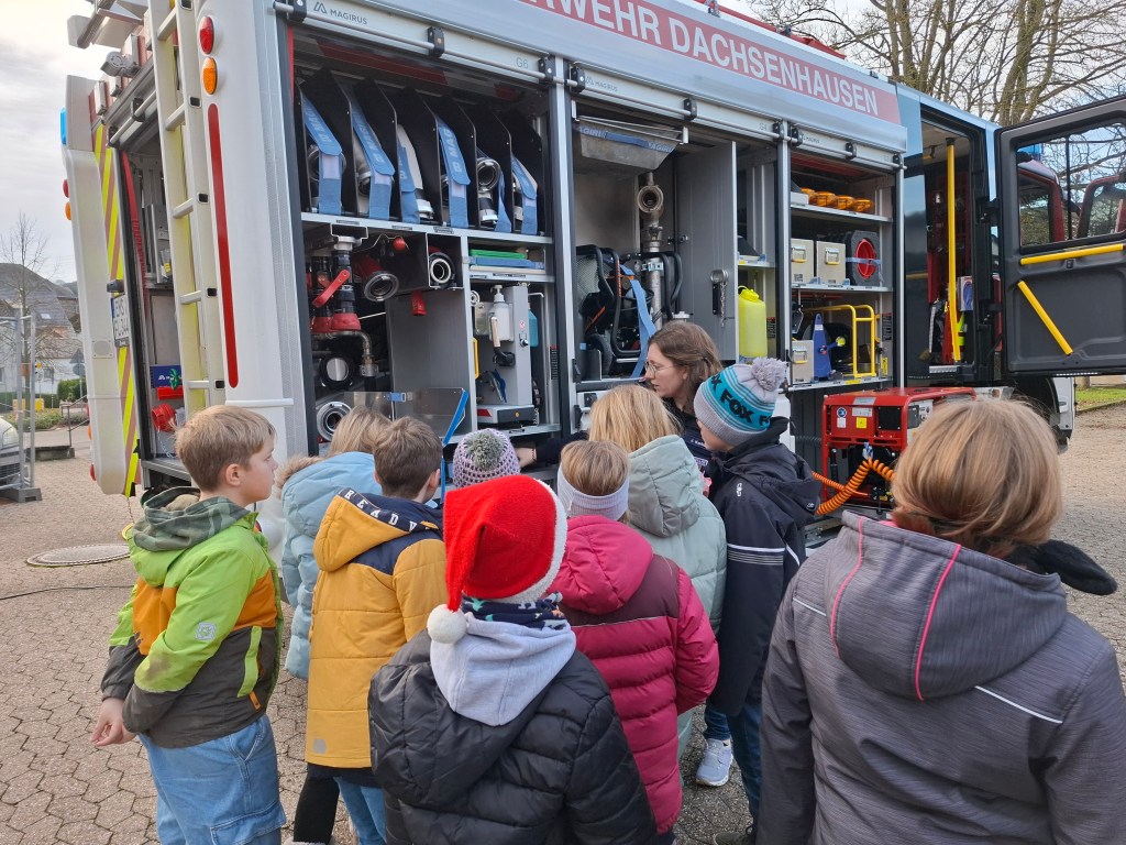Passend zum Unterrichtsthema Feuer und Feuerwehr besuchte die 3. Klasse der Grundschule Dachsenhausen am 18. Dezember die freiwillige Feuerwehr in Dachsenhausen. Von Feuerwehrfrau Jennifer Karbach und Feuerwehrmann Roger Gensmann erfuhren die Schülerinnen und Schüler viel Spannendes rund um die Feuerwehr. Auf dem Tisch des Gerätehauses fanden die Kinder allerlei Zubehör der Feuerwehr. In einem Gespräch, bei dem die Kinder mit ihrem Wissen aus dem Unterricht glänzen konnten, erfuhren sie noch viele weitere interessante Dinge rund um die Ausrüstung und das Feuer löschen. Nachdem es eine kleine Führung durch die Wache gab, konnten die Kinder die Fahrzeuge der Feuerwehr in Dachsenhausen erkunden. Sie fanden heraus, was in so einem großen Feuerwehrauto überhaupt alles seinen Platz hat, für was man es braucht und wie man damit umgeht. Natürlich durfte jedes Kind auch mal in das große Feuerwehrauto hineinklettern. Besonders spannend war die Vorführung der Schere und des Spalters an einer richtigen Autotür.