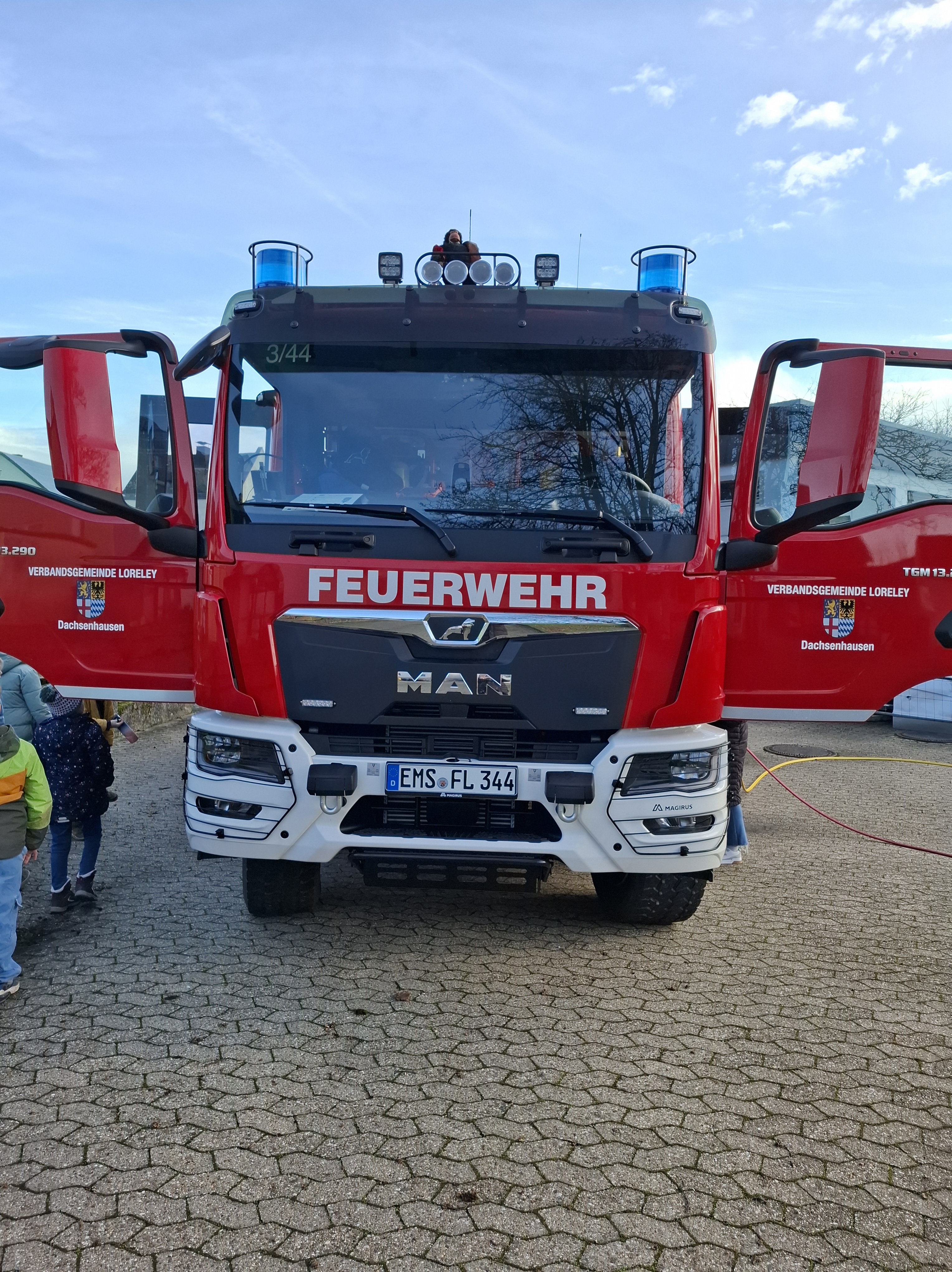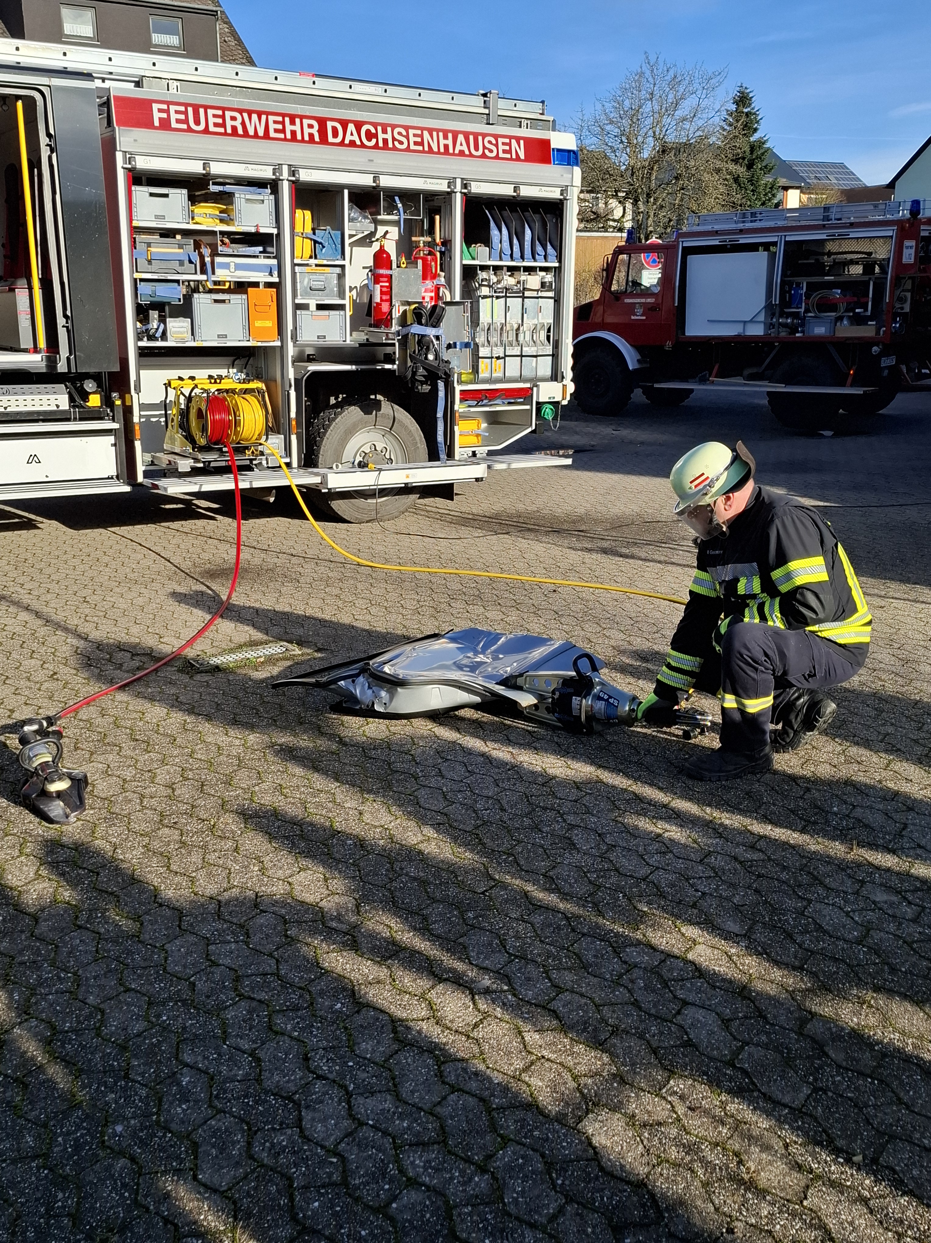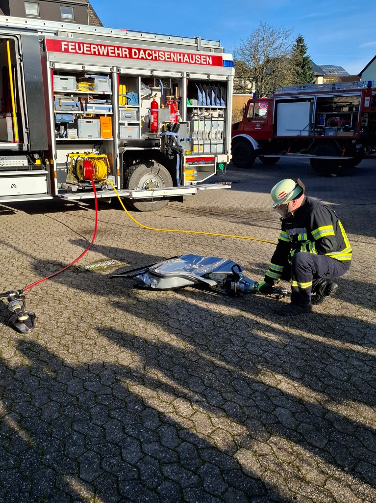Passend zum Unterrichtsthema Feuer und Feuerwehr besuchte die 3. Klasse der Grundschule Dachsenhausen am 18. Dezember die freiwillige Feuerwehr in Dachsenhausen. Von Feuerwehrfrau Jennifer Karbach und Feuerwehrmann Roger Gensmann erfuhren die Schülerinnen und Schüler viel Spannendes rund um die Feuerwehr. Auf dem Tisch des Gerätehauses fanden die Kinder allerlei Zubehör der Feuerwehr. In einem Gespräch, bei dem die Kinder mit ihrem Wissen aus dem Unterricht glänzen konnten, erfuhren sie noch viele weitere interessante Dinge rund um die Ausrüstung und das Feuer löschen. Nachdem es eine kleine Führung durch die Wache gab, konnten die Kinder die Fahrzeuge der Feuerwehr in Dachsenhausen erkunden. Sie fanden heraus, was in so einem großen Feuerwehrauto überhaupt alles seinen Platz hat, für was man es braucht und wie man damit umgeht. Natürlich durfte jedes Kind auch mal in das große Feuerwehrauto hineinklettern. Besonders spannend war die Vorführung der Schere und des Spalters an einer richtigen Autotür.