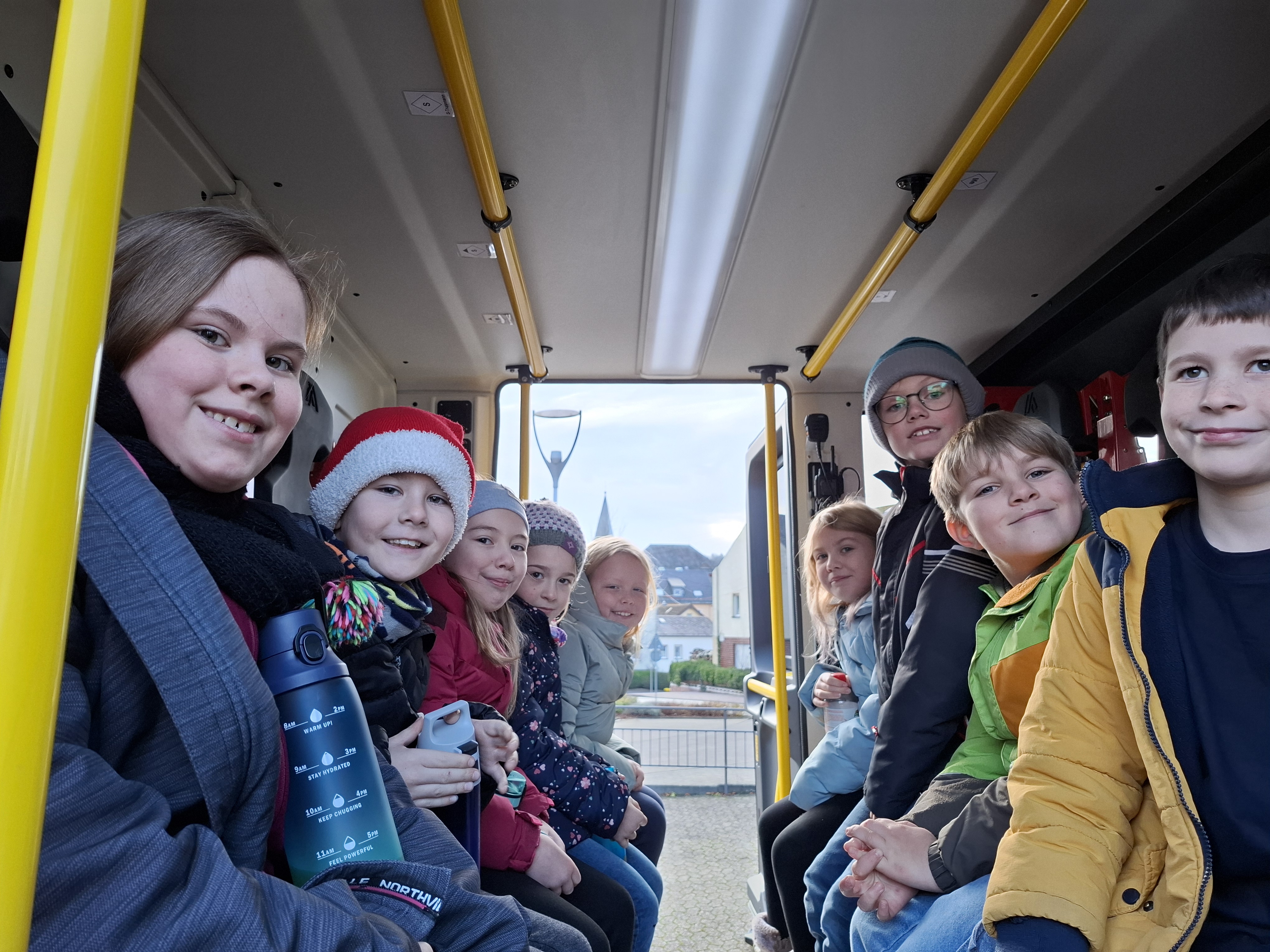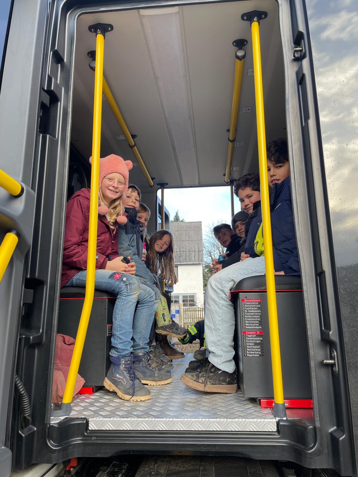 Das Highlight des Tages war zweifellos die Fahrt im Feuerwehrauto. Mit großen Augen und breitem Grinsen auf den Gesichtern durften die Kinder Platz nehmen und erlebten eine kurze, aber aufregende Fahrt zurück zur Schule.