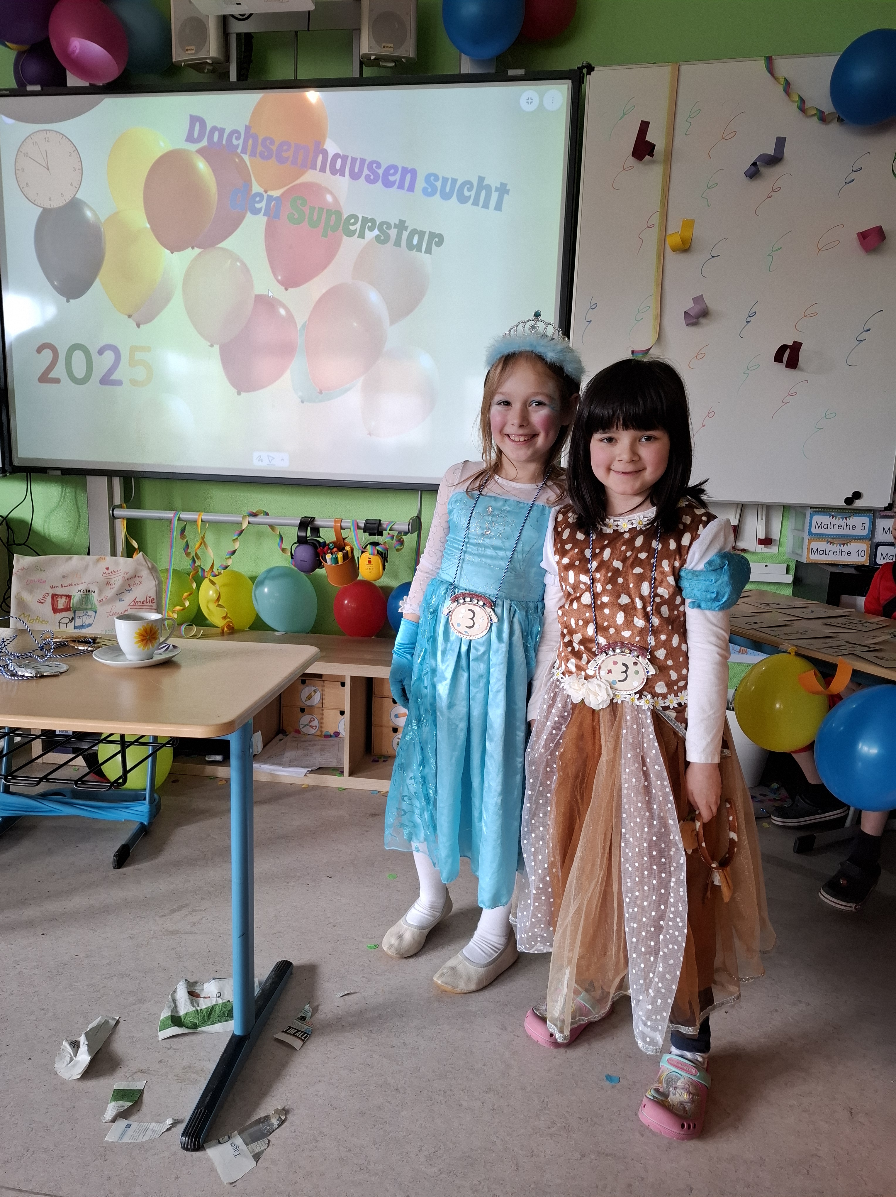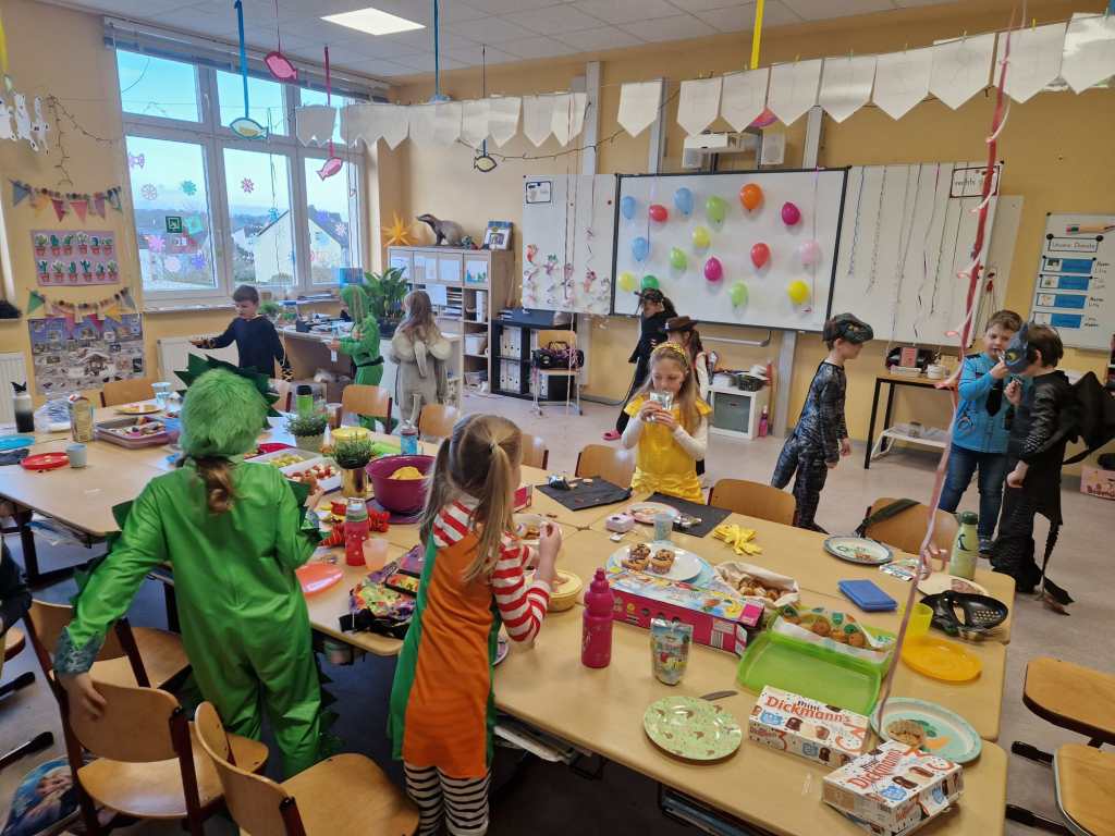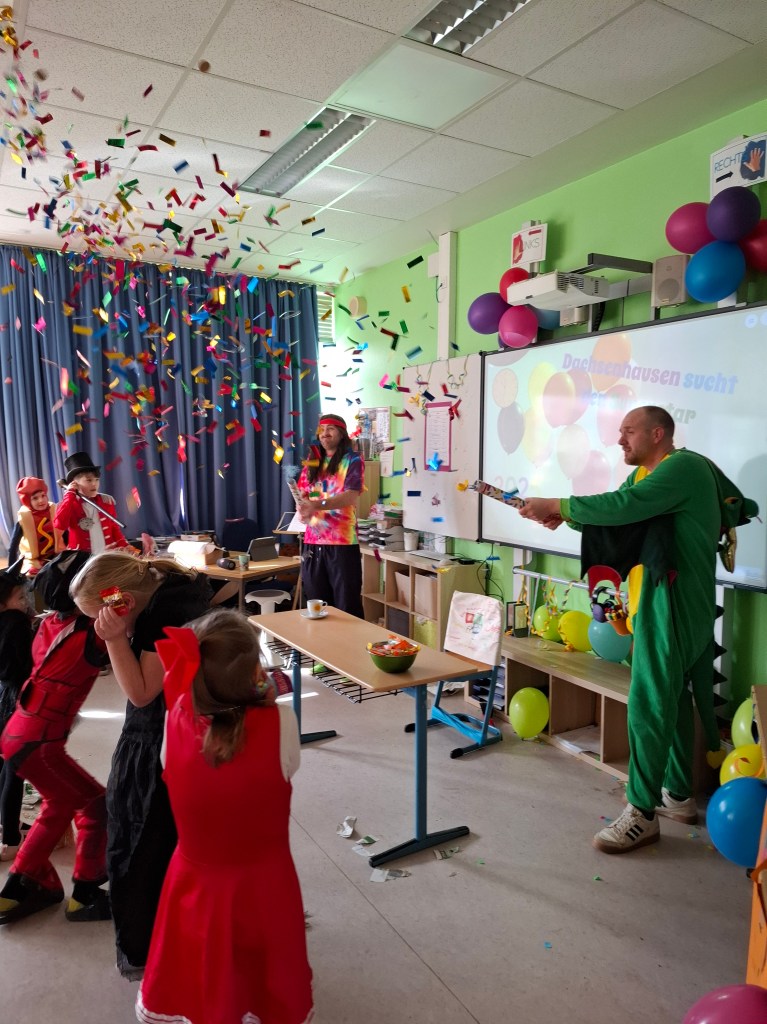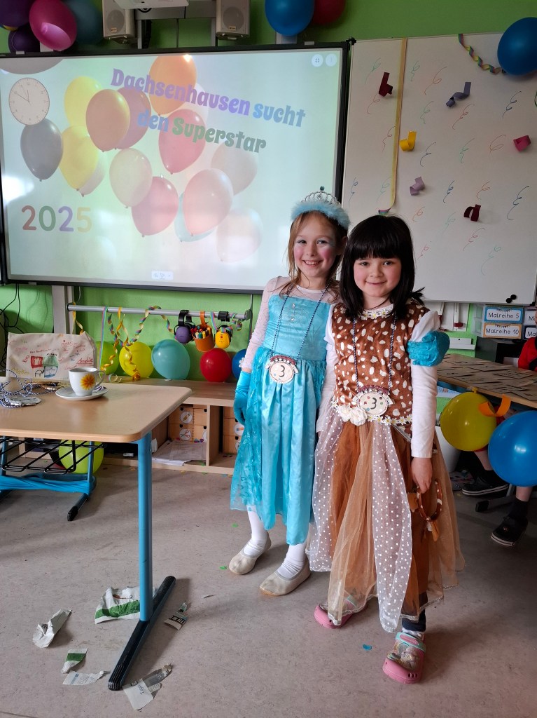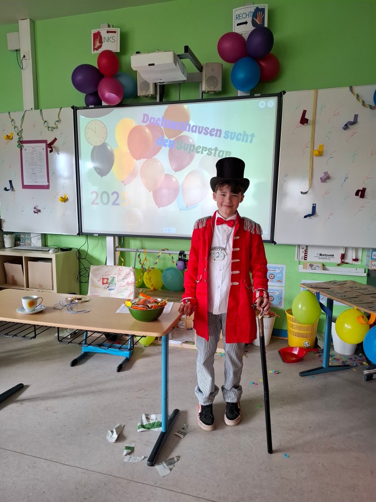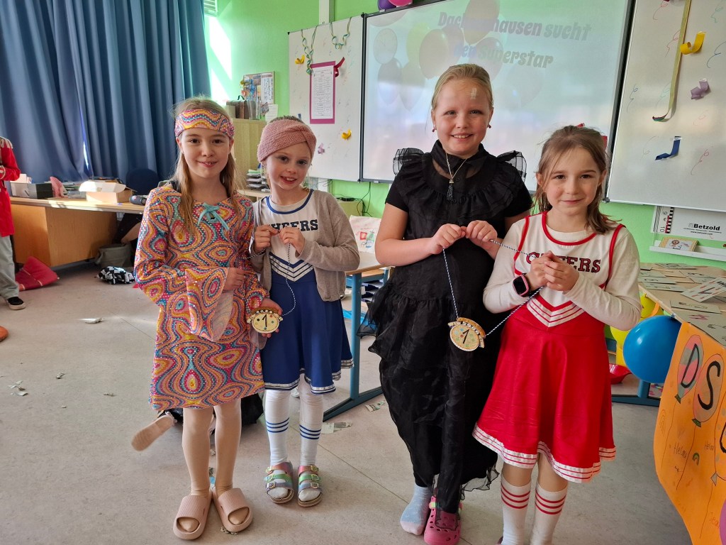 Am Donnerstag, den 27.02.2025, verwandelte sich die Grundschule Dachsenhausen in ein kunterbuntes Karnevalsparadies. Rund 84 fröhliche Kinder feierten gemeinsam die alljährlich stattfindende Karnevalsparty. An Kostümen gab es all das, was das närrische Herz erfreut: Von glitzernden Disneyfiguren, über megacoole Superhelden bis hin zu lustigen Tieren. Die Stimmung war grandios. Es wurde gesungen, getanzt und sehr viel gelacht. Natürlich kam auch das leibliche Wohl nicht zu kurz – in jeder Klasse gab es ein großes Buffet mit allerhand leckeren Sachen. Vielen Dank an die Eltern für dieses tolle Frühstück.Das Highlight der Karnevalsparty war natürlich die Show „Dachsenhausen sucht den Superstar“. Dabei rockten die Kids mit ihren Auftritten die Bühne, bei denen selbst die größten Popstars neidisch geworden wären. Auf dem Programm standen Tänze, Witze, Seilspringen, Hula-Hoop, Pantomime, eine Zaubershow und eine Büttenrede. Bewertet wurden sie dabei von einer Jury, die jeweils aus einem Kind von Klasse 1-4 bestand.Am Ende belegten Anna-Lena, Mila, Fränzi und Leni aus Klasse 3 mit ihrer Tanzdarbietung den ersten Platz, dicht gefolgt von Niklas aus Klasse 4 mit seiner einzigartigen Büttenrede. Auf Platz 3 schafften es Klara und Charlottte aus Klasse 2, ebenfalls mit einer Tanzdarbietung.Mit einem 3x Dachsenhausen Helau endete der karnevalistische Schultag und die Schülerinnen und Schüler der Grundschule Dachsenhausen wurden ins närrische Wochenende entlassen.