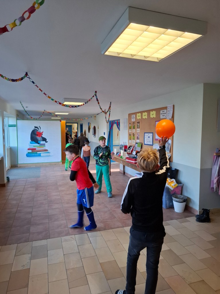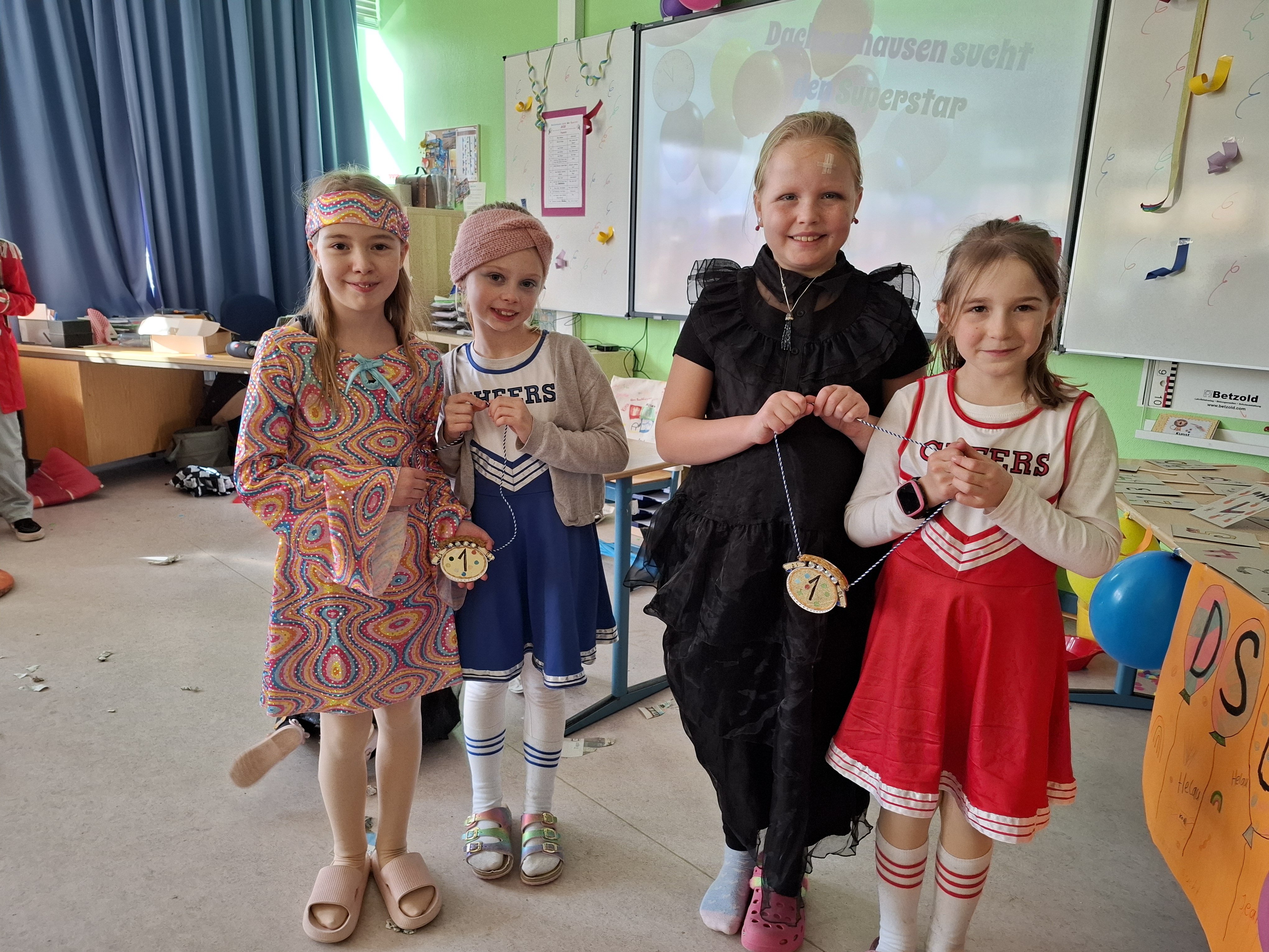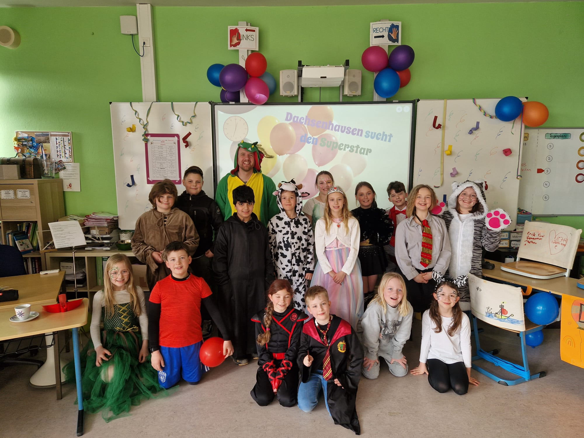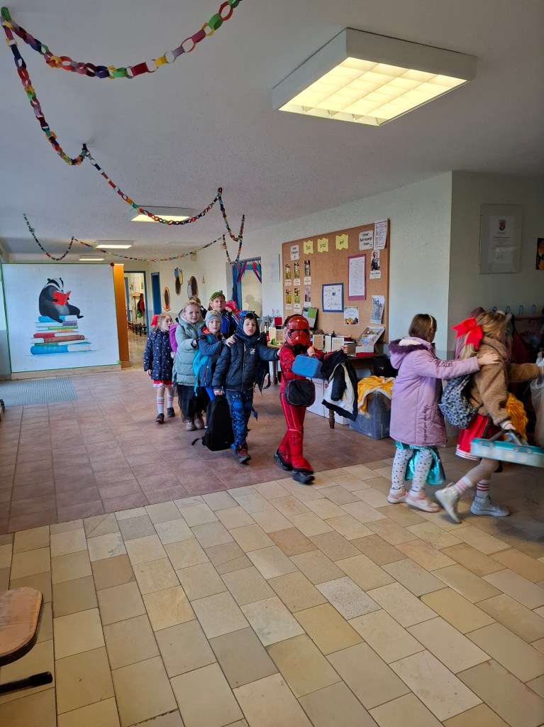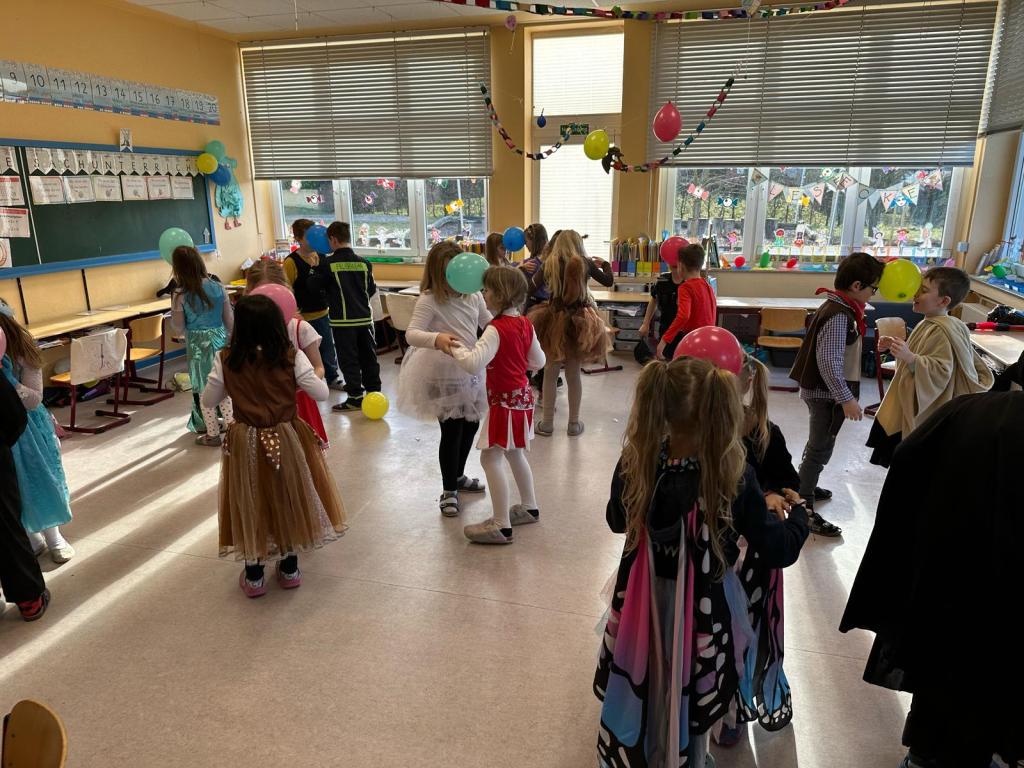Am Donnerstag, den 27.02.2025, verwandelte sich die Grundschule Dachsenhausen in ein kunterbuntes Karnevalsparadies. Rund 84 fröhliche Kinder feierten gemeinsam die alljährlich stattfindende Karnevalsparty. An Kostümen gab es all das, was das närrische Herz erfreut: Von glitzernden Disneyfiguren, über megacoole Superhelden bis hin zu lustigen Tieren. Die Stimmung war grandios. Es wurde gesungen, getanzt und sehr viel gelacht. Natürlich kam auch das leibliche Wohl nicht zu kurz – in jeder Klasse gab es ein großes Buffet mit allerhand leckeren Sachen. Vielen Dank an die Eltern für dieses tolle Frühstück.Das Highlight der Karnevalsparty war natürlich die Show „Dachsenhausen sucht den Superstar“. Dabei rockten die Kids mit ihren Auftritten die Bühne, bei denen selbst die größten Popstars neidisch geworden wären. Auf dem Programm standen Tänze, Witze, Seilspringen, Hula-Hoop, Pantomime, eine Zaubershow und eine Büttenrede. Bewertet wurden sie dabei von einer Jury, die jeweils aus einem Kind von Klasse 1-4 bestand.Am Ende belegten Anna-Lena, Mila, Fränzi und Leni aus Klasse 3 mit ihrer Tanzdarbietung den ersten Platz, dicht gefolgt von Niklas aus Klasse 4 mit seiner einzigartigen Büttenrede. Auf Platz 3 schafften es Klara und Charlottte aus Klasse 2, ebenfalls mit einer Tanzdarbietung.Mit einem 3x Dachsenhausen Helau endete der karnevalistische Schultag und die Schülerinnen und Schüler der Grundschule Dachsenhausen wurden ins närrische Wochenende entlassen.