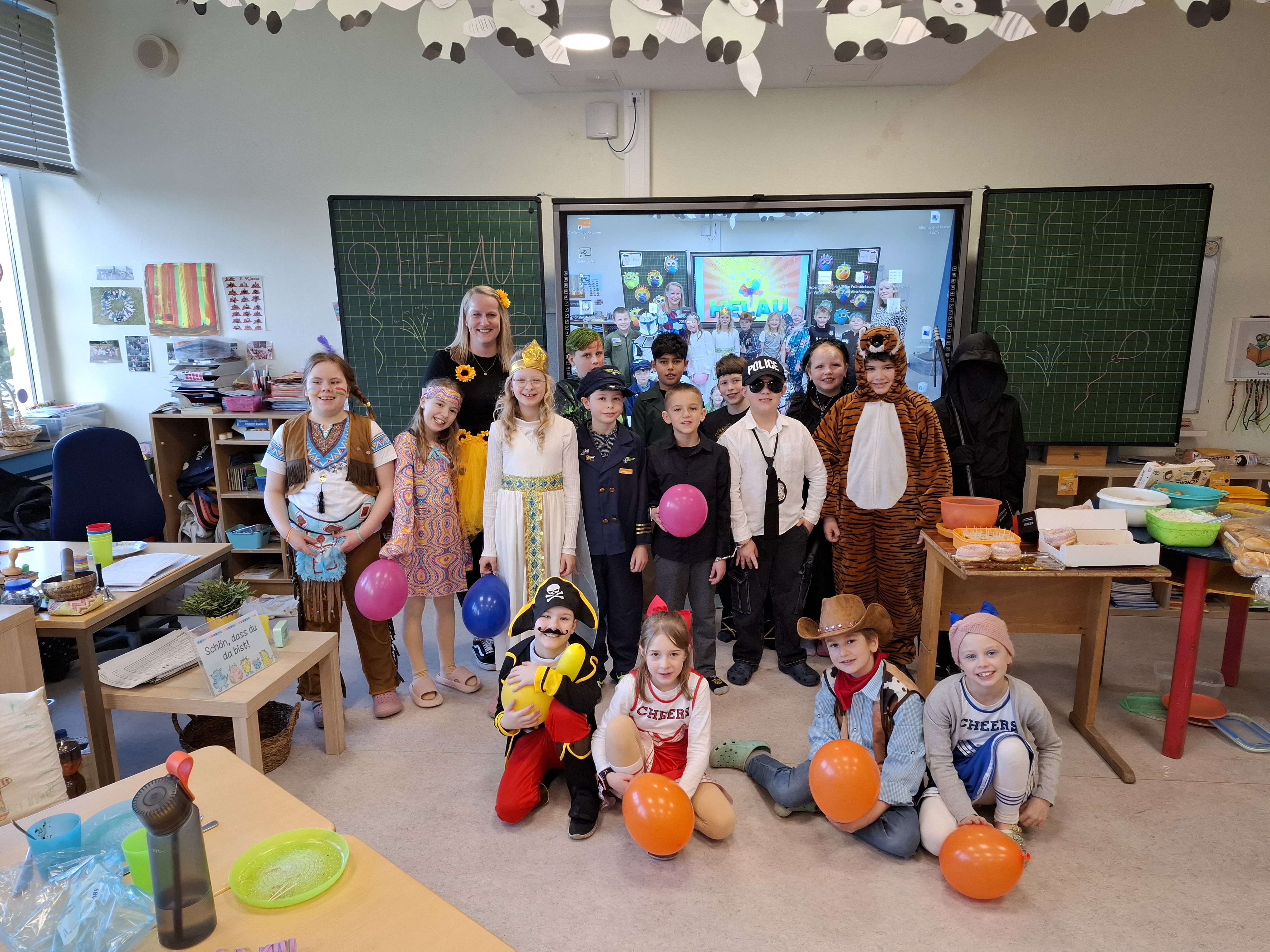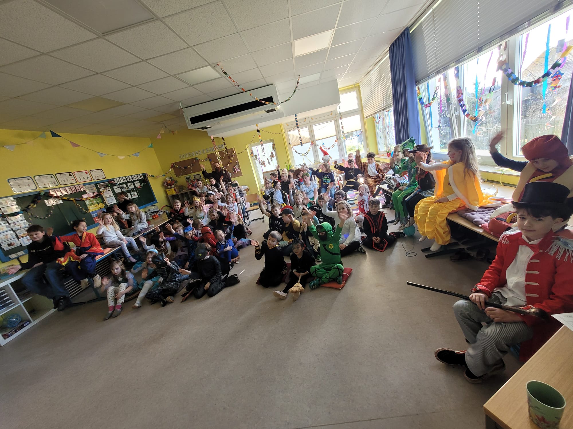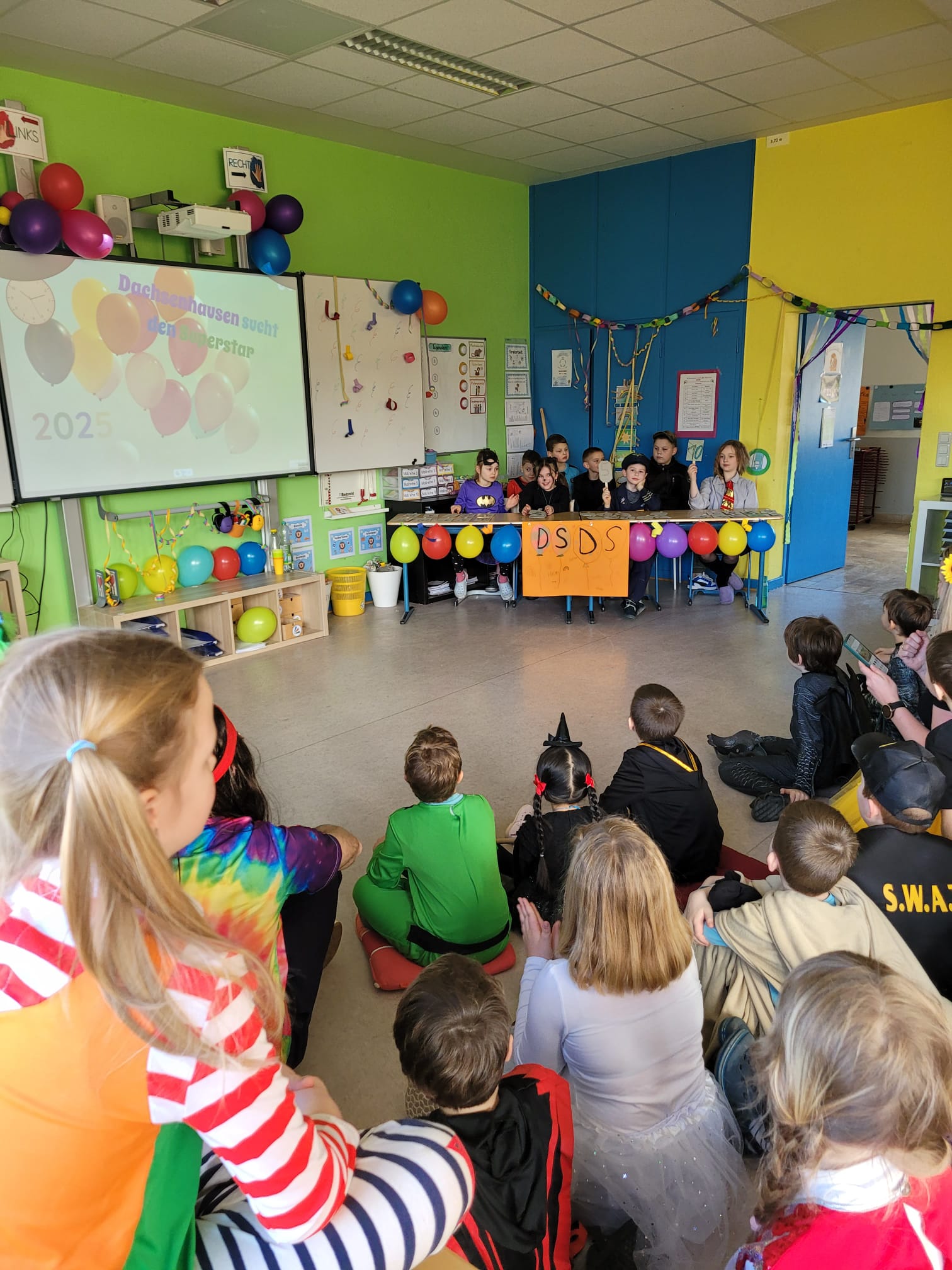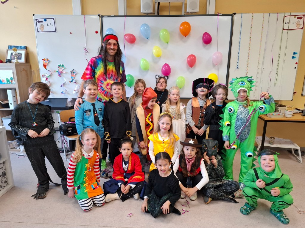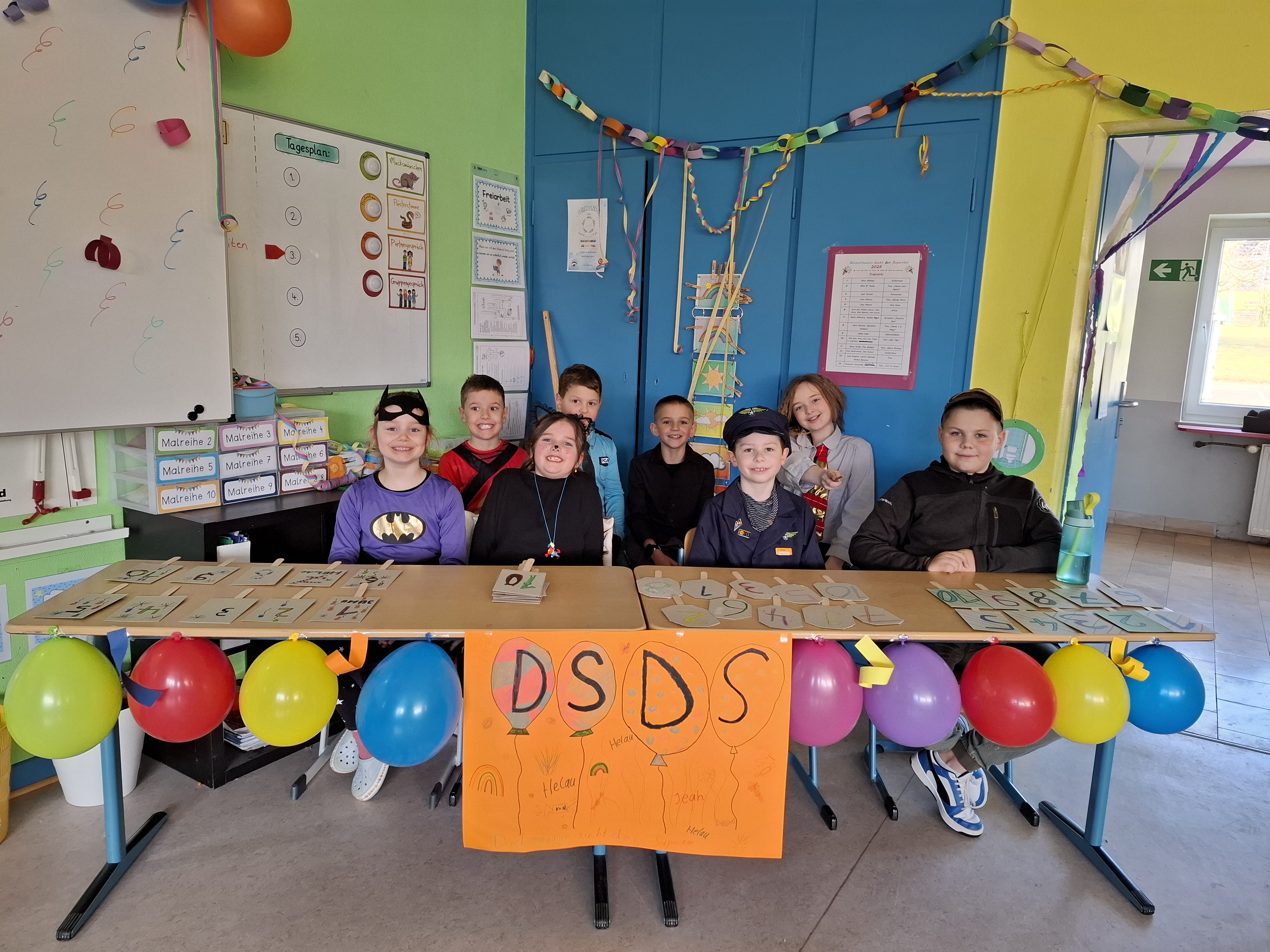 Am Donnerstag, den 27.02.2025, verwandelte sich die Grundschule Dachsenhausen in ein kunterbuntes Karnevalsparadies. Rund 84 fröhliche Kinder feierten gemeinsam die alljährlich stattfindende Karnevalsparty. An Kostümen gab es all das, was das närrische Herz erfreut: Von glitzernden Disneyfiguren, über megacoole Superhelden bis hin zu lustigen Tieren. Die Stimmung war grandios. Es wurde gesungen, getanzt und sehr viel gelacht. Natürlich kam auch das leibliche Wohl nicht zu kurz – in jeder Klasse gab es ein großes Buffet mit allerhand leckeren Sachen. Vielen Dank an die Eltern für dieses tolle Frühstück.Das Highlight der Karnevalsparty war natürlich die Show „Dachsenhausen sucht den Superstar“. Dabei rockten die Kids mit ihren Auftritten die Bühne, bei denen selbst die größten Popstars neidisch geworden wären. Auf dem Programm standen Tänze, Witze, Seilspringen, Hula-Hoop, Pantomime, eine Zaubershow und eine Büttenrede. Bewertet wurden sie dabei von einer Jury, die jeweils aus einem Kind von Klasse 1-4 bestand.Am Ende belegten Anna-Lena, Mila, Fränzi und Leni aus Klasse 3 mit ihrer Tanzdarbietung den ersten Platz, dicht gefolgt von Niklas aus Klasse 4 mit seiner einzigartigen Büttenrede. Auf Platz 3 schafften es Klara und Charlottte aus Klasse 2, ebenfalls mit einer Tanzdarbietung.Mit einem 3x Dachsenhausen Helau endete der karnevalistische Schultag und die Schülerinnen und Schüler der Grundschule Dachsenhausen wurden ins närrische Wochenende entlassen.