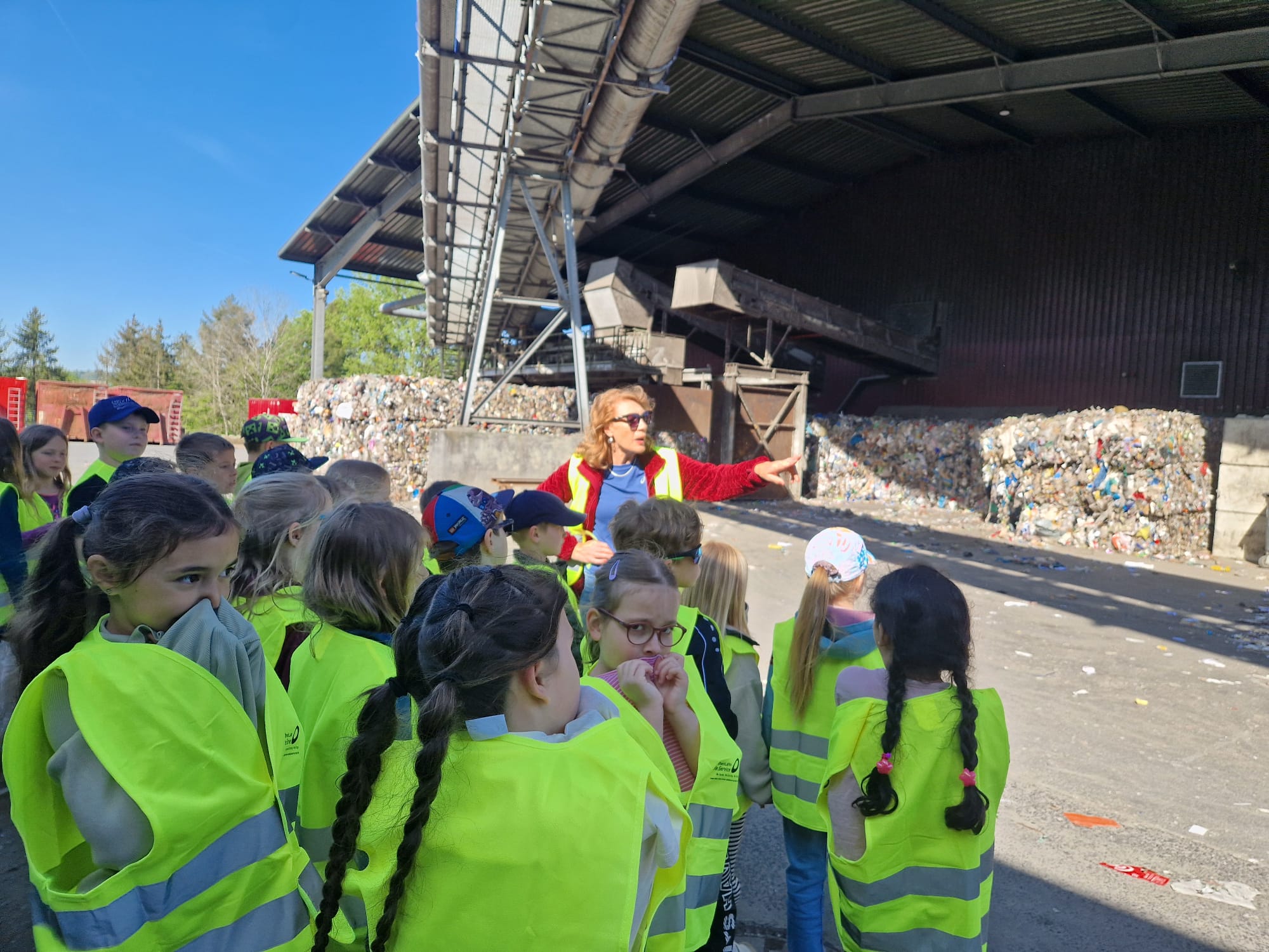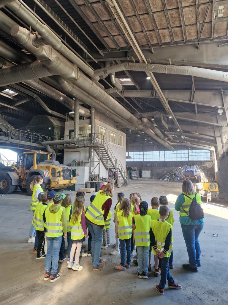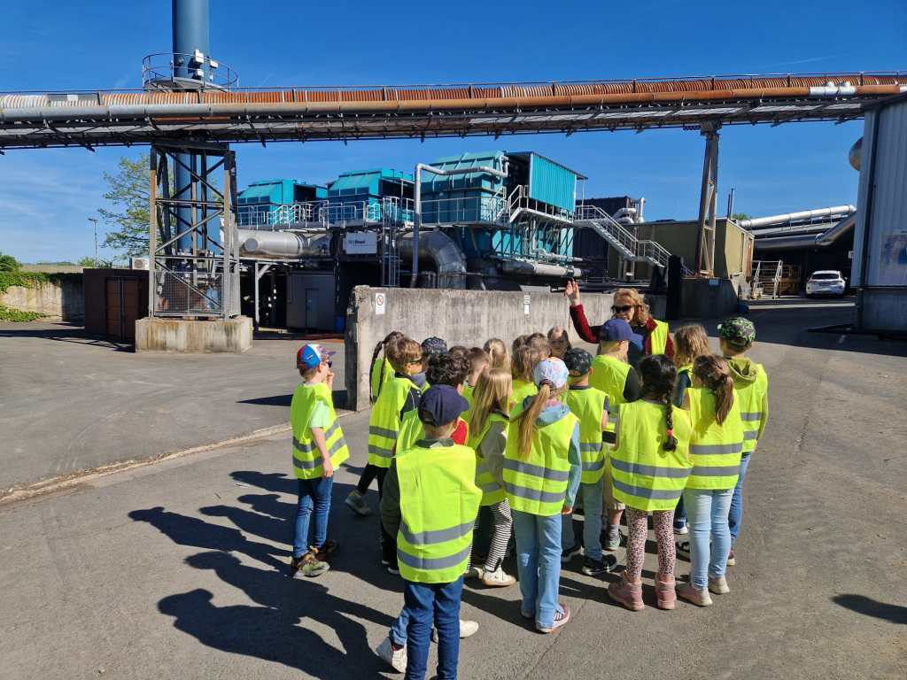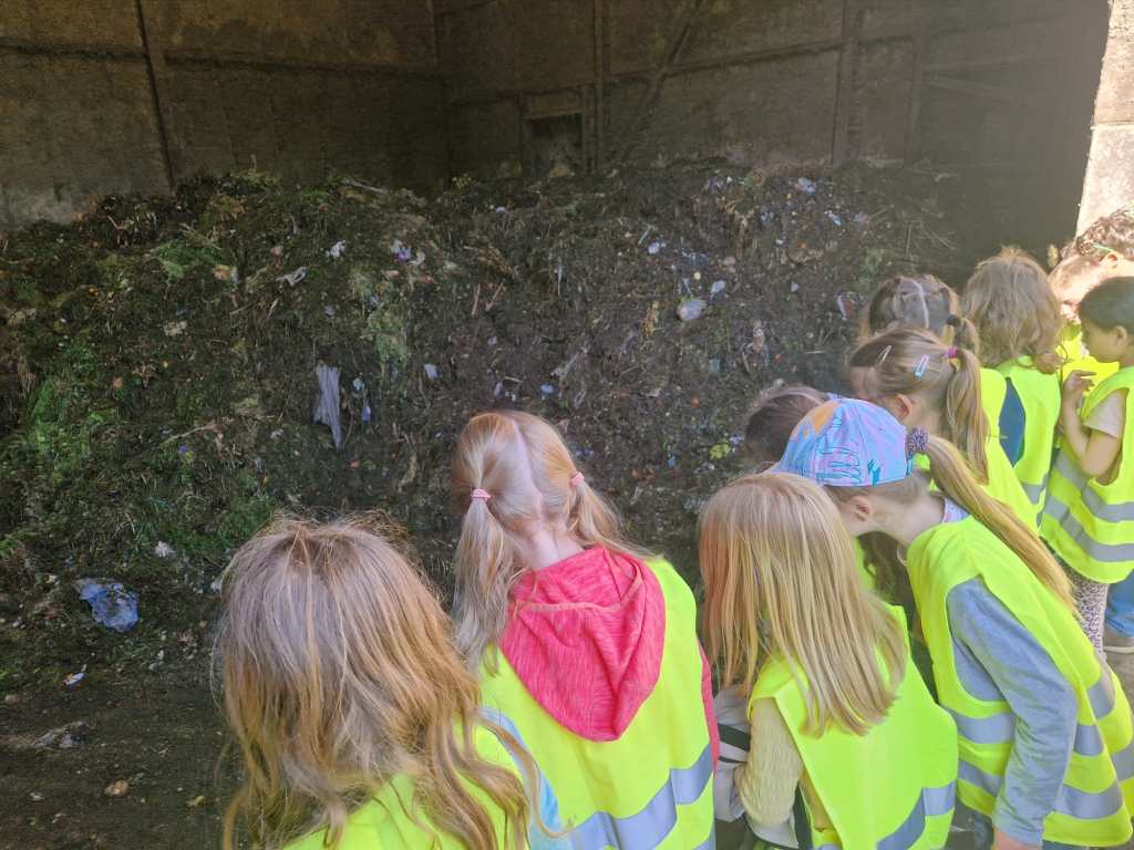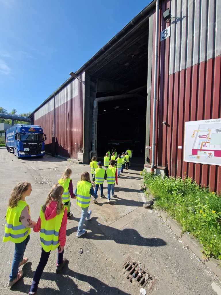 Nachdem die Kinder und Erwachsenen mit Warnwesten ausgestattet waren, führte Alexandra Meier mit ihrem Team die wissbegierigen Grundschülerinnen und Grundschüler in zwei Gruppen über das Gelände. Hier erfuhren alle Teilnehmer nicht nur allerhand über die Müllsortierung und Trennung vor Ort. Vor allem der Prozess der mechanisch-biologischen Abfallbehandlung, bei der in Schritten der Abfall nach der Sortierung zuerst zerkleinert wird und danach verrottet, war faszinierend. Spannend war auch der Umgang mit „Müllwasser“, das in der Anlage anfällt. Hier konnten die Kinder lernen, wie aus einer braunen unappetitlichen Flüssigkeit klares Wasser entsteht.