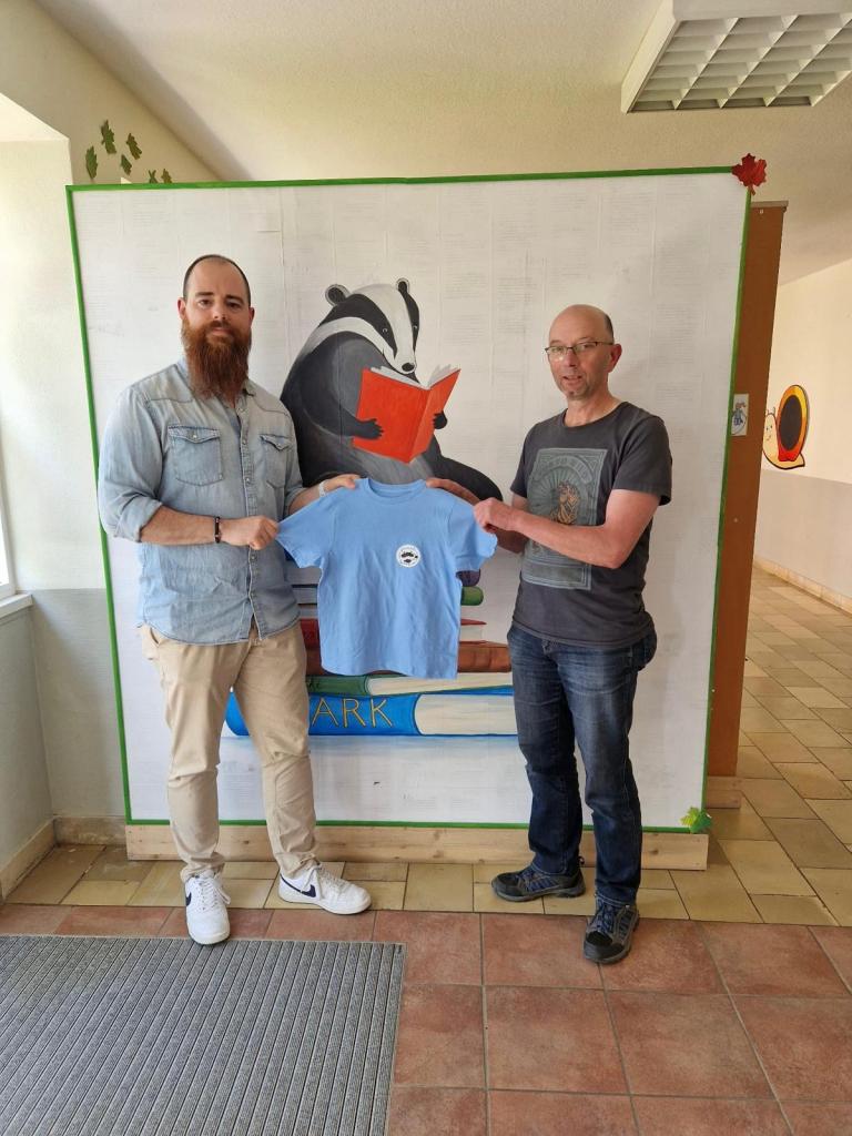 Vor wenigen Tagen erhielt die Grundschule Dachsenhausen ihr eigenes Schul-T-Shirt. Ab sofort können die Schülerinnen und Schüler im gemeinsamen Look zu verschiedenen Anlässen ihre Zusammengehörigkeit zum Ausdruck bringen und ihre Schule repräsentieren. Das neue Schul-T-Shirt erscheint in hellblauer Farbe und wird vom schuleigenen Logo geziert. Ermöglicht wurde dies durch den Förderverein der Grundschule Dachsenhausen, der der Schule rund 90 T-Shirts sponsorte. Der erste Vorsitzende Michael Köhlbach überreichte die Schul-T-Shirts an Schulleiter Patrick Bender, der diese in Vertretung für die Schülerinnen und Schüler begeistert entgegennahm.