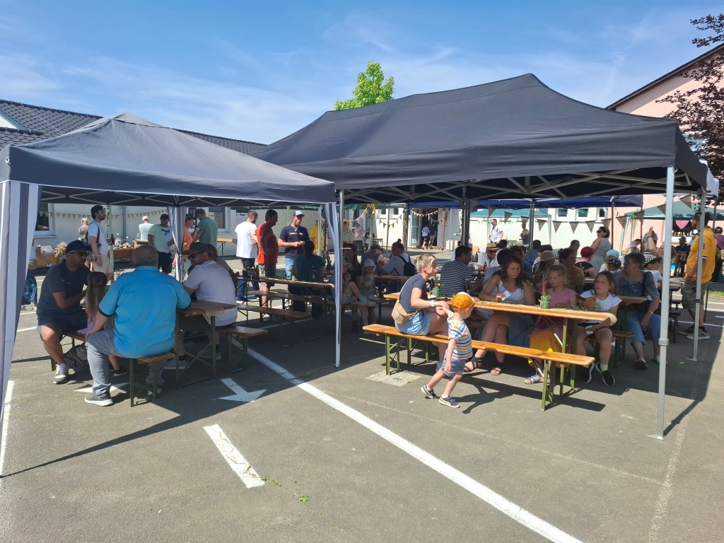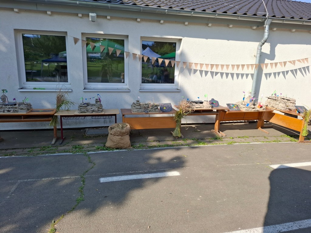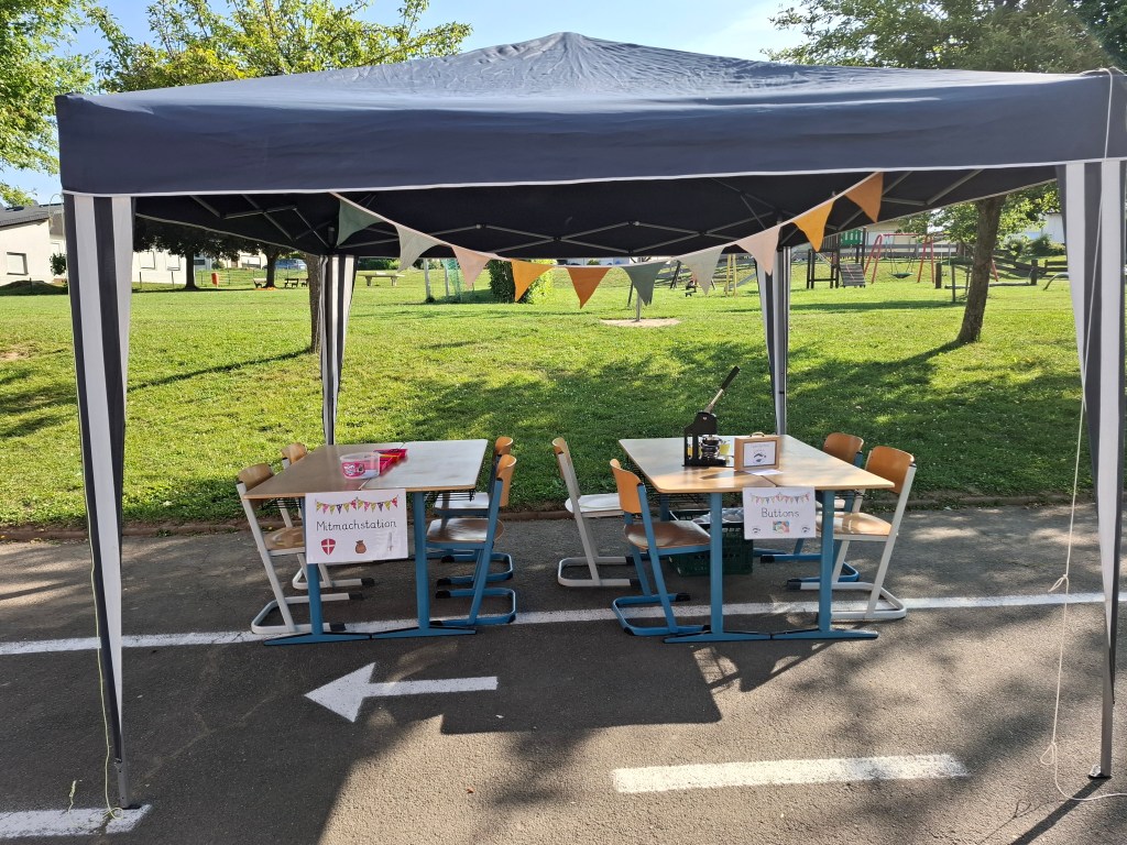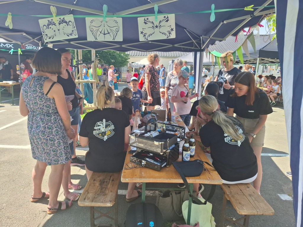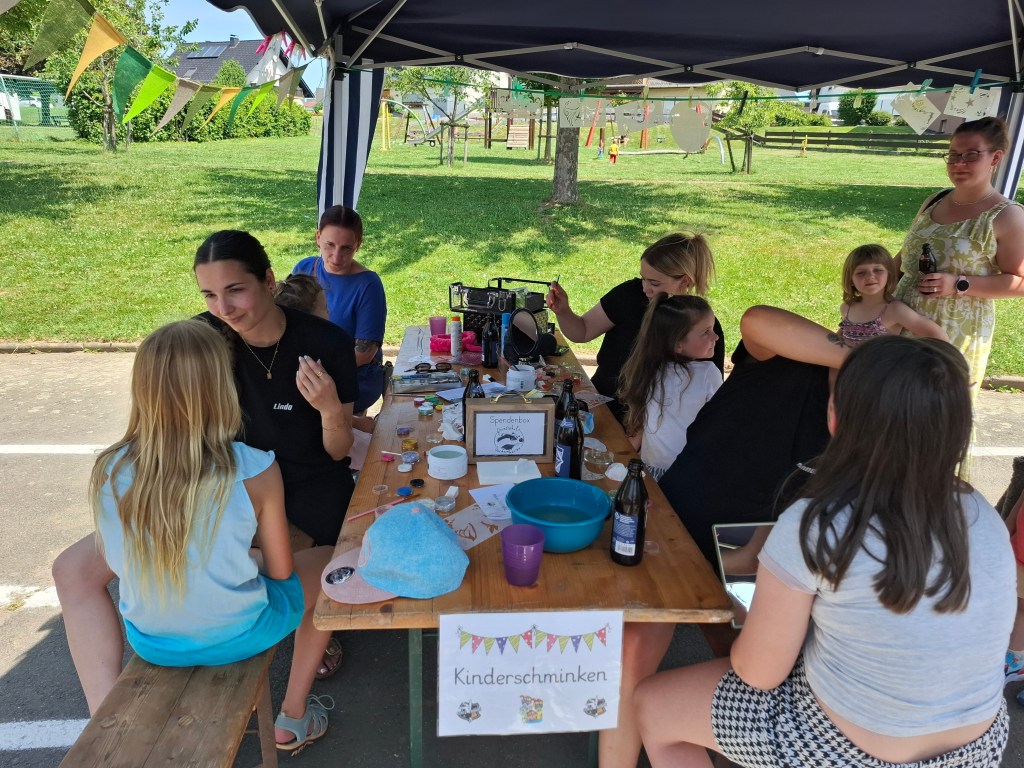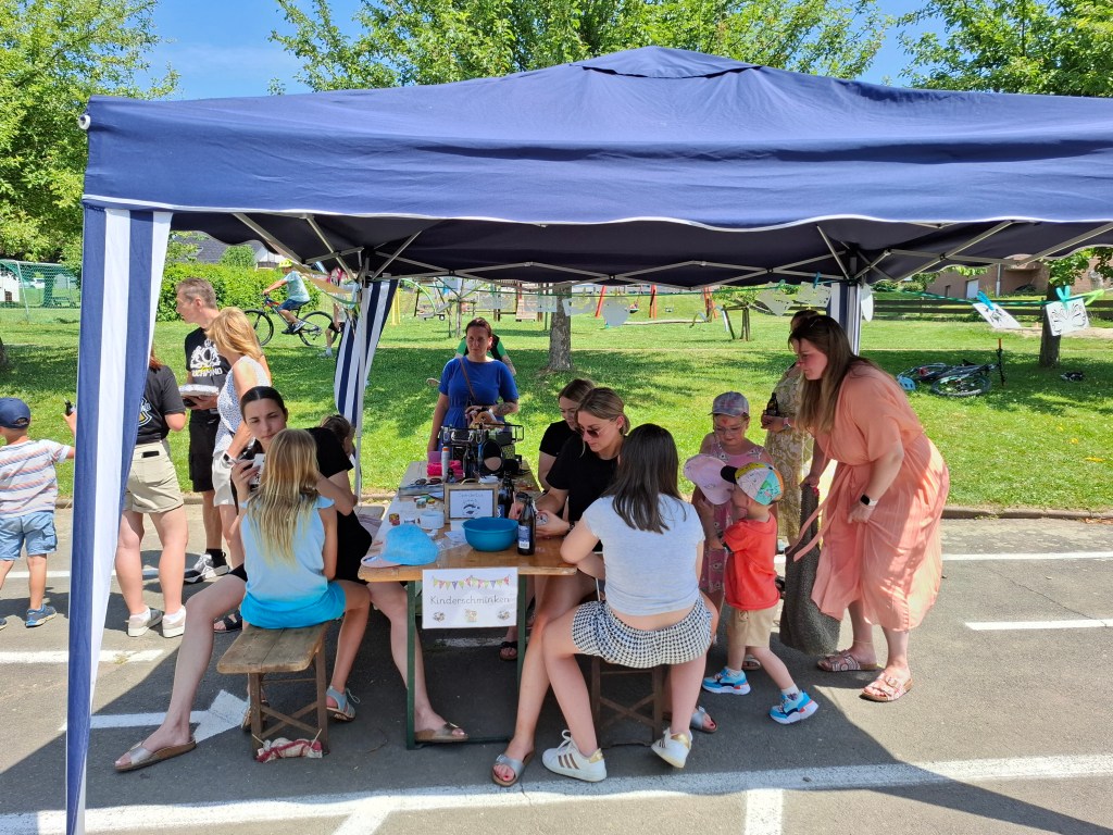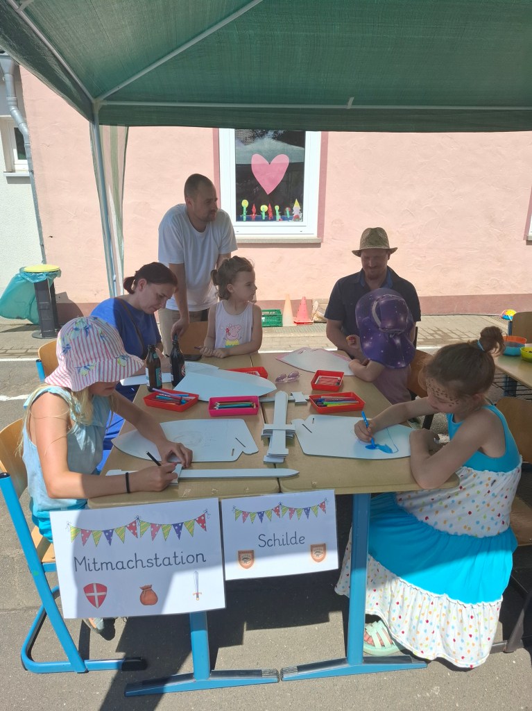 Nun konnte das Schulfest starten. Im Außenbereich der Schule gab es zahlreiche Angebote für die Kinder, die von den Familien und Besuchern begeistert angenommen wurden. Bei einer von der Betreuung vorbereiteten Glücksrad-Aktion gab es attraktive Sachpreise zu gewinnen. Die Hüpfburg der Firma Fun Production sorgte bei den Kindern für große Begeisterung. Ebenso wurden die Mitmachangebote, welche unter anderem die Herstellung von Lederbeuteln, das Bemalen von Schwertern und Schilde und die Buttonmaschine beinhalteten, sehr gut angenommen. Auch der Wald und Wiese Verein aus Dachsenhausen bereicherte das Schulfest mit einem Kräuterlimostand, einem mitgebrachten Barfußpfad sowie der Möglichkeit zum Armbänder knüpfen. Mit einem Schminkstand verzierte die Showtanzgruppe „Echte Fründe“ aus Dachsenhausen die Gesichter der Kinder mit verschiedenen Motiven und ganz viel Glitzer.
