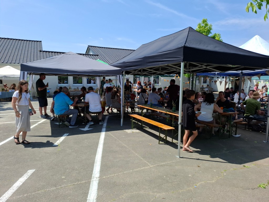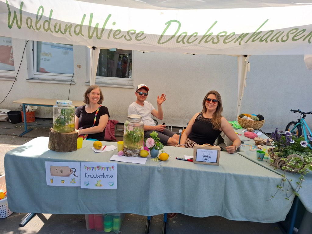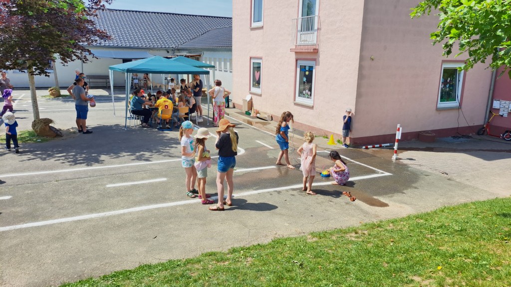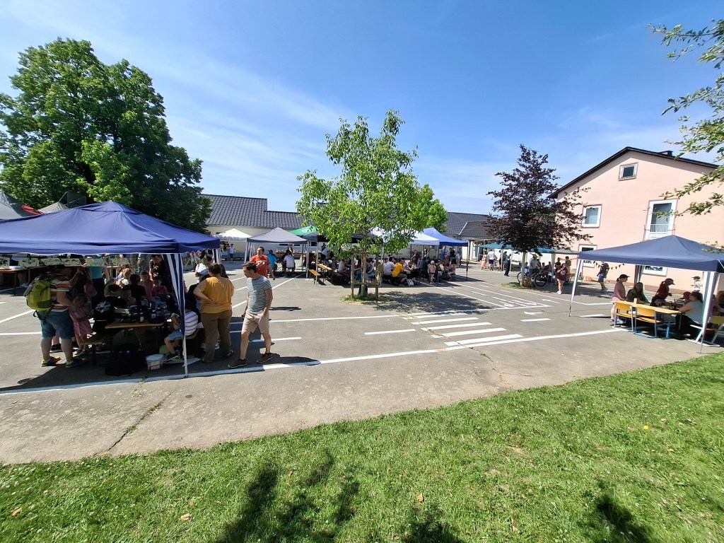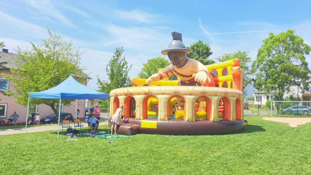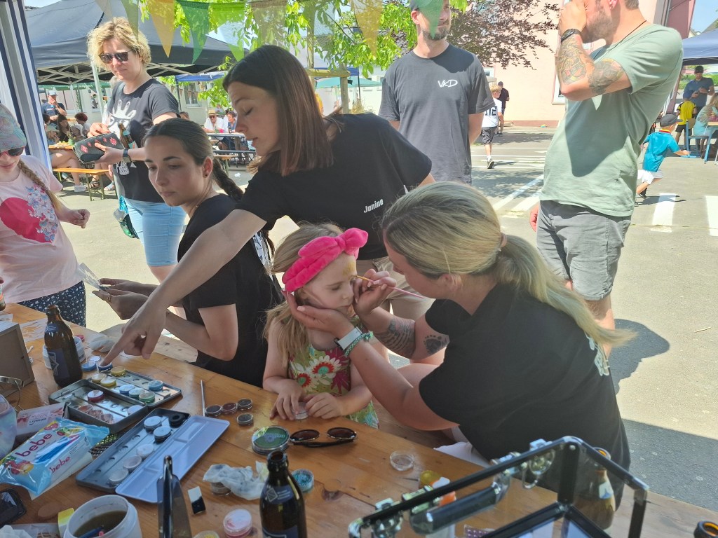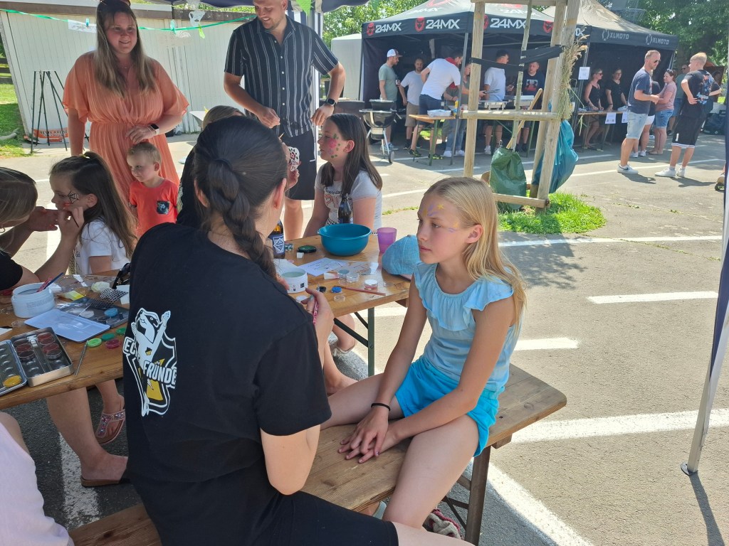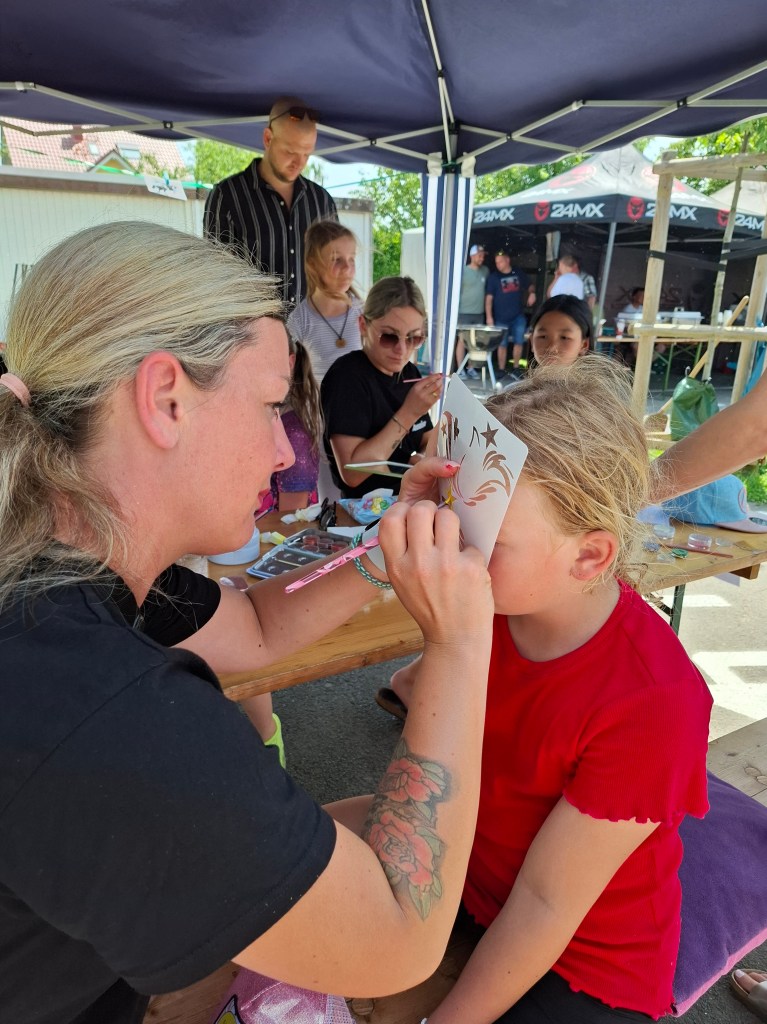 Nun konnte das Schulfest starten. Im Außenbereich der Schule gab es zahlreiche Angebote für die Kinder, die von den Familien und Besuchern begeistert angenommen wurden. Bei einer von der Betreuung vorbereiteten Glücksrad-Aktion gab es attraktive Sachpreise zu gewinnen. Die Hüpfburg der Firma Fun Production sorgte bei den Kindern für große Begeisterung. Ebenso wurden die Mitmachangebote, welche unter anderem die Herstellung von Lederbeuteln, das Bemalen von Schwertern und Schilde und die Buttonmaschine beinhalteten, sehr gut angenommen. Auch der Wald und Wiese Verein aus Dachsenhausen bereicherte das Schulfest mit einem Kräuterlimostand, einem mitgebrachten Barfußpfad sowie der Möglichkeit zum Armbänder knüpfen. Mit einem Schminkstand verzierte die Showtanzgruppe „Echte Fründe“ aus Dachsenhausen die Gesichter der Kinder mit verschiedenen Motiven und ganz viel Glitzer.