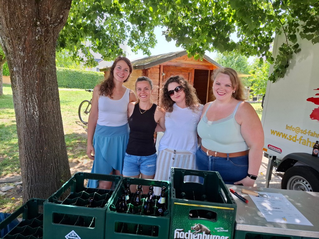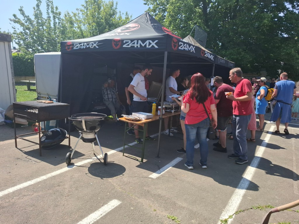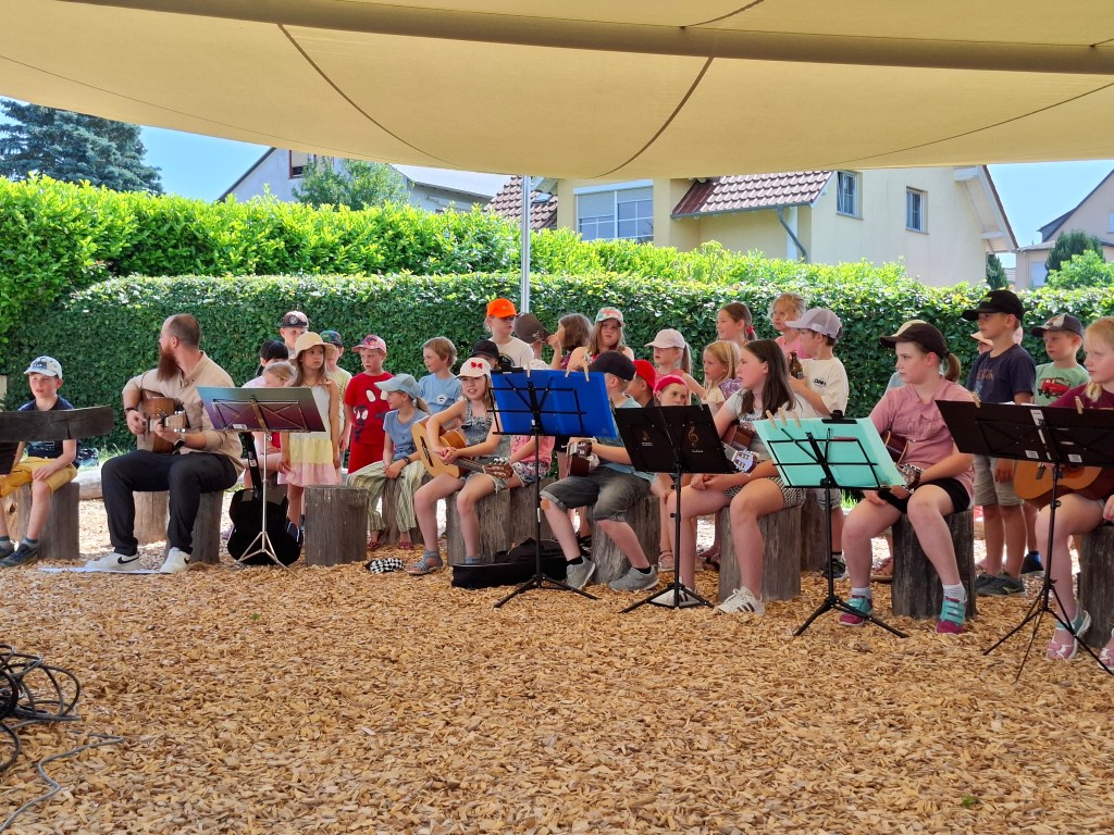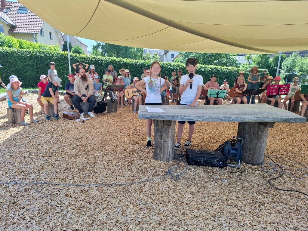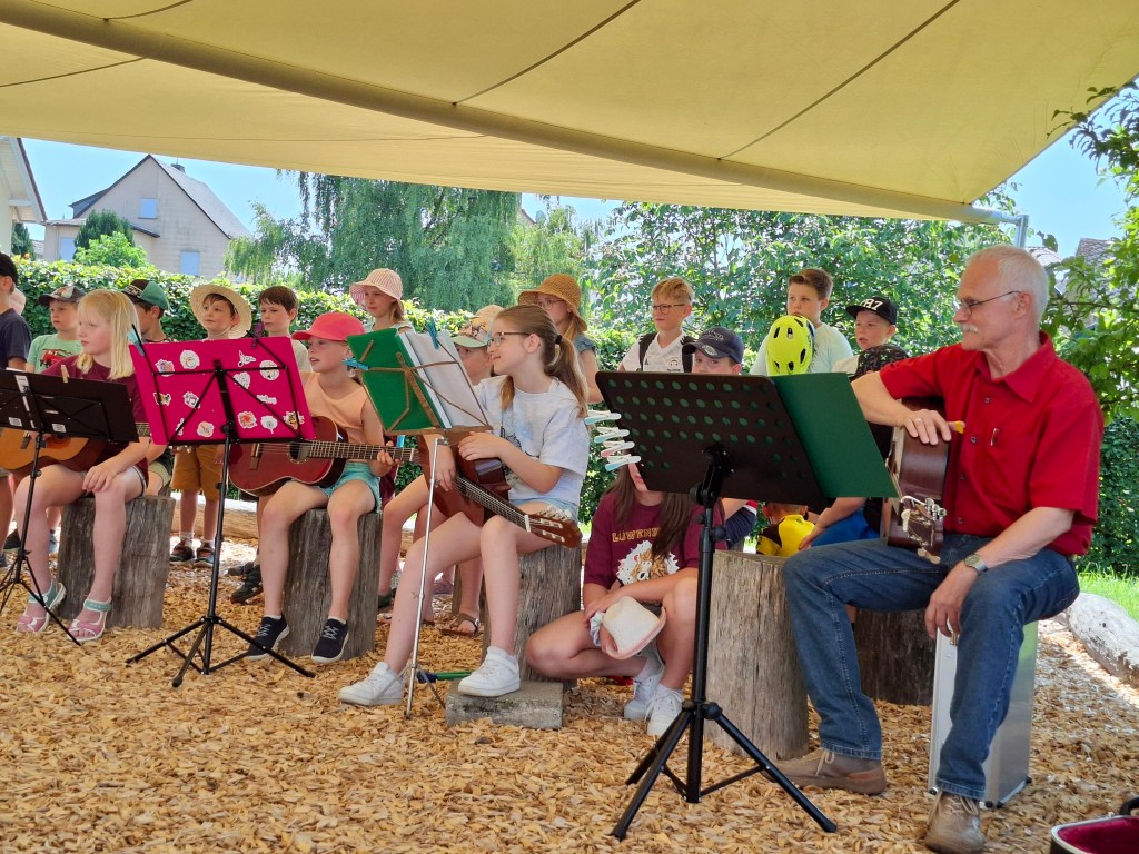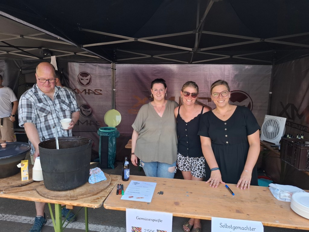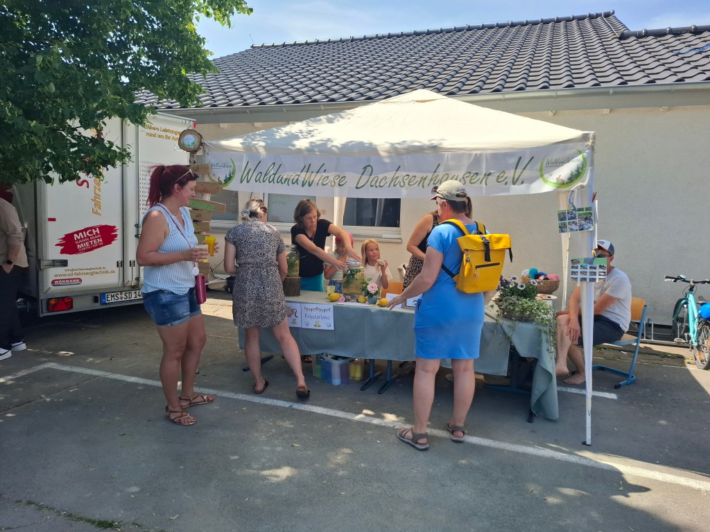 Nun konnte das Schulfest starten. Im Außenbereich der Schule gab es zahlreiche Angebote für die Kinder, die von den Familien und Besuchern begeistert angenommen wurden. Bei einer von der Betreuung vorbereiteten Glücksrad-Aktion gab es attraktive Sachpreise zu gewinnen. Die Hüpfburg der Firma Fun Production sorgte bei den Kindern für große Begeisterung. Ebenso wurden die Mitmachangebote, welche unter anderem die Herstellung von Lederbeuteln, das Bemalen von Schwertern und Schilde und die Buttonmaschine beinhalteten, sehr gut angenommen. Auch der Wald und Wiese Verein aus Dachsenhausen bereicherte das Schulfest mit einem Kräuterlimostand, einem mitgebrachten Barfußpfad sowie der Möglichkeit zum Armbänder knüpfen. Mit einem Schminkstand verzierte die Showtanzgruppe „Echte Fründe“ aus Dachsenhausen die Gesichter der Kinder mit verschiedenen Motiven und ganz viel Glitzer.