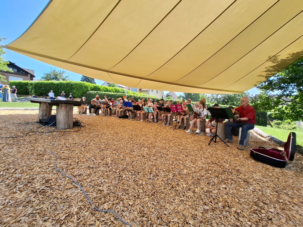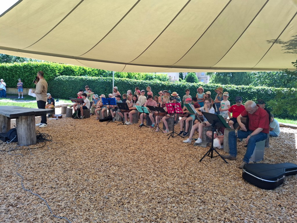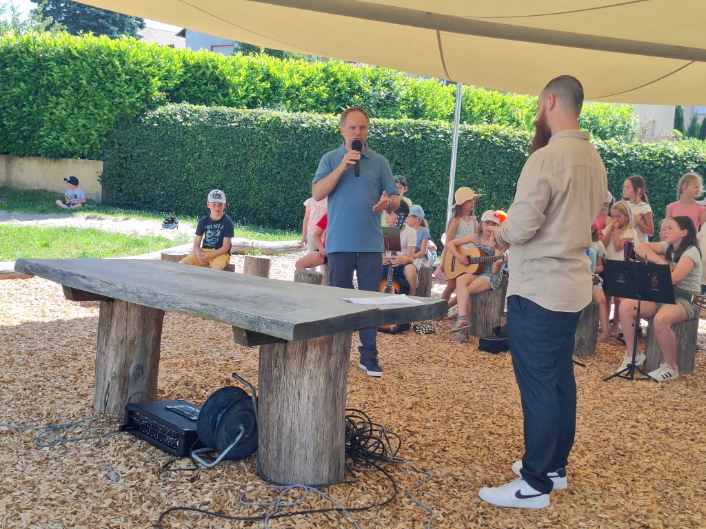 Den Startschuss zu unserem Sommerfest gab Schulleiter Patrick Bender, der die Gäste, unter anderem Verbandsbürgermeister Mike Weiland, Ortsvertreter Achim Hohl sowie Sylvia Schmidt und Kai Wernicke und Michaela Wari von der deutschen Burgenvereinigung, bei bestem Wetter Willkommen hieß und sich in seiner Rede schon einmal bei allen Mitwirkenden bedankte. Mit einem mittelalterlichen Gedicht sorgte Schülersprecher Niklas Kohl für den ein oder anderen Lacher. Die musikalische Begleitung übernahm Helmut Knopp mit der Gitarren-AG der Grundschule Dachsenhausen, die mit der Unterstützung der gesamten Schulgemeinschaft mittelalterliche Lieder zum Besten gab.