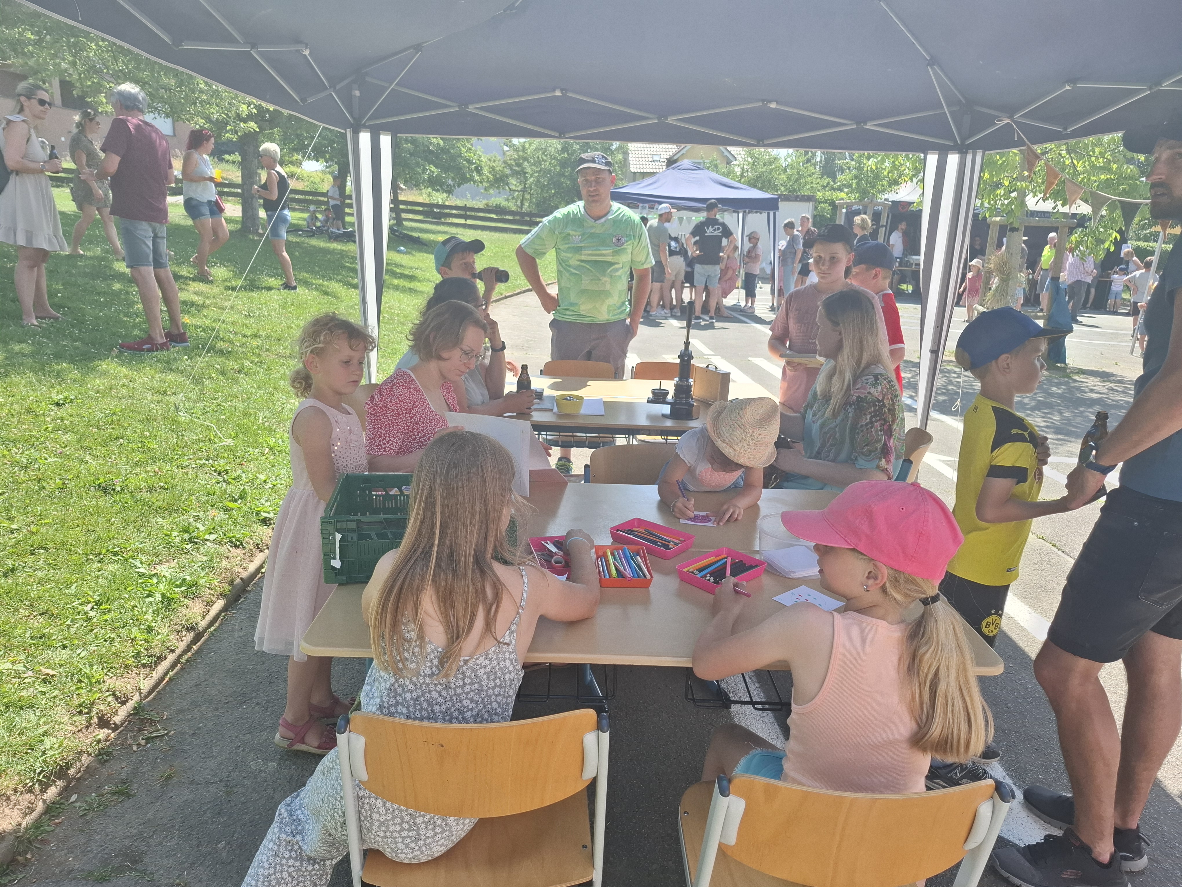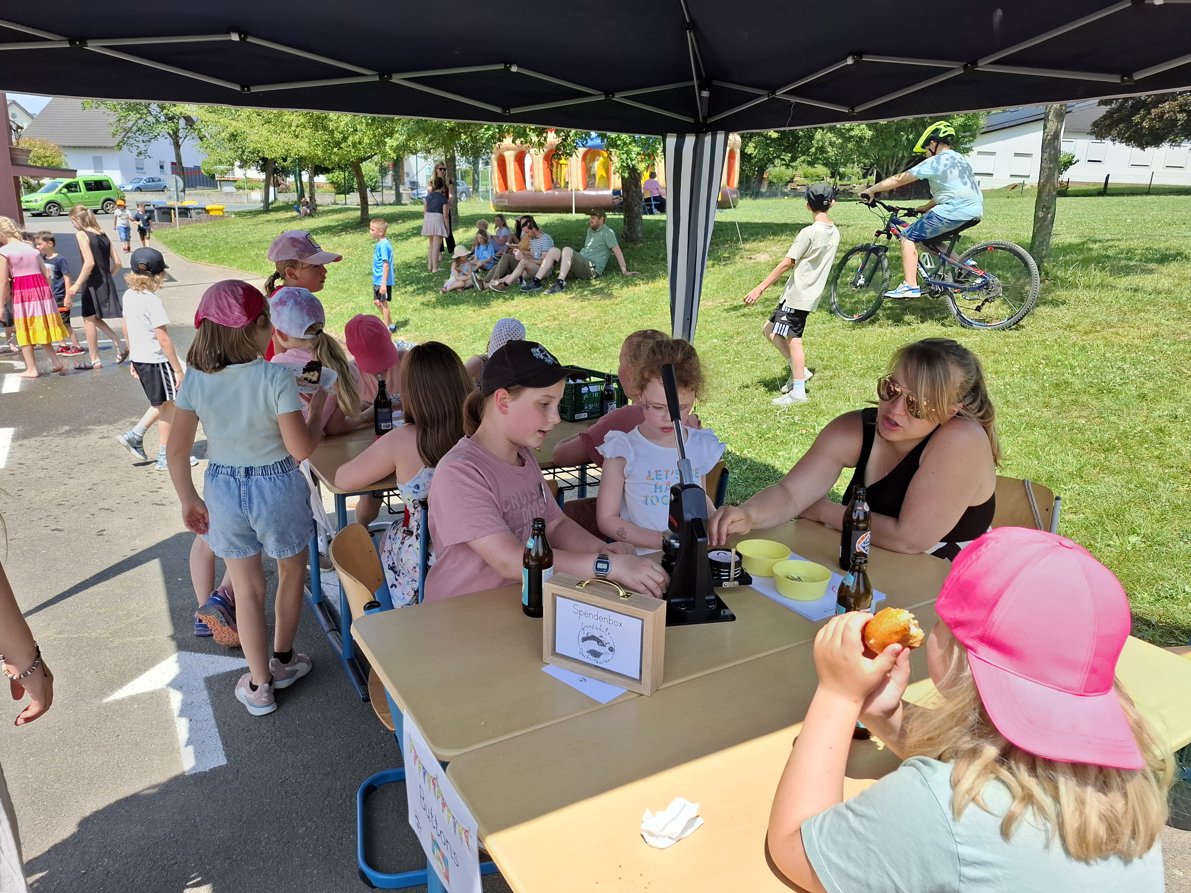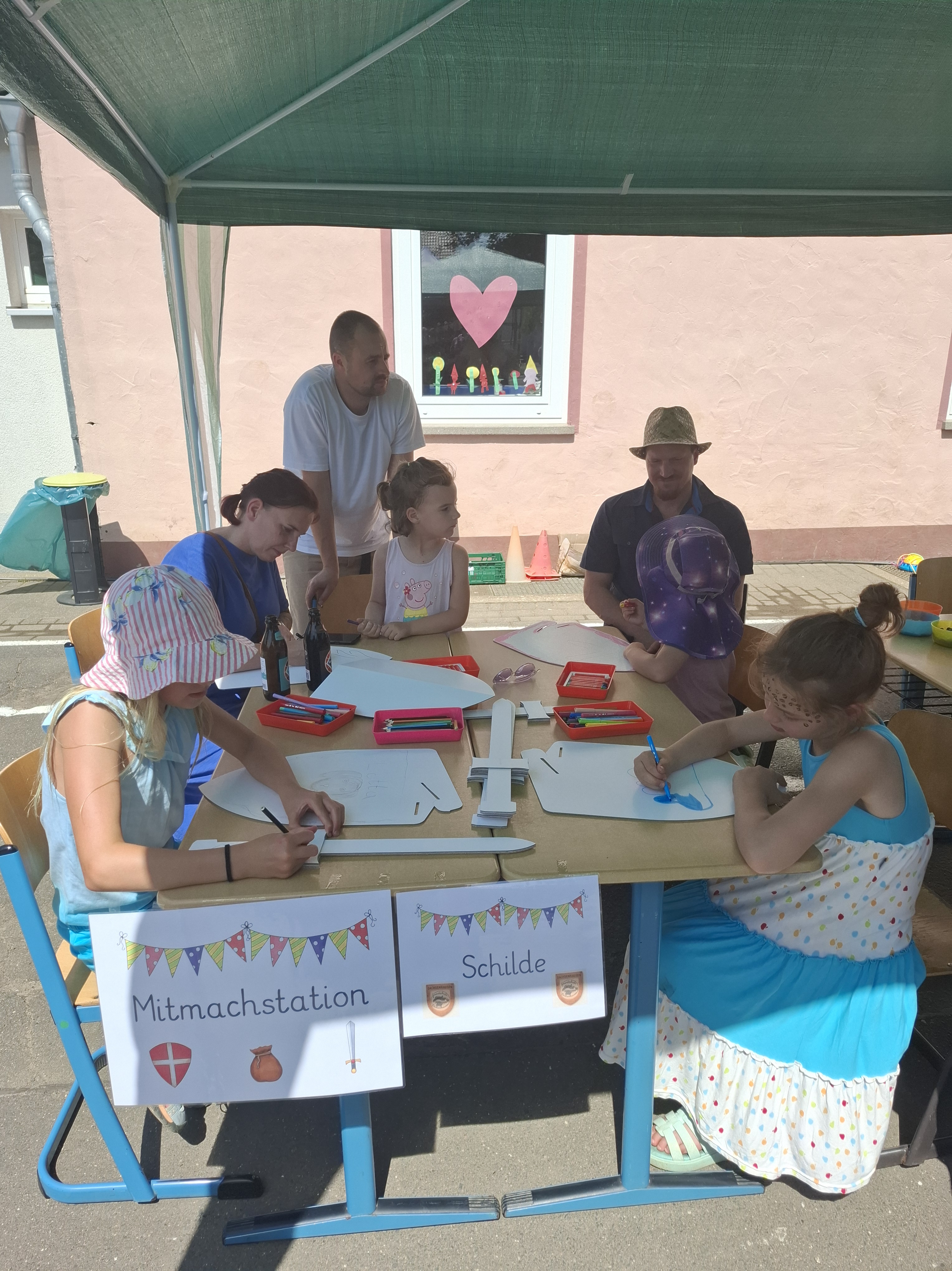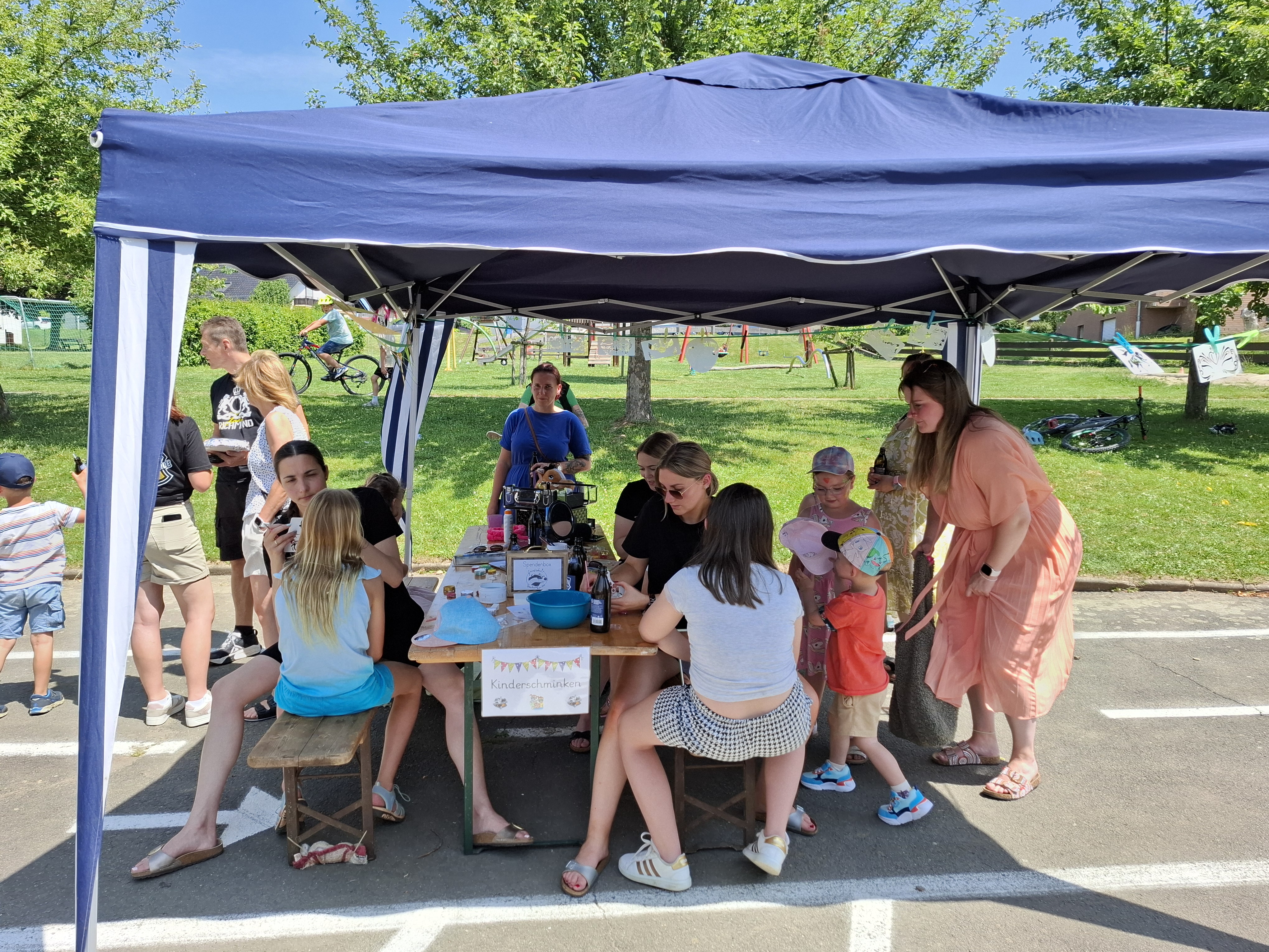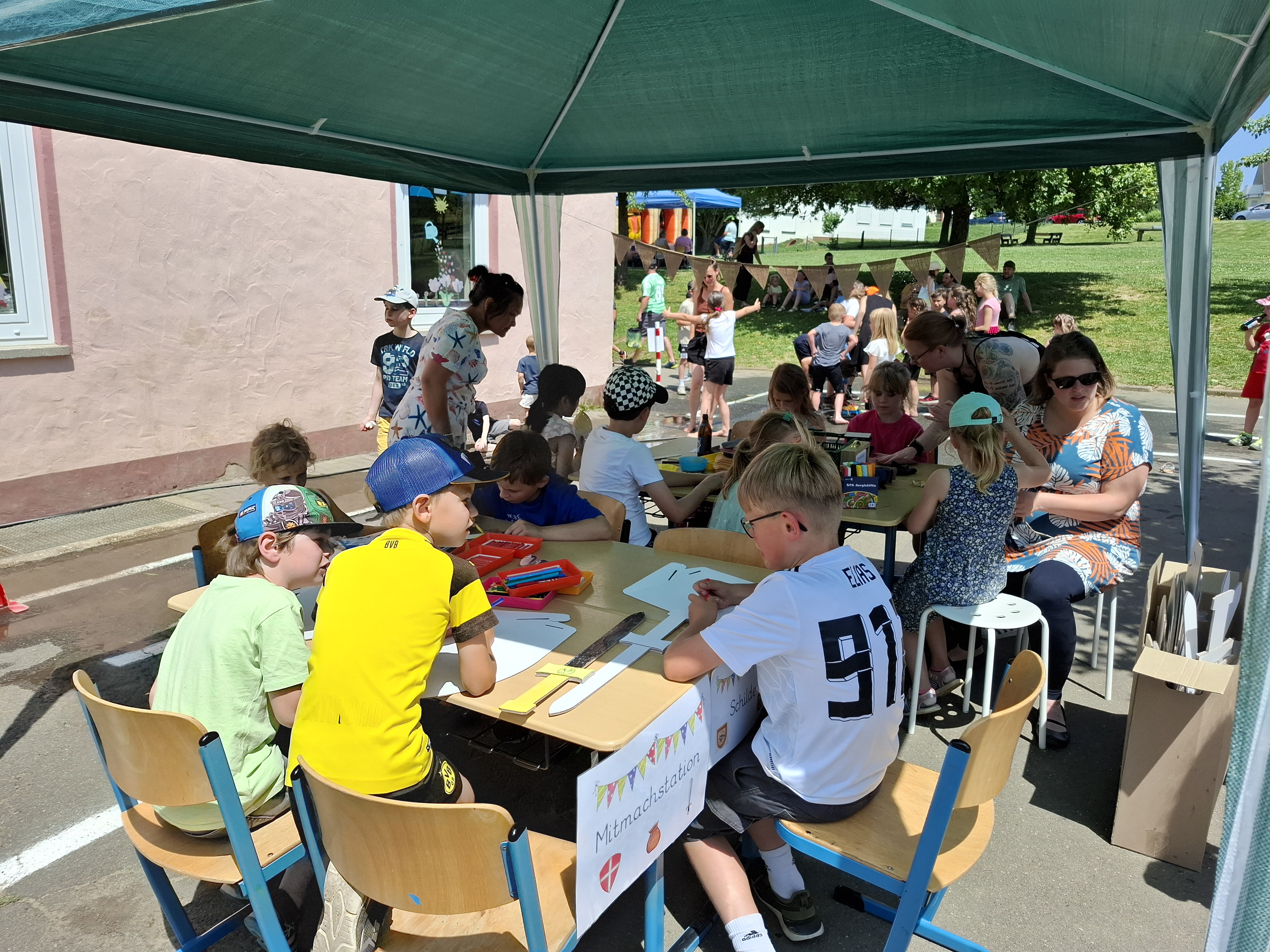 Nun konnte das Schulfest starten. Im Außenbereich der Schule gab es zahlreiche Angebote für die Kinder, die von den Familien und Besuchern begeistert angenommen wurden. Bei einer von der Betreuung vorbereiteten Glücksrad-Aktion gab es attraktive Sachpreise zu gewinnen. Die Hüpfburg der Firma Fun Production sorgte bei den Kindern für große Begeisterung. Ebenso wurden die Mitmachangebote, welche unter anderem die Herstellung von Lederbeuteln, das Bemalen von Schwertern und Schilde und die Buttonmaschine beinhalteten, sehr gut angenommen. Auch der Wald und Wiese Verein aus Dachsenhausen bereicherte das Schulfest mit einem Kräuterlimostand, einem mitgebrachten Barfußpfad sowie der Möglichkeit zum Armbänder knüpfen. Mit einem Schminkstand verzierte die Showtanzgruppe „Echte Fründe“ aus Dachsenhausen die Gesichter der Kinder mit verschiedenen Motiven und ganz viel Glitzer.