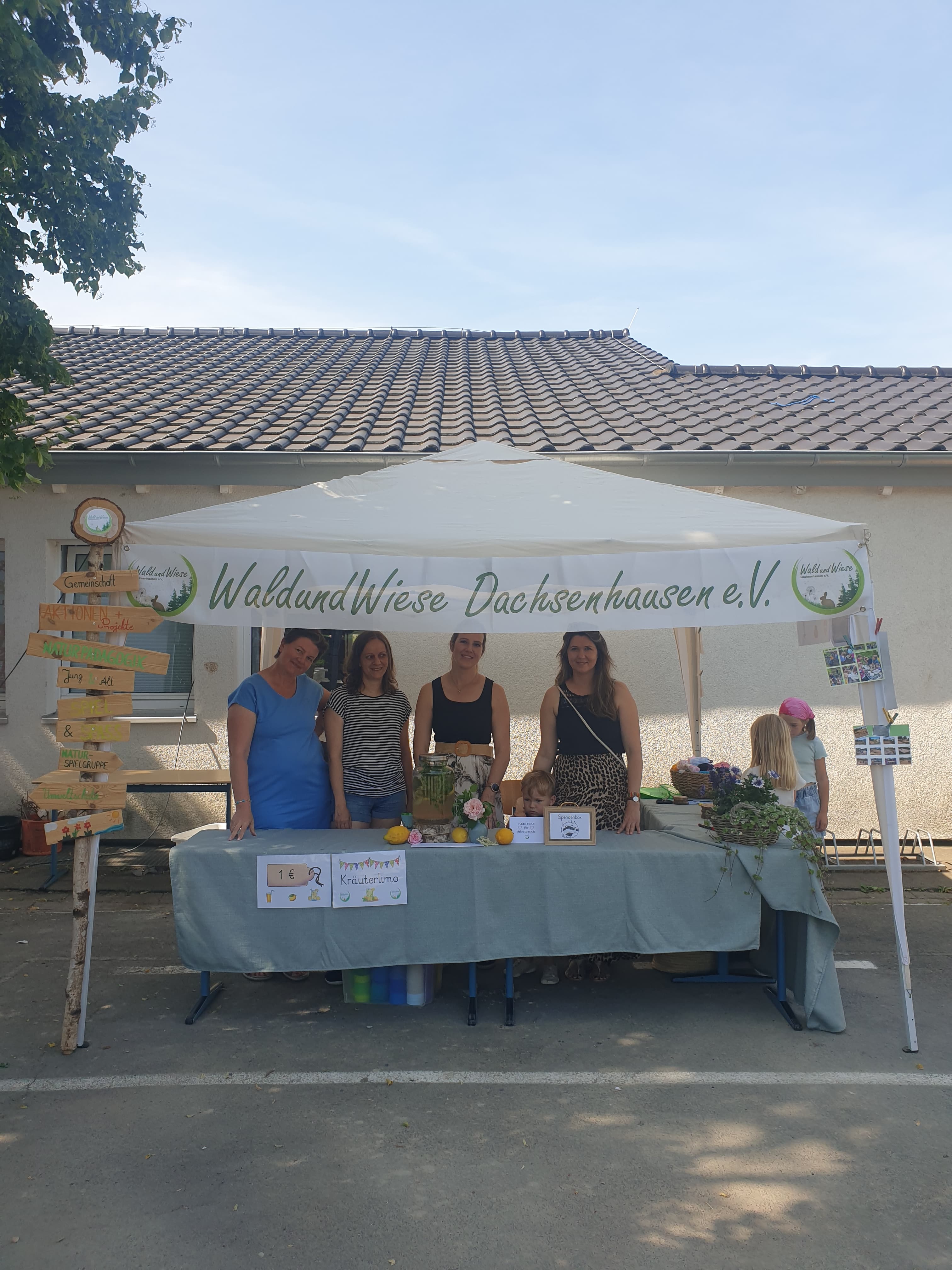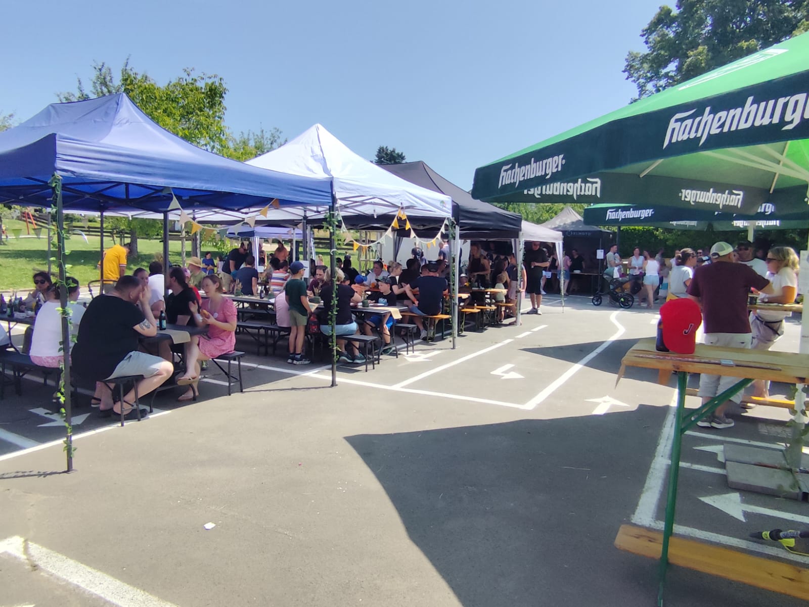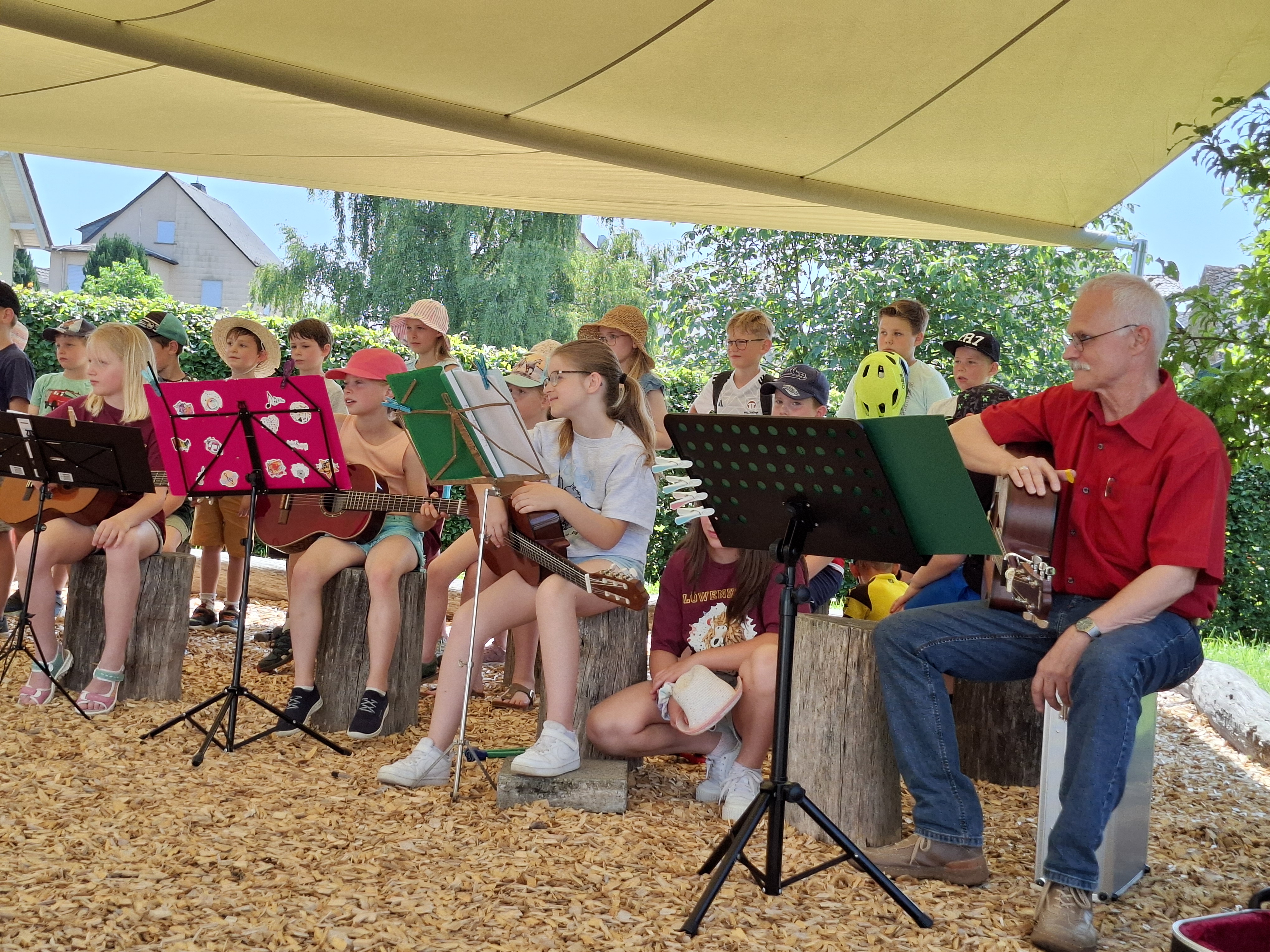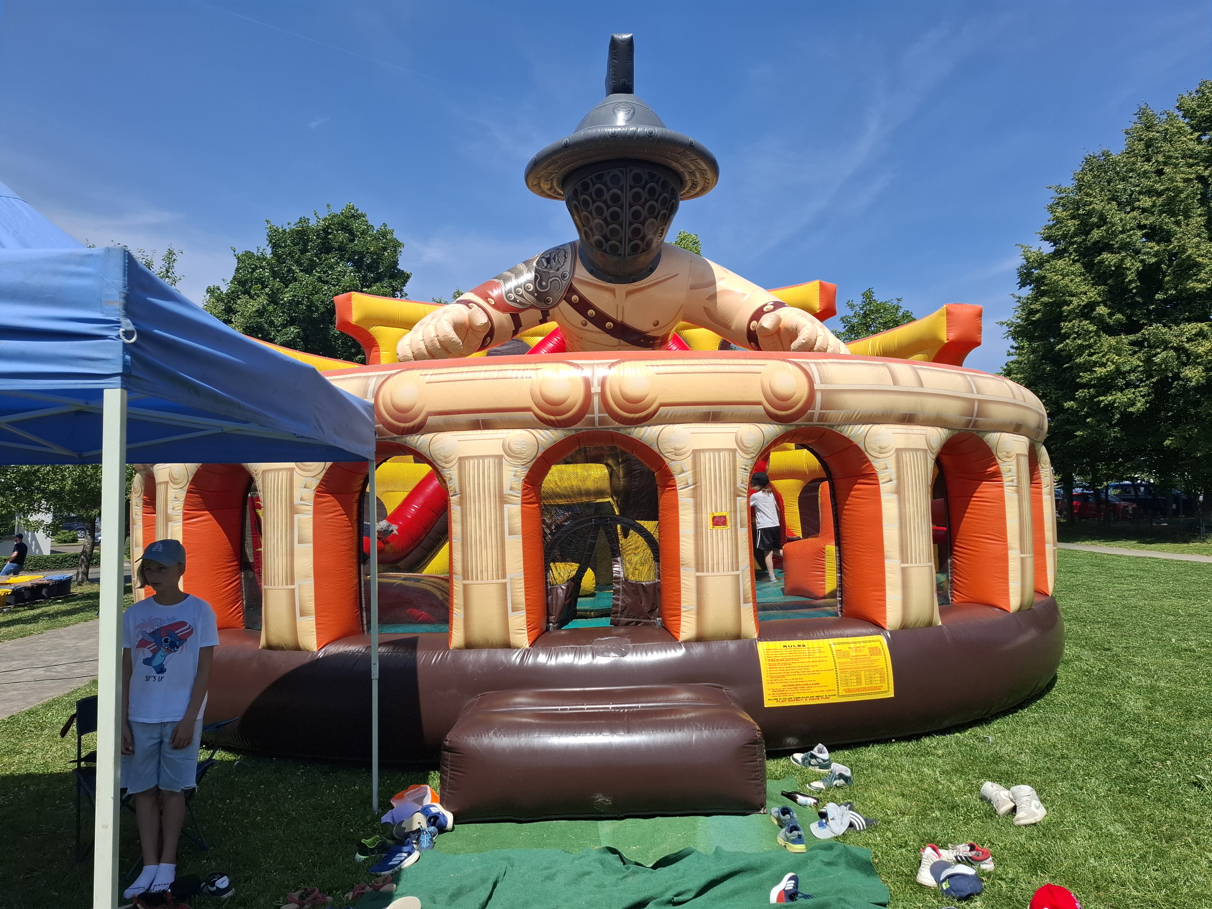 Nun konnte das Schulfest starten. Im Außenbereich der Schule gab es zahlreiche Angebote für die Kinder, die von den Familien und Besuchern begeistert angenommen wurden. Bei einer von der Betreuung vorbereiteten Glücksrad-Aktion gab es attraktive Sachpreise zu gewinnen. Die Hüpfburg der Firma Fun Production sorgte bei den Kindern für große Begeisterung. Ebenso wurden die Mitmachangebote, welche unter anderem die Herstellung von Lederbeuteln, das Bemalen von Schwertern und Schilde und die Buttonmaschine beinhalteten, sehr gut angenommen. Auch der Wald und Wiese Verein aus Dachsenhausen bereicherte das Schulfest mit einem Kräuterlimostand, einem mitgebrachten Barfußpfad sowie der Möglichkeit zum Armbänder knüpfen. Mit einem Schminkstand verzierte die Showtanzgruppe „Echte Fründe“ aus Dachsenhausen die Gesichter der Kinder mit verschiedenen Motiven und ganz viel Glitzer.