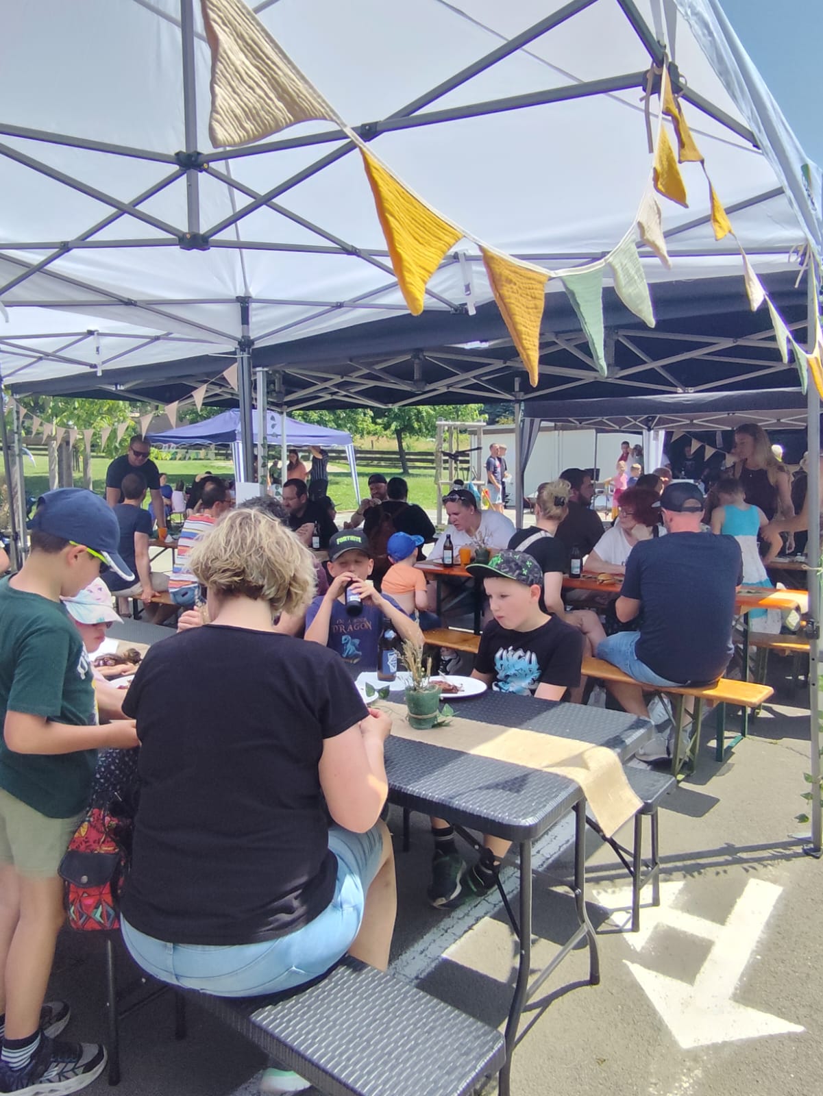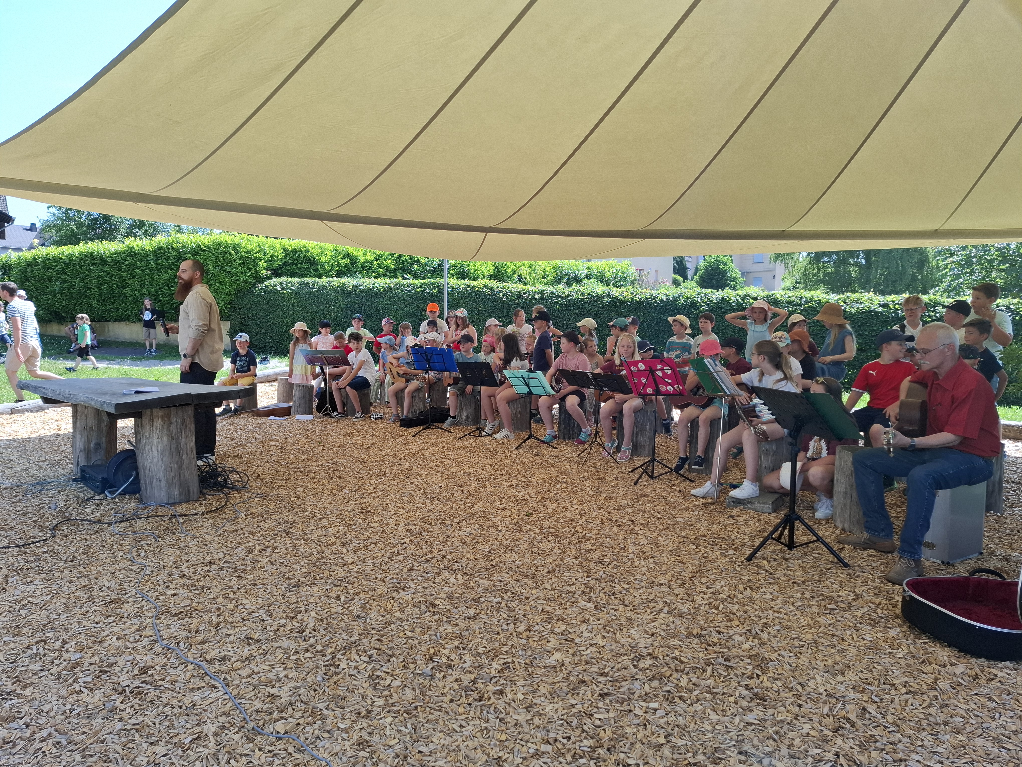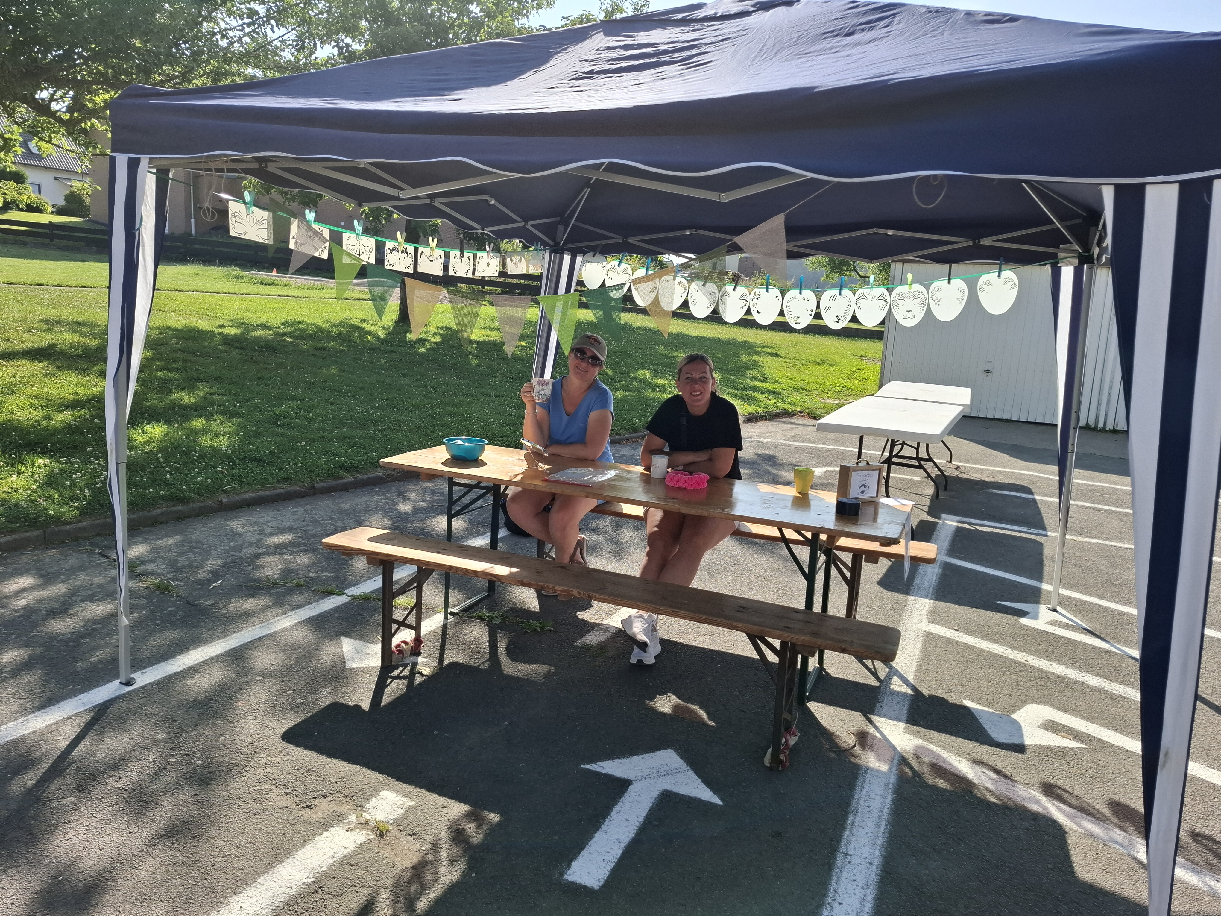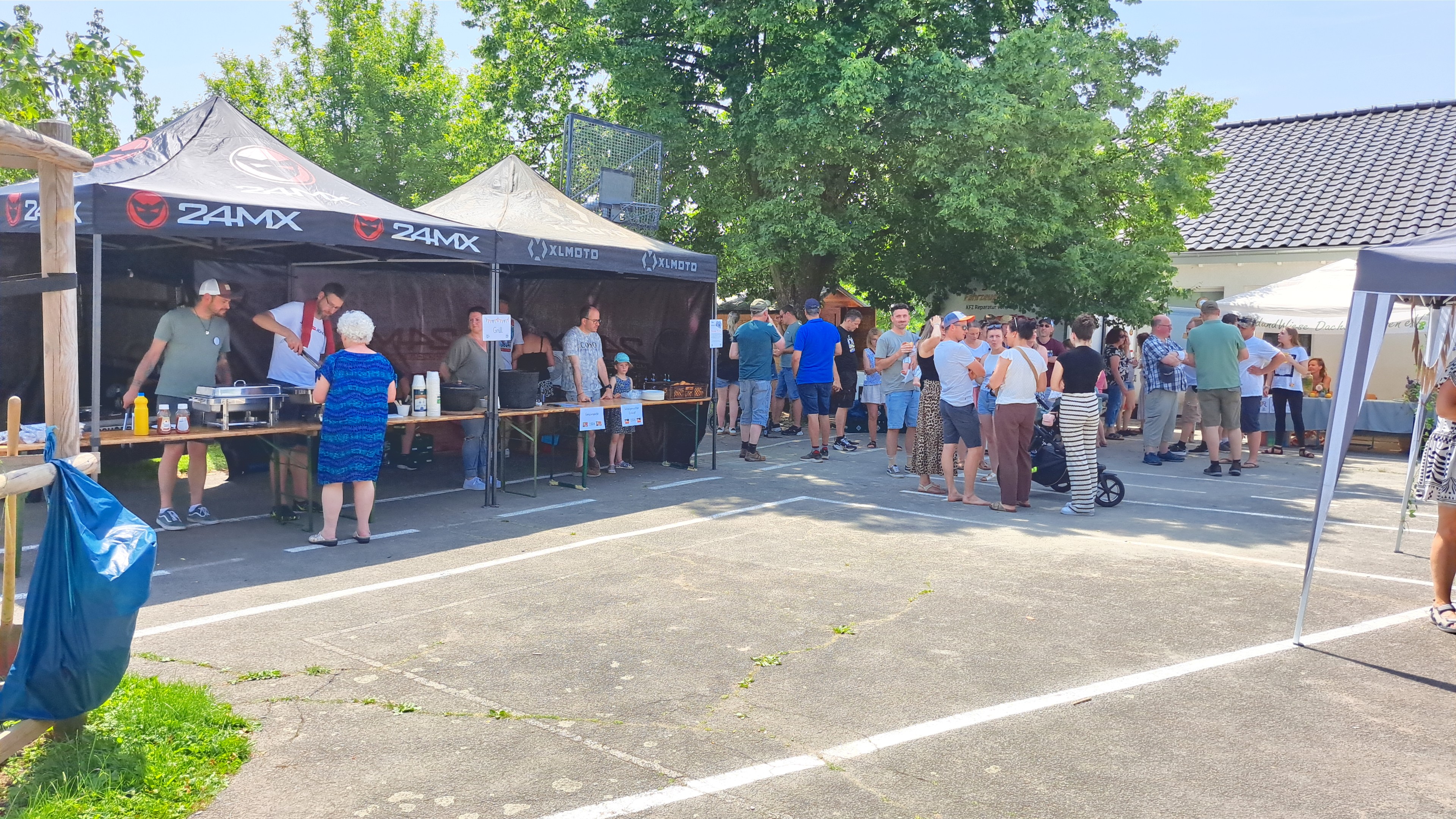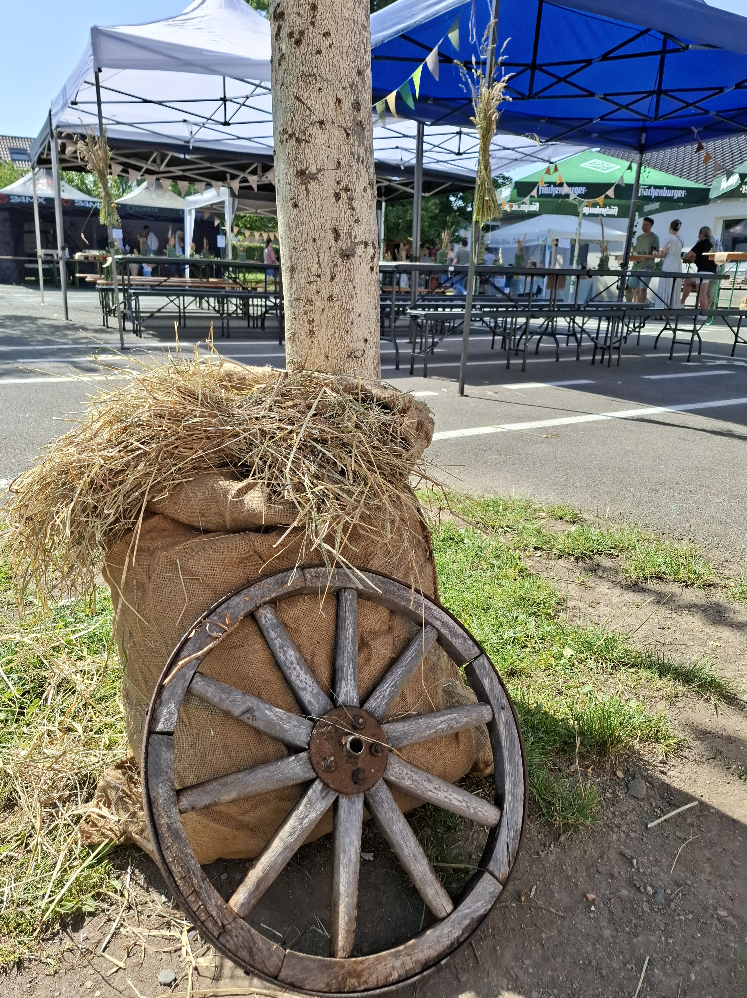 Nun konnte das Schulfest starten. Im Außenbereich der Schule gab es zahlreiche Angebote für die Kinder, die von den Familien und Besuchern begeistert angenommen wurden. Bei einer von der Betreuung vorbereiteten Glücksrad-Aktion gab es attraktive Sachpreise zu gewinnen. Die Hüpfburg der Firma Fun Production sorgte bei den Kindern für große Begeisterung. Ebenso wurden die Mitmachangebote, welche unter anderem die Herstellung von Lederbeuteln, das Bemalen von Schwertern und Schilde und die Buttonmaschine beinhalteten, sehr gut angenommen. Auch der Wald und Wiese Verein aus Dachsenhausen bereicherte das Schulfest mit einem Kräuterlimostand, einem mitgebrachten Barfußpfad sowie der Möglichkeit zum Armbänder knüpfen. Mit einem Schminkstand verzierte die Showtanzgruppe „Echte Fründe“ aus Dachsenhausen die Gesichter der Kinder mit verschiedenen Motiven und ganz viel Glitzer.
