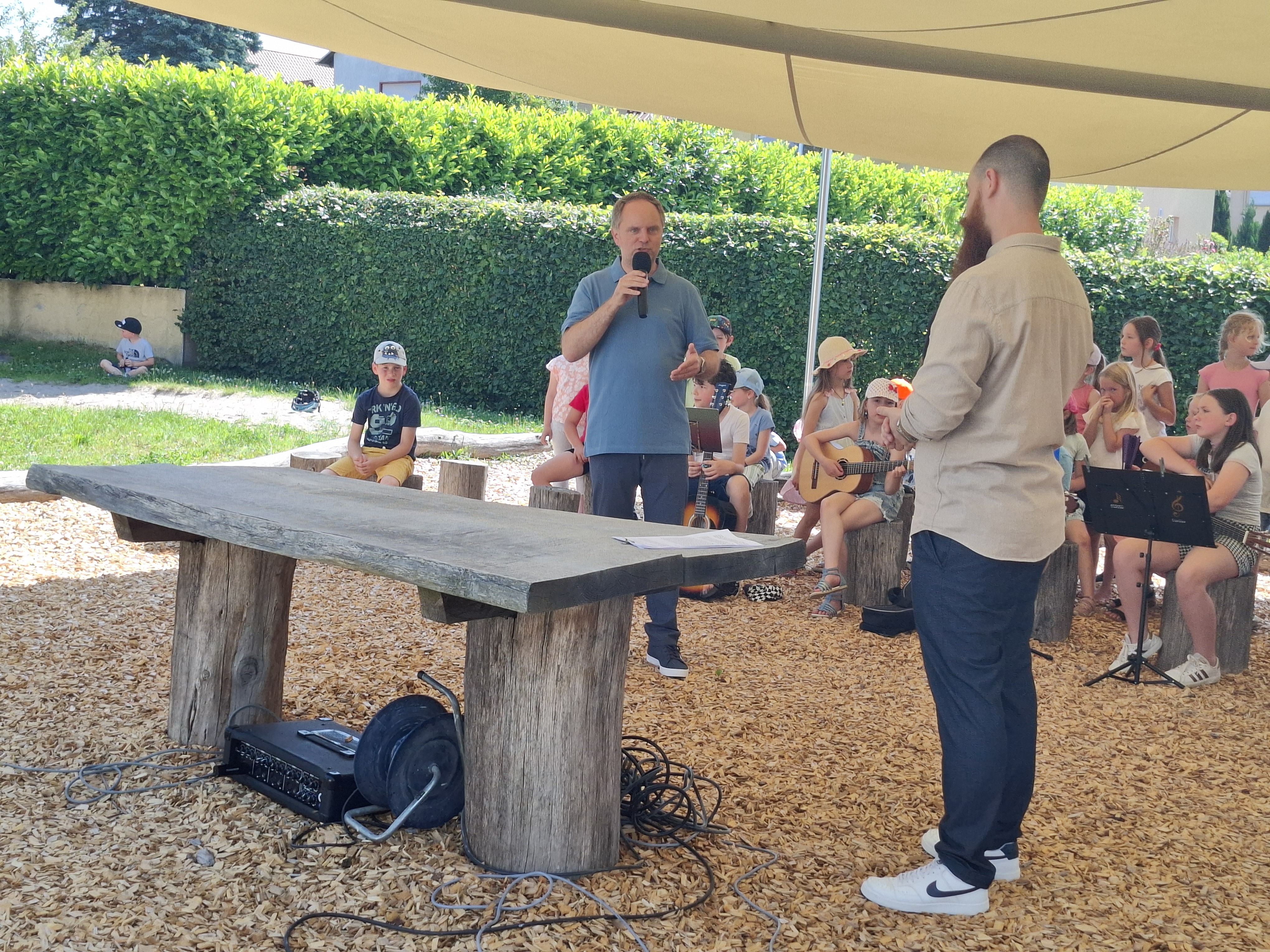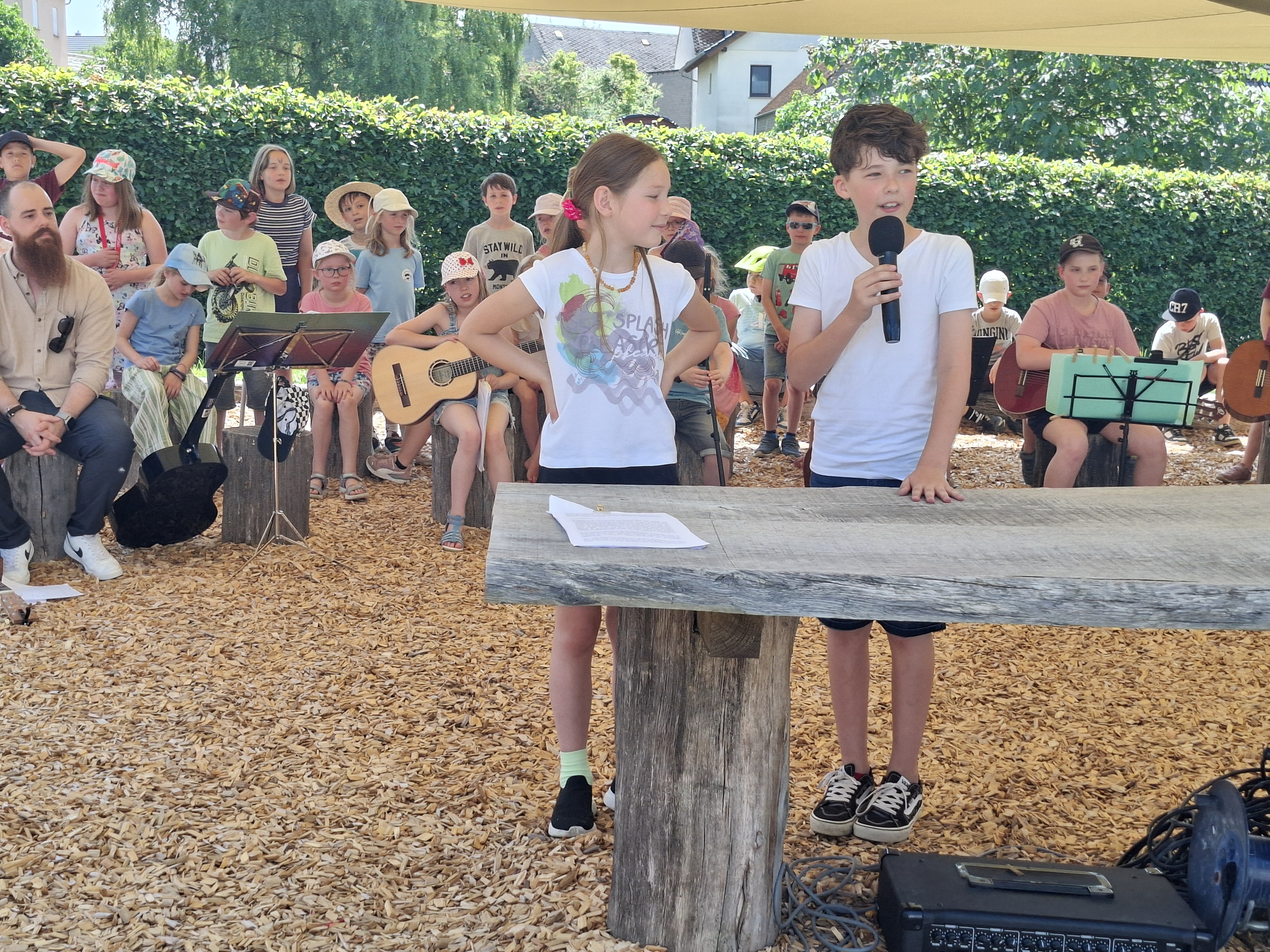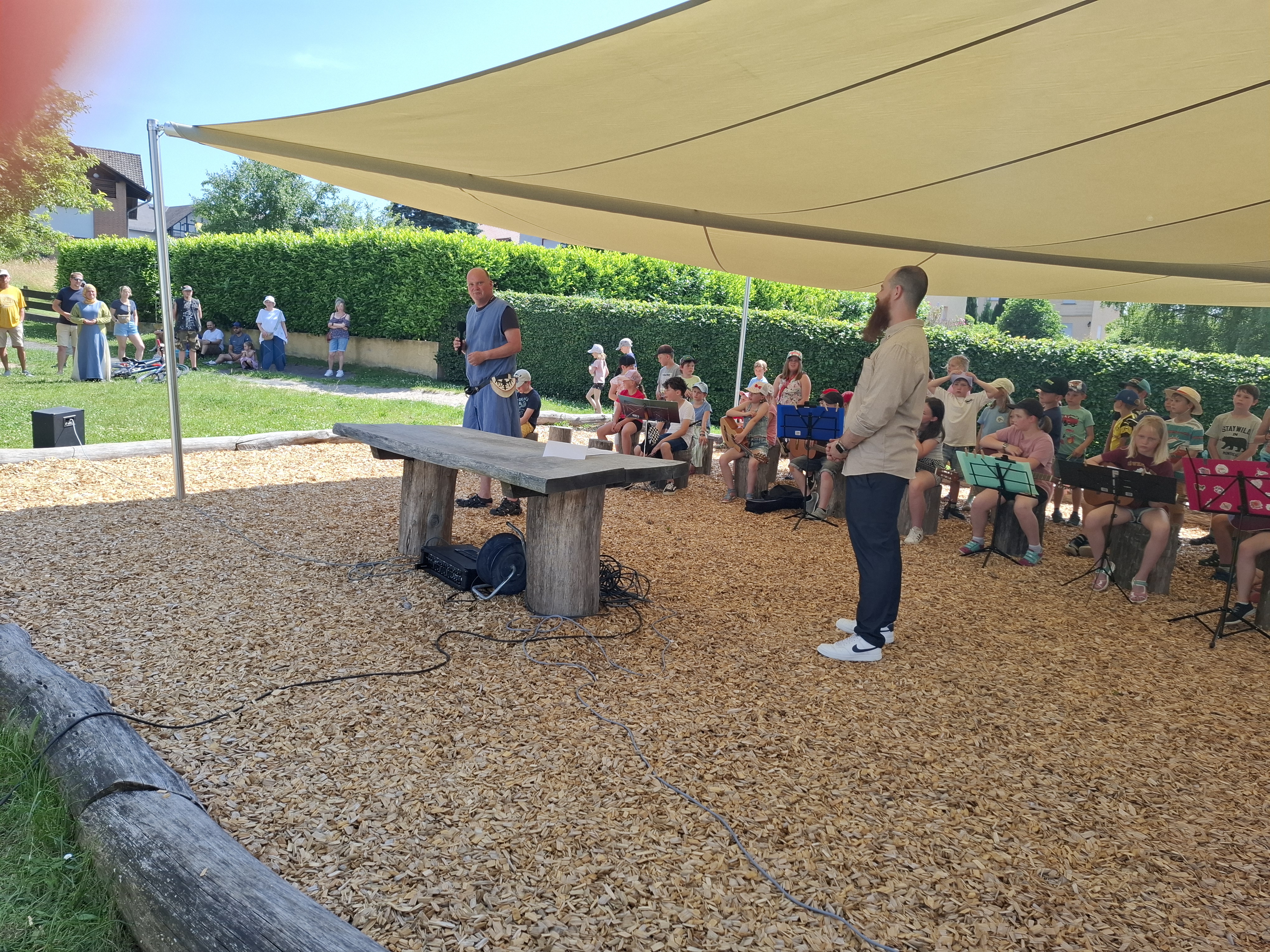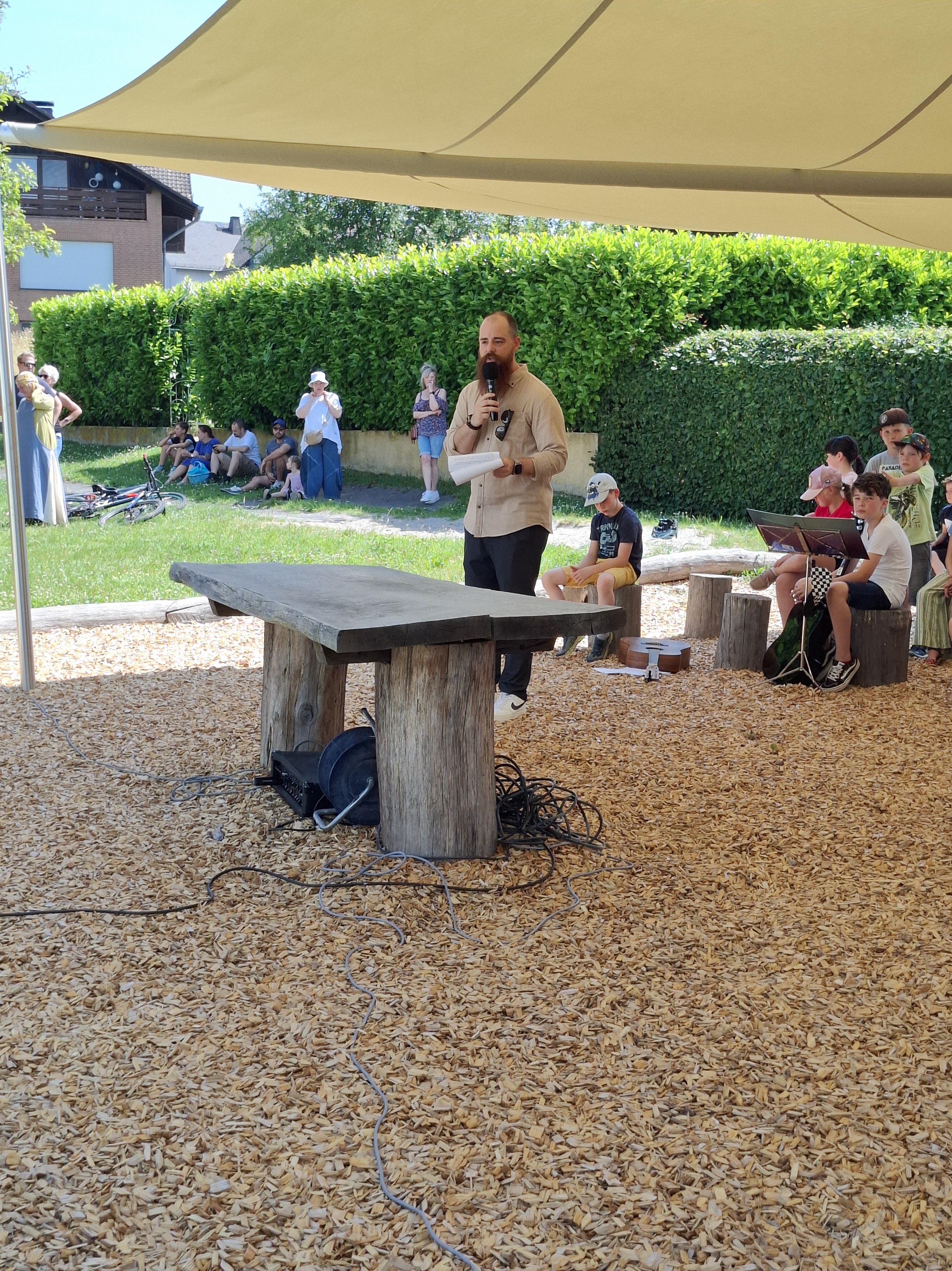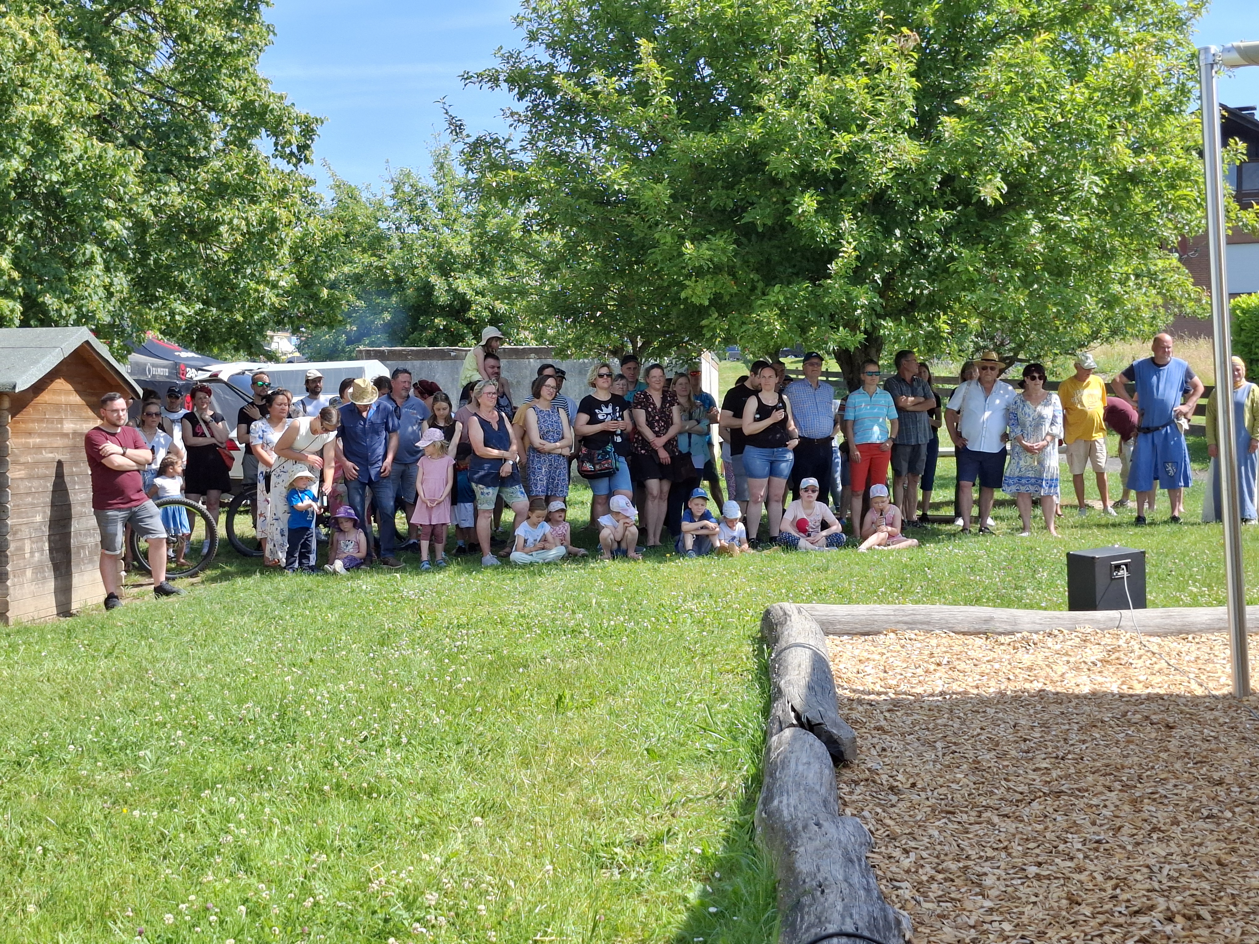 Den Startschuss zu unserem Sommerfest gab Schulleiter Patrick Bender, der die Gäste, unter anderem Verbandsbürgermeister Mike Weiland, Ortsvertreter Achim Hohl sowie Sylvia Schmidt und Kai Wernicke und Michaela Wari von der deutschen Burgenvereinigung, bei bestem Wetter Willkommen hieß und sich in seiner Rede schon einmal bei allen Mitwirkenden bedankte. Mit einem mittelalterlichen Gedicht sorgte Schülersprecher Niklas Kohl für den ein oder anderen Lacher. Die musikalische Begleitung übernahm Helmut Knopp mit der Gitarren-AG der Grundschule Dachsenhausen, die mit der Unterstützung der gesamten Schulgemeinschaft mittelalterliche Lieder zum Besten gab.