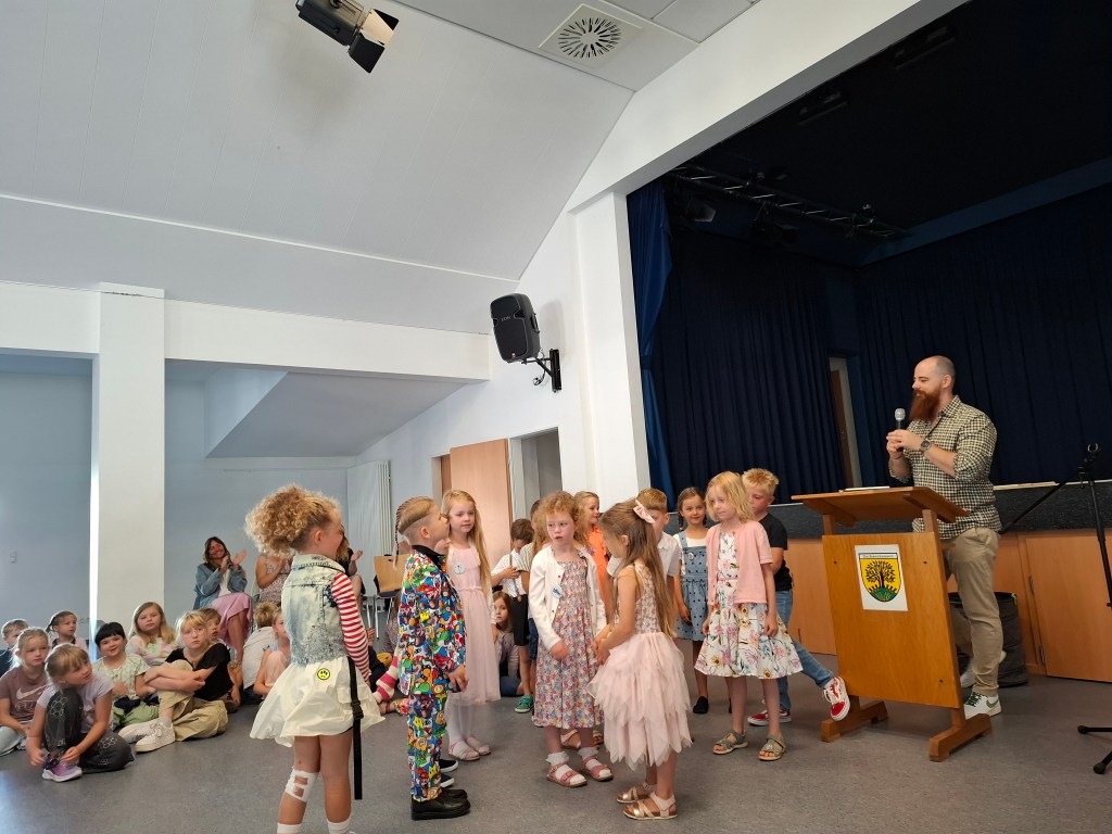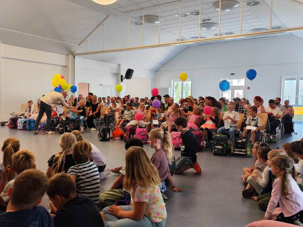 Nach dem Gottesdienst wurden die Kinder der neuen ersten Klasse natürlich auch von ihren Mitschülerinnen und Mitschülern herzlich begrüßt. Die Schülerinnen und Schüler der 2., 3. und 4. Klasse hatten ein buntes Programm vorbereitet. Es wurde Theater gespielt, gesungen und getanzt. Die Paten überreichten ihren Schützlingen Luftballons mit guten Wünschen, die sie in den Himmel steigen lassen konnten.