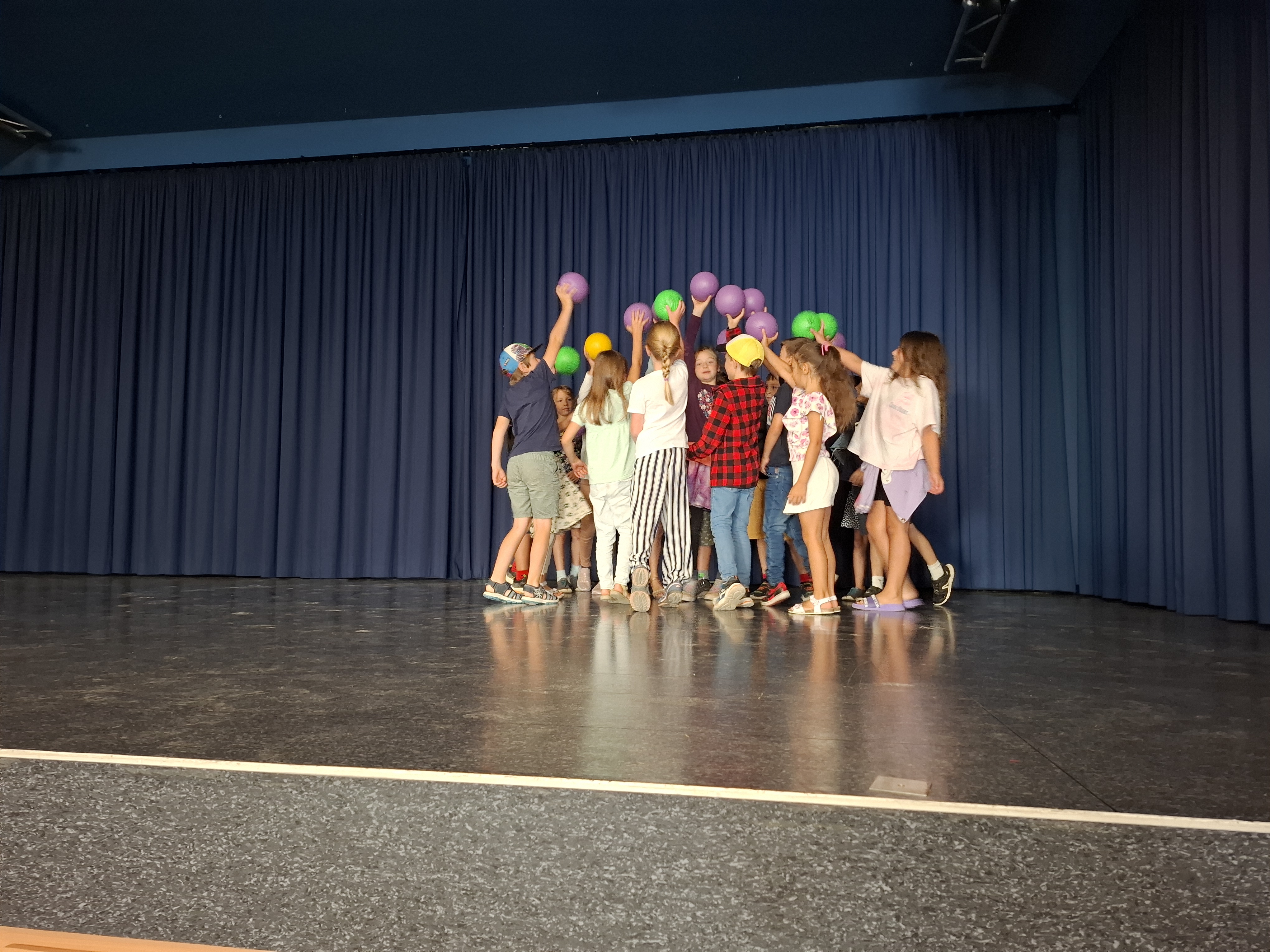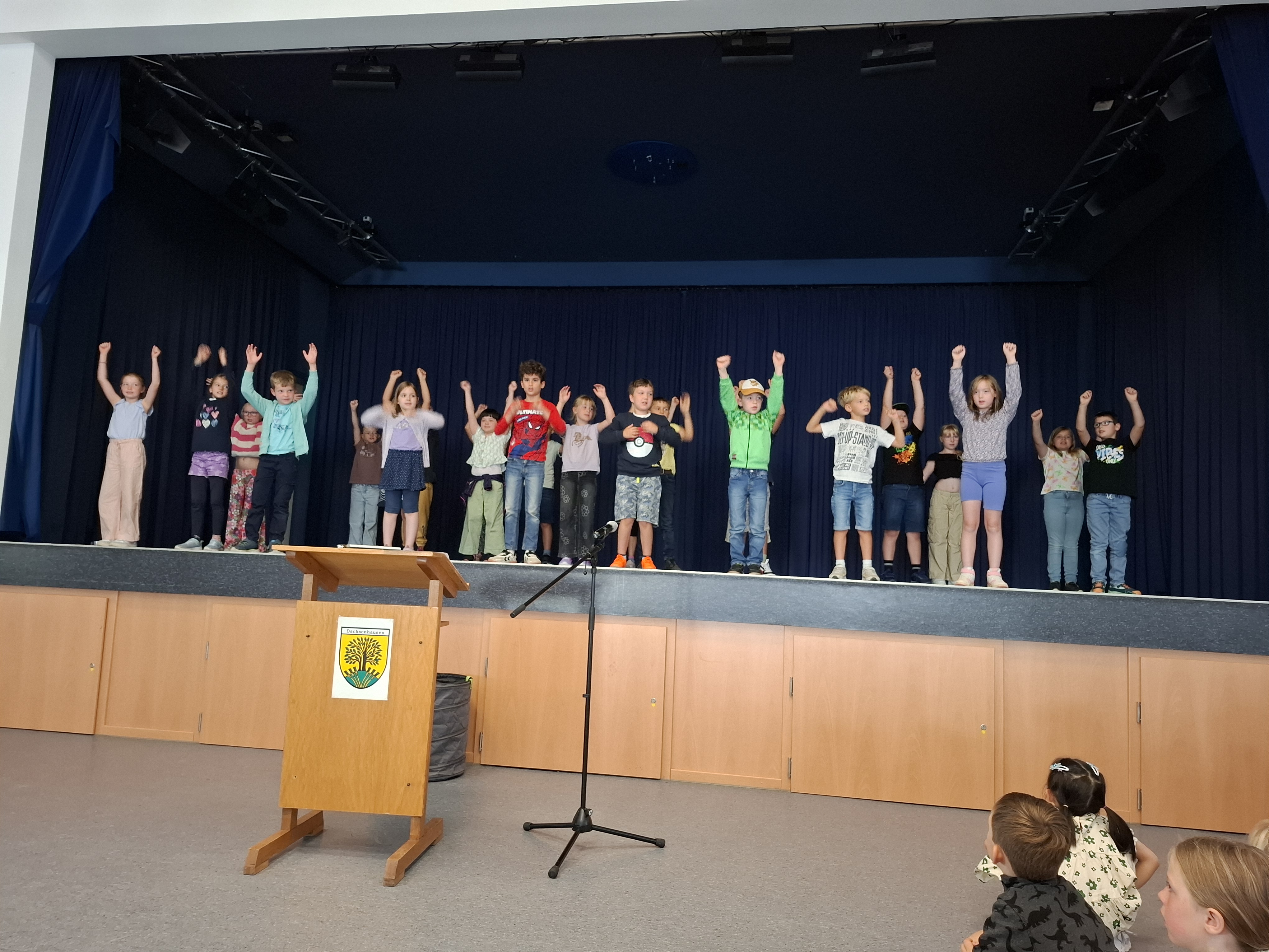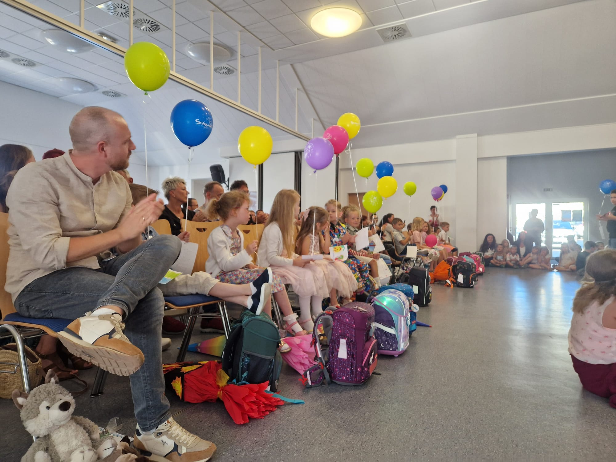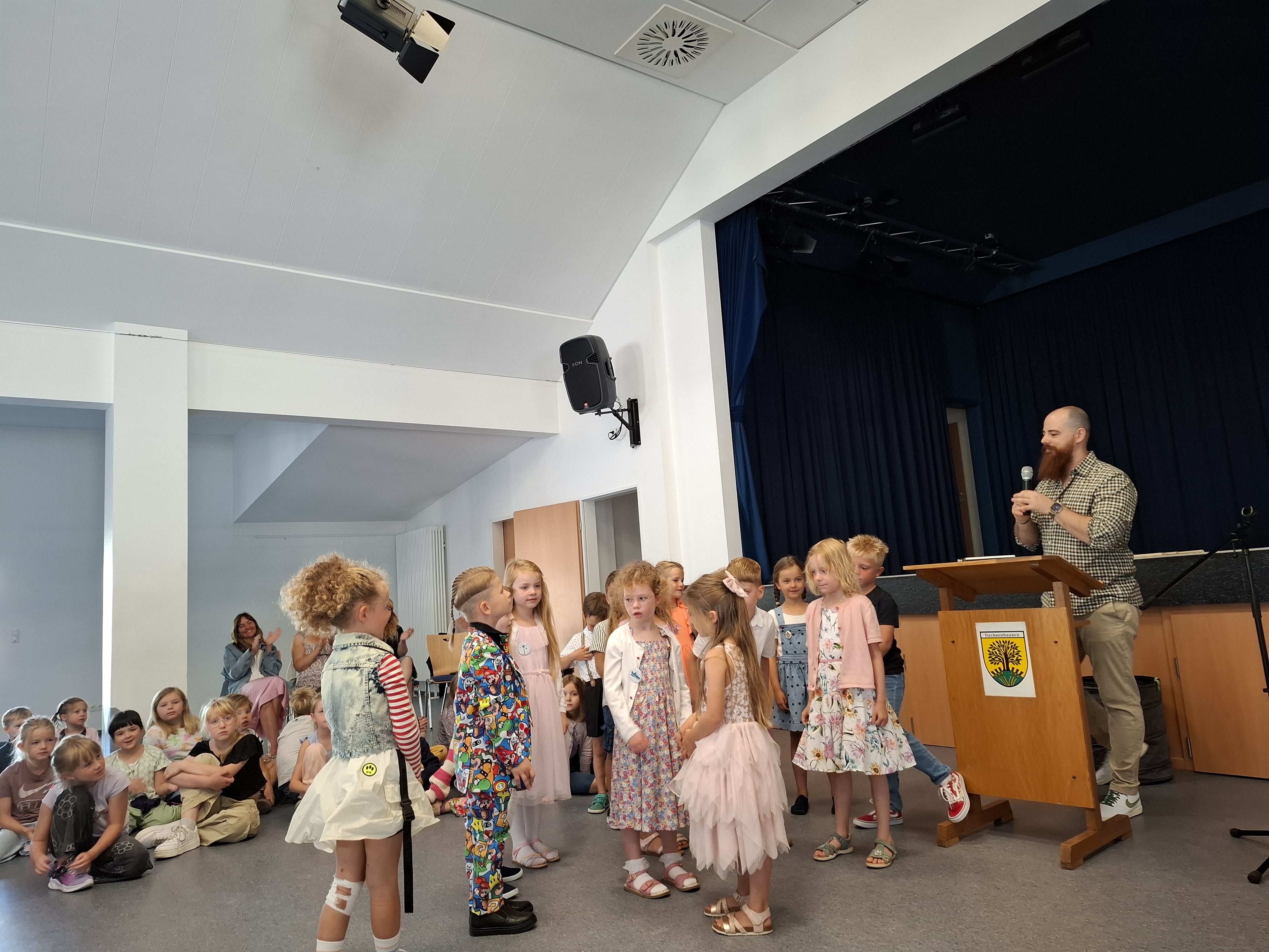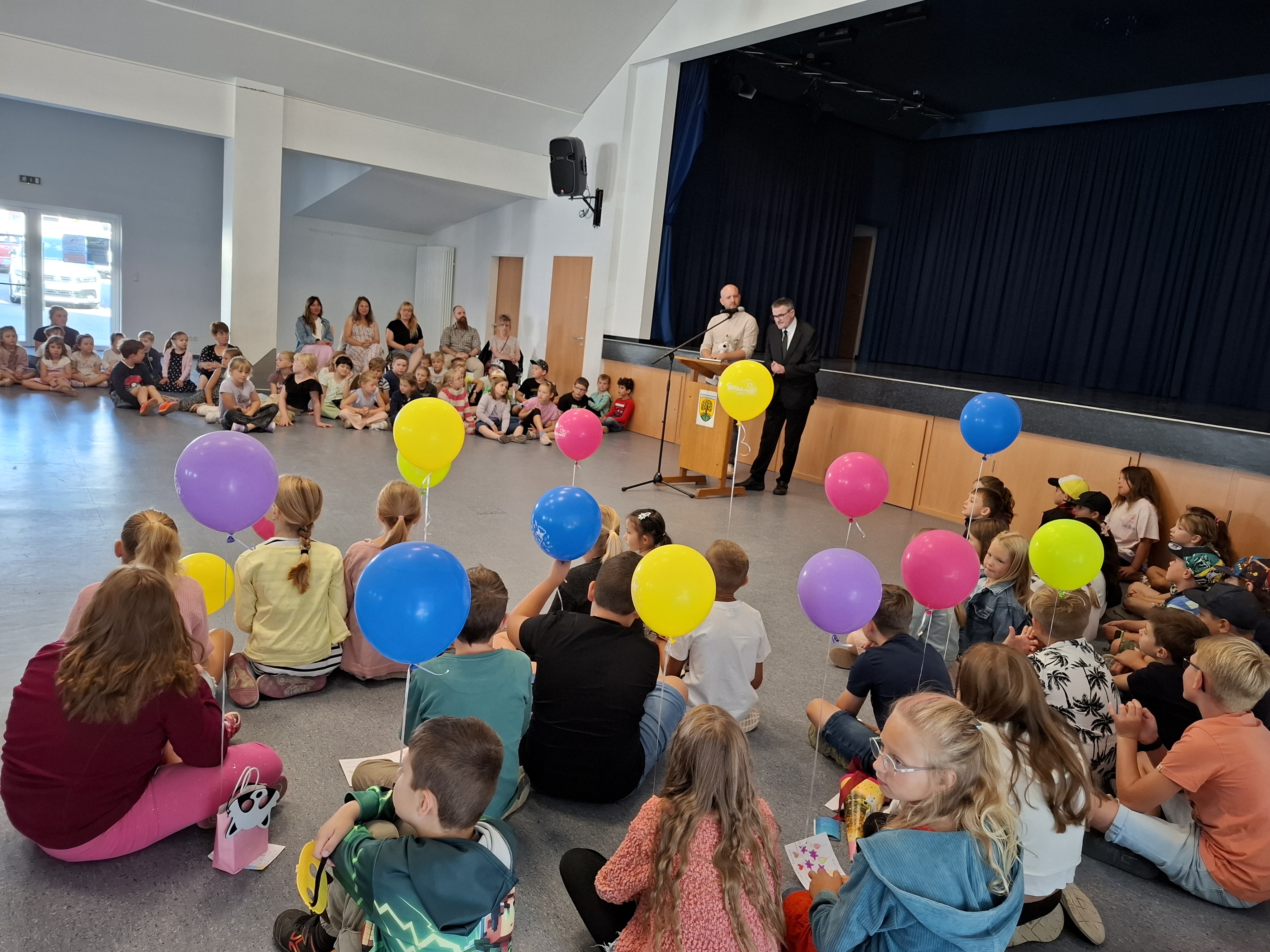 Nach dem Gottesdienst wurden die Kinder der neuen ersten Klasse natürlich auch von ihren Mitschülerinnen und Mitschülern herzlich begrüßt. Die Schülerinnen und Schüler der 2., 3. und 4. Klasse hatten ein buntes Programm vorbereitet. Es wurde Theater gespielt, gesungen und getanzt. Die Paten überreichten ihren Schützlingen Luftballons mit guten Wünschen, die sie in den Himmel steigen lassen konnten.