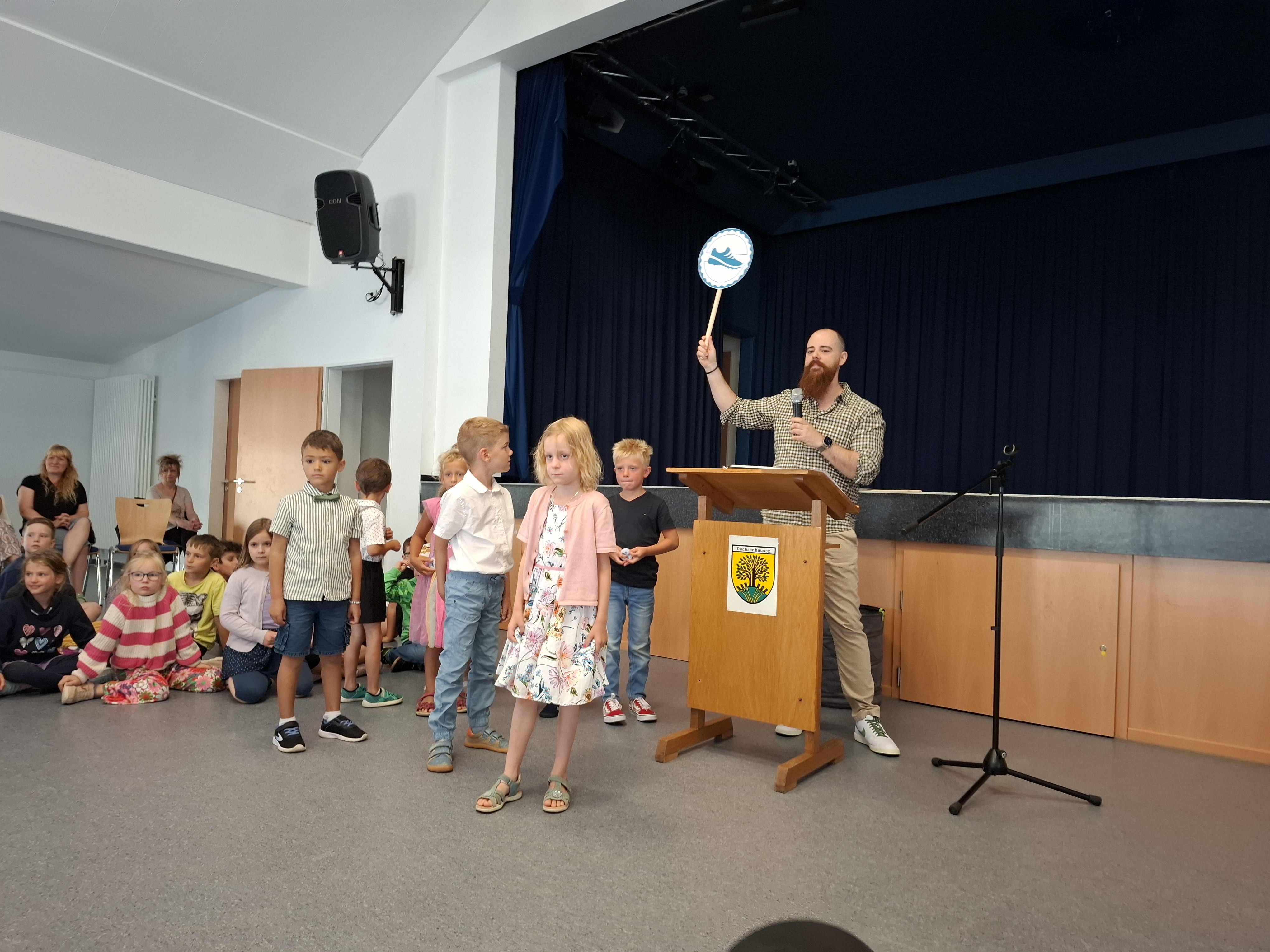 Im Anschluss daran hieß Schulleiter Patrick Bender die ABC-Schützen und ihre Familien recht herzlich Willkommen und wünschte ihnen für die nun beginnende Schulzeit viel Freude und Erfolg. In seiner Begrüßungsrede wurden die Schulankömmlinge zu Superhelden, mit deren Hilfe mysteriöse Vorkommnisse an der Grundschule Dachsenhausen gelöst wurden.