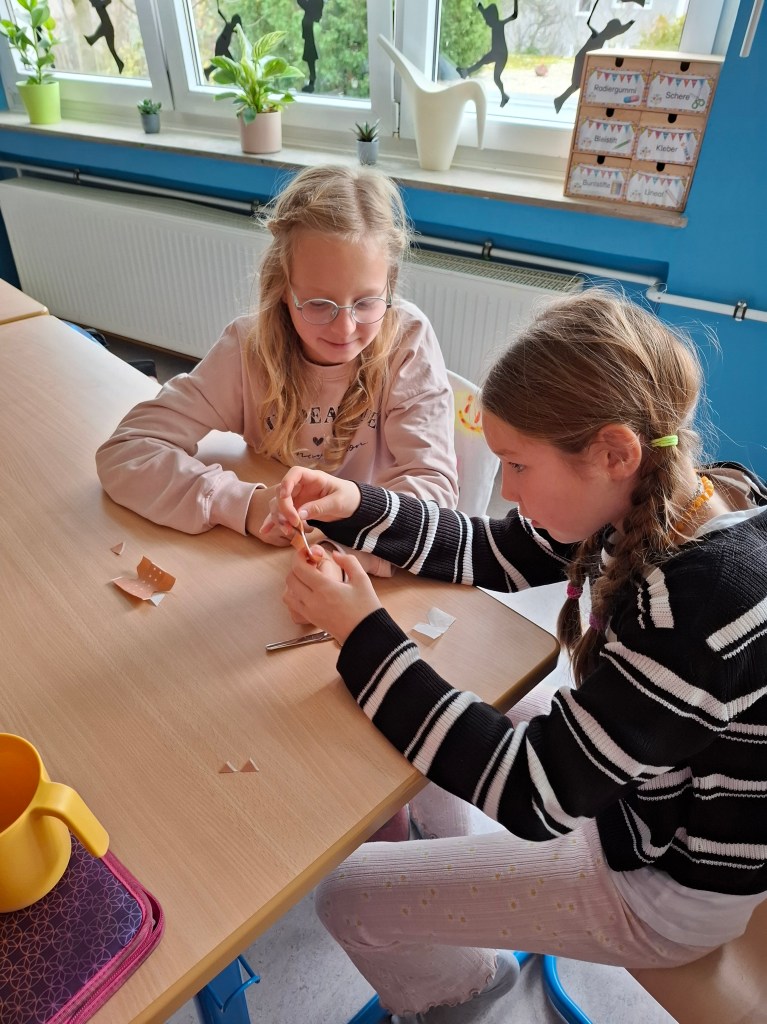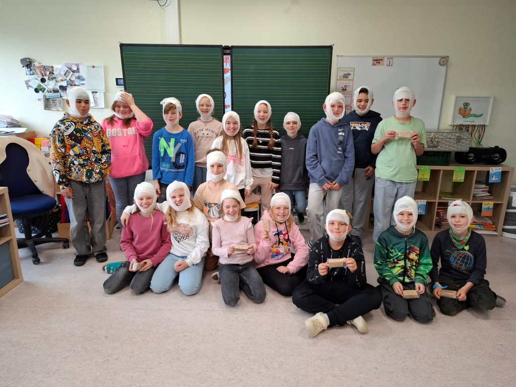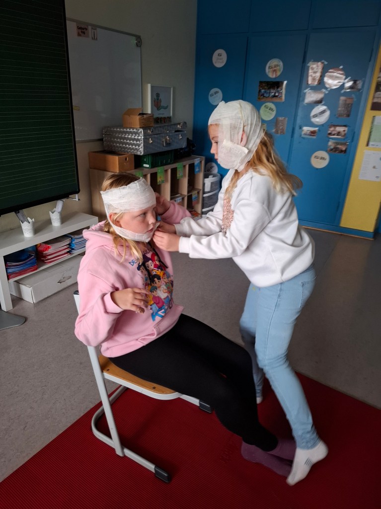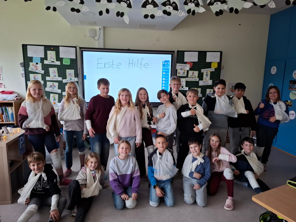 Am Freitag, den 14.11.2025 sowie am Freitag, den 05.12.2025, durfte die Waschbärenklasse der Grundschule Dachsenhausen an einem Erste-Hilfe-Kurs teilnehmen. Dafür kam Wolfang Mai vom deutschen roten Kreuz an zwei Schulvormittagen für jeweils zwei Schulstunden ins Klassenzimmer und vermittelte den Schülerinnen und Schülern der 4. Klasse mit Unterstützung von Sarah Mai auf kindgerechte Art und Weise die Grundlagen der Ersten Hilfe. Der Beginn einer Rettungskette und auch das richtige Absetzen eines Notrufes wurden thematisiert. Anschließend wurde besprochen, wie man handelt, wenn man eine bewusstlose Person vorfindet. Die stabile Seitenlage wurde demonstriert und natürlich gemeinsam ausprobiert. Die einzelnen Schritte waren wie folgt: Person ansprechen, Puls und Atmung checken, Person in stabile Seitenlage legen. Nach anfänglichen Berührungsängsten wurden die Kinder immer selbstsicherer und hatten am Ende keine Probleme ihre Mitschülerinnen und Mitschüler in die stabile Seitenlage zu ziehen. Die Kinder lernten zudem eine kleine Schnittwunde mit Hilfe eines Pflasters fachgerecht zu versorgen. Abschließend wurde dann in Partnerarbeit sogar das Anlegen eines Kopf-, Arm-, und Beinverbands geübt.