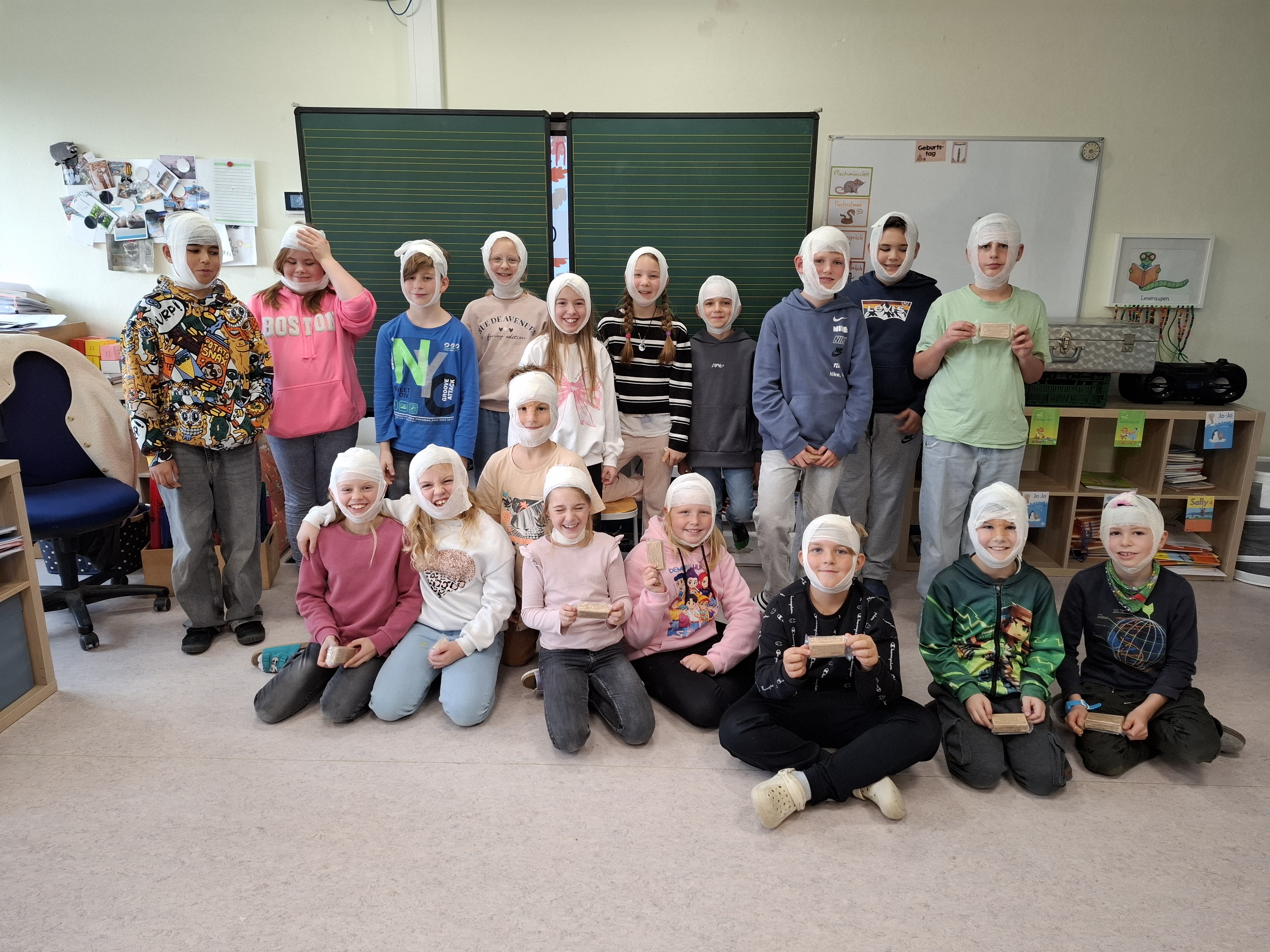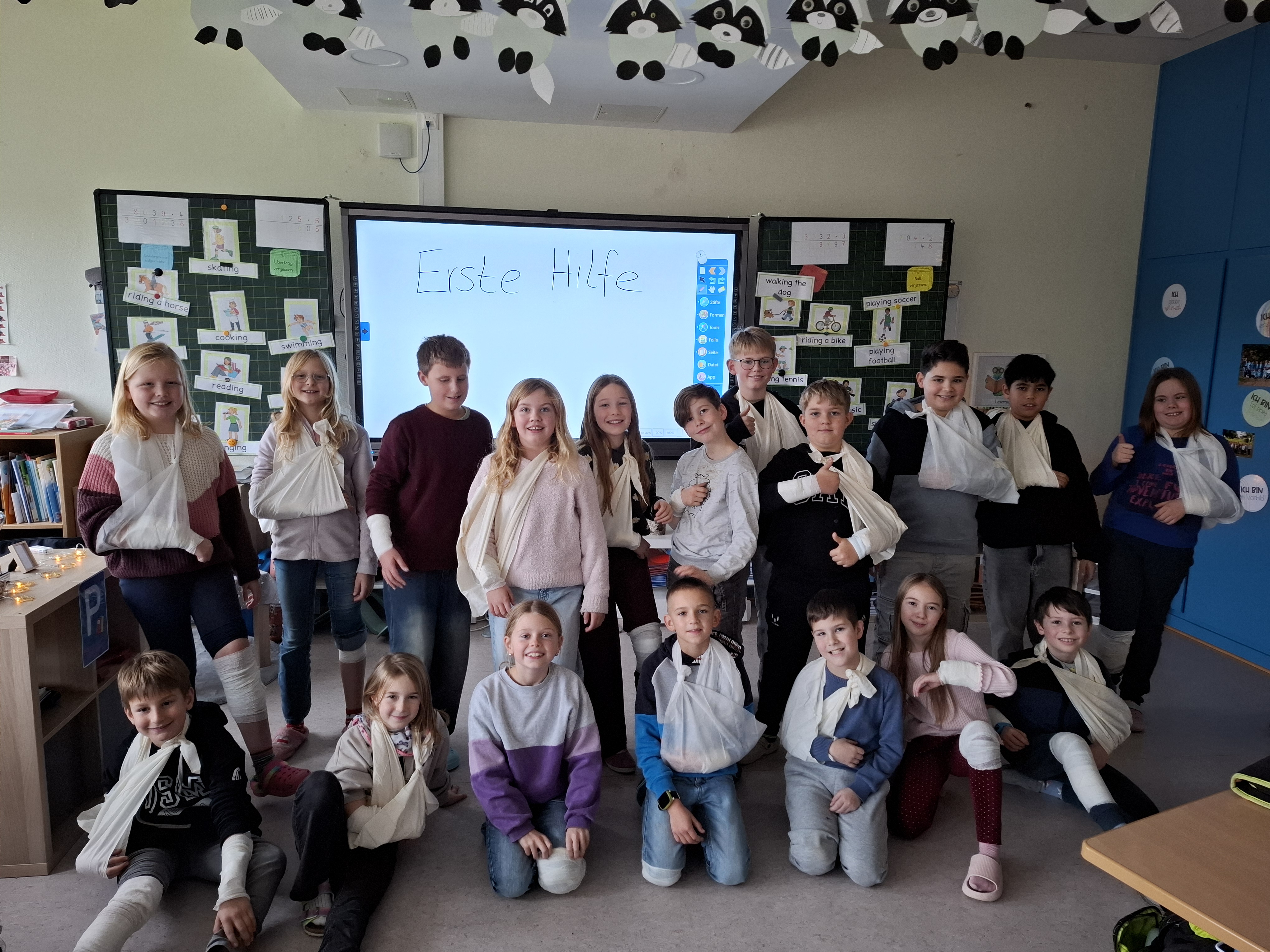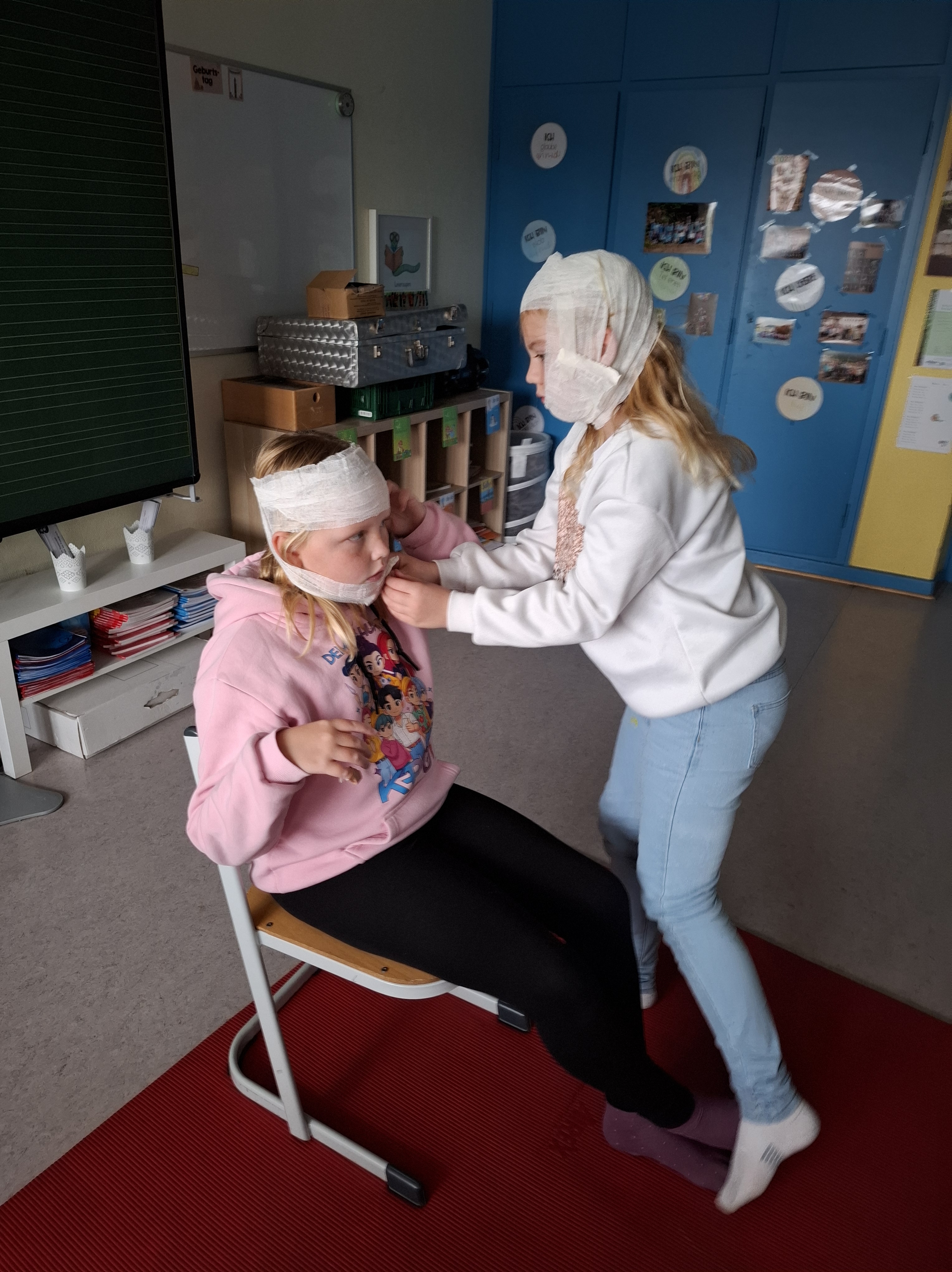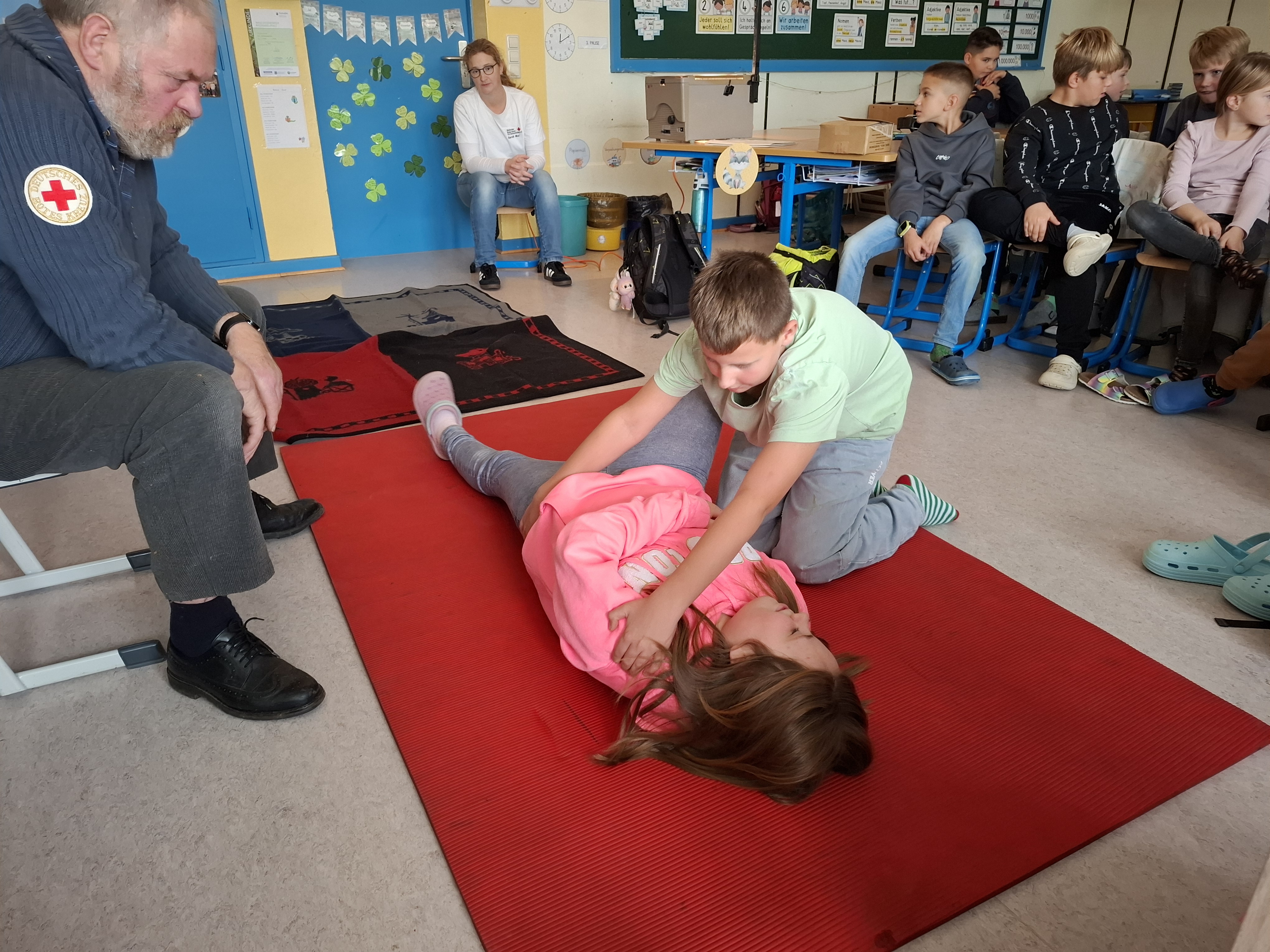 Am Freitag, den 14.11.2025 sowie am Freitag, den 05.12.2025, durfte die Waschbärenklasse der Grundschule Dachsenhausen an einem Erste-Hilfe-Kurs teilnehmen. Dafür kam Wolfang Mai vom deutschen roten Kreuz an zwei Schulvormittagen für jeweils zwei Schulstunden ins Klassenzimmer und vermittelte den Schülerinnen und Schülern der 4. Klasse mit Unterstützung von Sarah Mai auf kindgerechte Art und Weise die Grundlagen der Ersten Hilfe. Der Beginn einer Rettungskette und auch das richtige Absetzen eines Notrufes wurden thematisiert. Anschließend wurde besprochen, wie man handelt, wenn man eine bewusstlose Person vorfindet. Die stabile Seitenlage wurde demonstriert und natürlich gemeinsam ausprobiert. Die einzelnen Schritte waren wie folgt: Person ansprechen, Puls und Atmung checken, Person in stabile Seitenlage legen. Nach anfänglichen Berührungsängsten wurden die Kinder immer selbstsicherer und hatten am Ende keine Probleme ihre Mitschülerinnen und Mitschüler in die stabile Seitenlage zu ziehen. Die Kinder lernten zudem eine kleine Schnittwunde mit Hilfe eines Pflasters fachgerecht zu versorgen. Abschließend wurde dann in Partnerarbeit sogar das Anlegen eines Kopf-, Arm-, und Beinverbands geübt.
