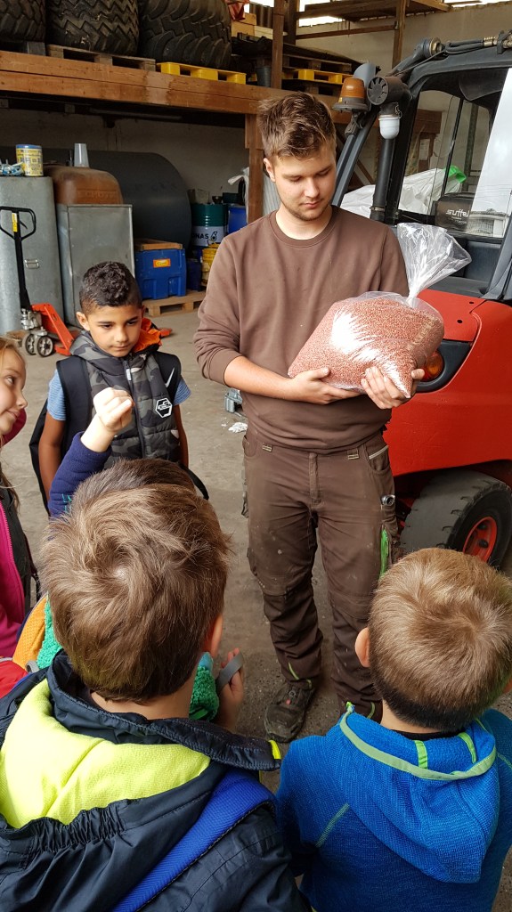 Ganz nach dem Motto, Schüler lernen am besten von Schülern, erklärte Lehrling Joshua der Klasse den Aufbau und die Funktionen der einzelnen Maschinen, wobei die Schüler bereits hier ihr erlangtes Wissen unter Beweis stellen konnten. Neben den Maschinen erklärte Frau Wagner der Klasse u.a. die Funktion und den Einsatz von Pflanzenschutzmitteln und welche Getreidesorten in der Umgebung zu welchen Zeiten angebaut werden.