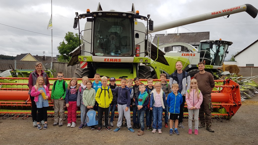 Doch der beste Unterricht ersetzt nicht die Erfahrung in der direkten Auseinandersetzung mit dem Lerninhalt und so lud uns am Freitag den 13.09.2019 der Lohnbetrieb Max Wagner zu einem Besuch auf ihren Hof ein, um die Gerätschaften und Maschinen für die Getreideernte in wahrer Größe zu erleben. Die Kinder staunten nicht schlecht, nachdem uns Herr und Frau Wagner mit ihrem Lehrling Joshua begrüßten und kurz darauf den Mähdrescher und den Feldhäcksler präsentierten.