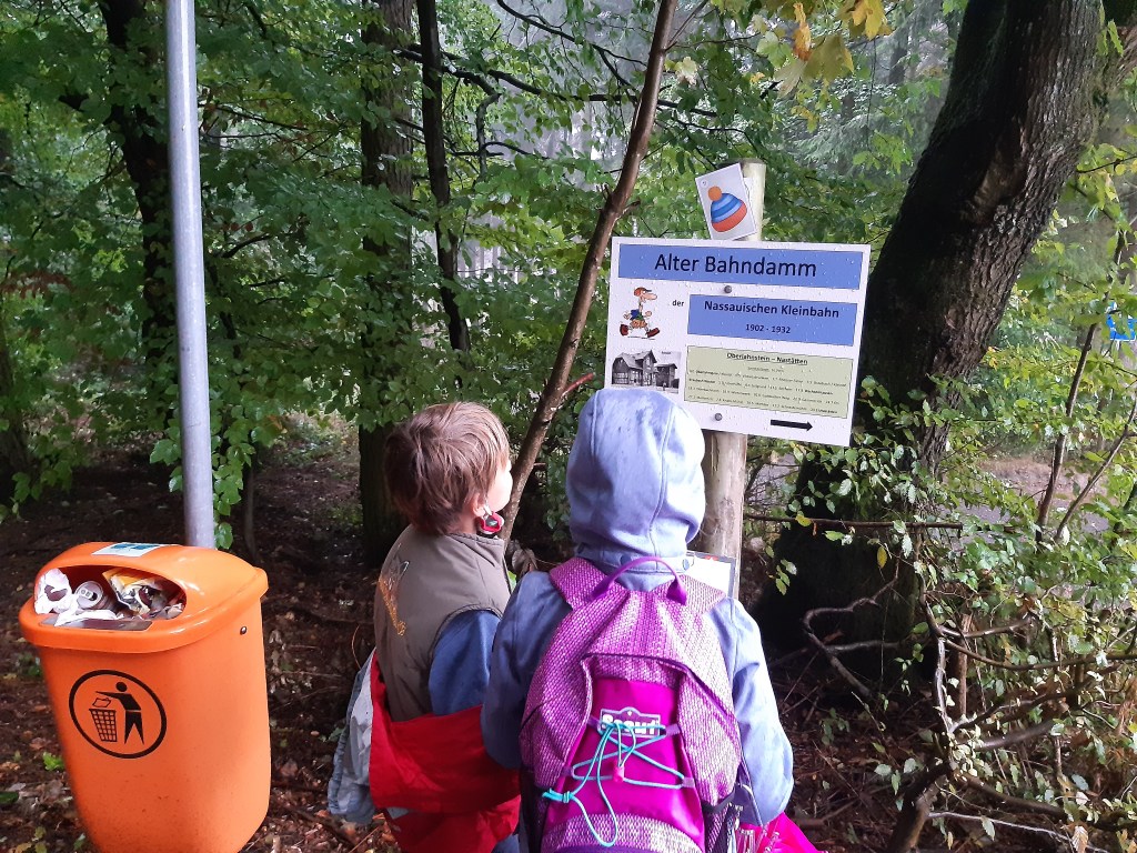 Am Freitag, den 09.10.2020 machte sich die Klasse 3 der Grundschule Dachsenhausen auf den Weg in den Wald. Das Wetter meinte es an diesem Tag nicht gut mit den Schülerinnen und Schülern. Mit passender Kleidung, Gummistiefeln und Regenschirm bewaffnet, waren trotzdem aller bester Laune. Im Wald angekommen, hatte Klassenlehrerin Frau Igel einen Lesespaziergang mit dem Thema „Ein Waldspaziergang im Herbst“ vorbereitet. Bei einem Lesespaziergang bewegen sich die Kinder frei in ihrer Umgebung. Die Kinder erhalten einen Lesetext, welcher auf einem Klemmbrett befestigt wird. Zunächst wird der erste Satz erlesen und im Anschluss das passende Bild dazu gesucht. Die Zahl, die auf dem Bild zu finden ist, wird hinter dem jeweiligen Bild notiert. Außerdem befindet sich dort auch noch ein Buchstabe. Die Buchstaben ergeben am Ende ein Lösungswort.