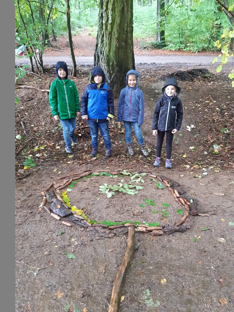 Anschließend bestand die nächste Aufgabe darin, ein Mandala aus Naturmaterialien zu legen. Die Kinder hatten dabei riesigen Spaß und es entstanden wirklich tolle und kreative Mandalas. Nach getaner Arbeit durfte das freie Spielen im Wald natürlich nicht fehlen. Neben Pfützenspringen und Matschrutschen, spielten die Kinder fangen oder bauten eine Hütte.