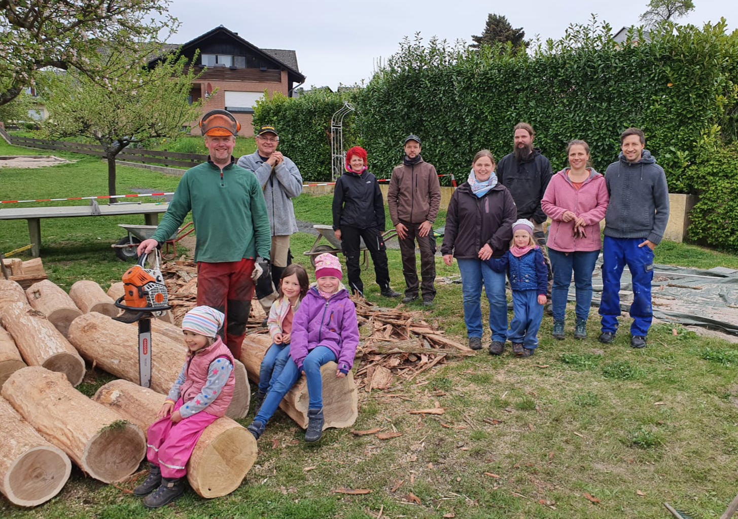 Der Wald und Wiese Dachsenhausen e.V. sowie einige freiwillige HelferInnen befreien die Sitzbänke von groben Splittern.