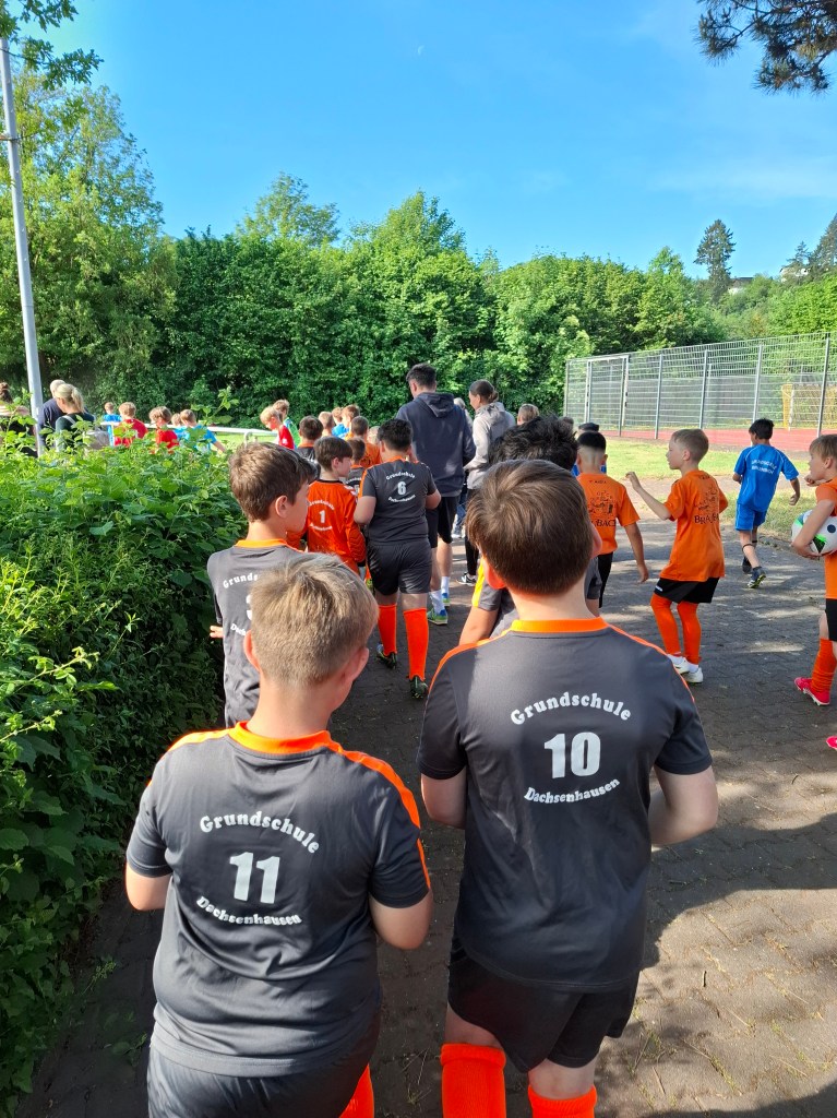 Am 17.06.2025 fand das beliebte Mädchenfußballturnier der Grundschulen im Rhein-Lahn-Kreis in Niederneisen statt. Nach einer längeren Pause nahmen in diesem Jahr endlich wieder 8 motivierte Schülerinnen der Grundschule Dachsenhausen an dem Turnier teil. Um 7:00 Uhr ging die Reise nach Niederneisen los. Zwölf Mannschaften aus verschiedenen Grundschulen des Rhein-Lahn-Kreises spielten um den Pokal. Tapfer kämpfte sich die Mannschaft aus Dachsenhausen bei 26 Grad und strahlend blauem Himmel von Spiel zu Spiel. Leider konnten sie sich dabei nicht gegen ihre Konkurrenz durchsetzen. Trotzdem stand der Spaß im Vordergrund. Rundum war es ein sehr erfolgreicher Tag nach dem Motto „Teamwork“ und „Fairplay“.