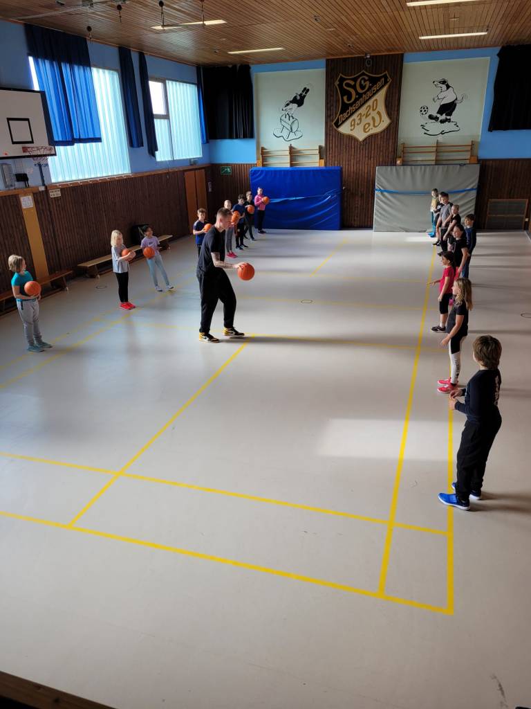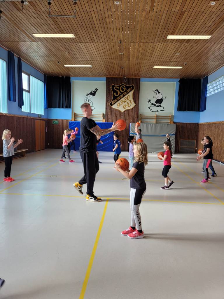Der Sportunterricht begann am Montag, dem 28.10.2024, für die Schüler der 4. Klasse der Grundschule Dachsenhausen wie gewohnt. Zuerst hieß es umziehen und dann mit ein paar Ballspielen in der Sporthalle aufwärmen. Normalerweise hätten dann die Basketbälle passend zum aktuellen Sportunterricht verteilt werden sollen, doch stattdessen hatte der Klassenlehrer als Überraschung einen besonderen Gast dabei. Robin Benzing, Basketballprofi und ehemaliger Nationalspieler, der selbst eine Tochter an der Grundschule in Dachsenhausen hat, hatte sich mit Freude bereiterklärt, die Kinder beim ihrem Unterrichtthema Basketball für eine Stunde zu coachen. Nach einer Vorstellungsrunde, in welcher sich der Basketballer den Fragen der neugierigen Kinder stellte, ging es auch schon los mit den ersten Korbwürfen. Dass sich die Anwesenheit des Profis positiv auf die Kinder auszuwirken schien, zeigte sich direkt durch die vielen Treffen der Schüler. Schnell zu zweit gegenüber aufgestellt, zeigte Robin, der aktuell für die Gießener 46ers spielt, den Kindern im Anschluss verschiedene Dribbel- und Geschicklichkeitsübungen, durch welche die Kinder ein Gefühl für den Ball bekommen sollten. Dabei gab der Profi den Kindern immer wieder hilfreiche Tipps und motivierte sie, nicht aufzugeben. Bevor sich die Sportstunde dem Ende neigte, bedankte sich der Basketballer für die tolle Sportstunde und lobte die Kinder für ihren sportlichen Einsatz. Neben einem gemeinsamen Gruppenfoto gab es zum Schluss für jedes Kind einen Aufkleber und einen Anhänger des Deutschen Basketball Bunds als kleines Geschenk. Diese Sportstunde werden die 4. Klässler nicht so schnell vergessen und wer weiß, vielleicht tritt einer von ihnen, inspiriert von diesem besonderen Besuch, in die Fußstapfen des Profis.