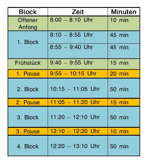 Für die 2. Klasse endet der Schultag von Montag bis Donnerstag ebenfalls um 12.10 Uhr, freitags jedoch erst um 13.10 Uhr