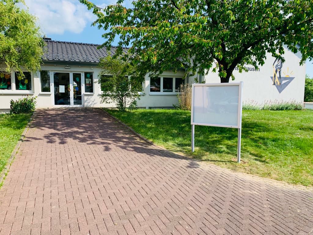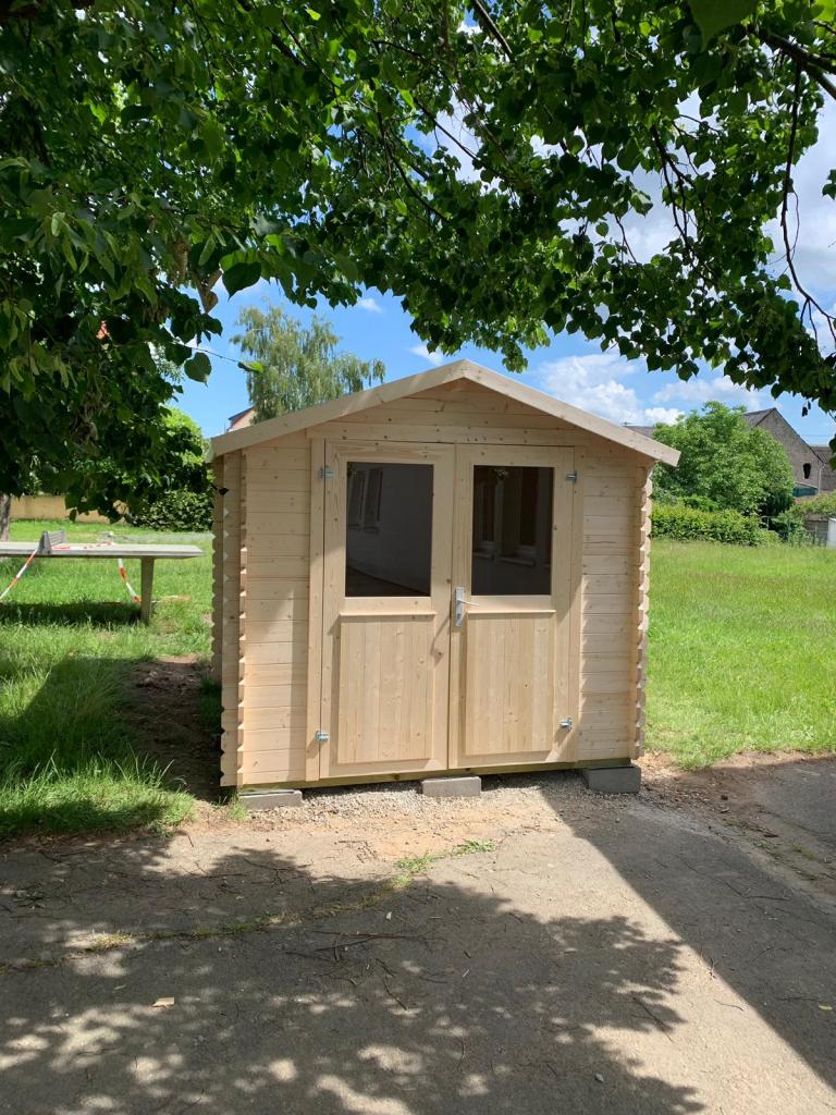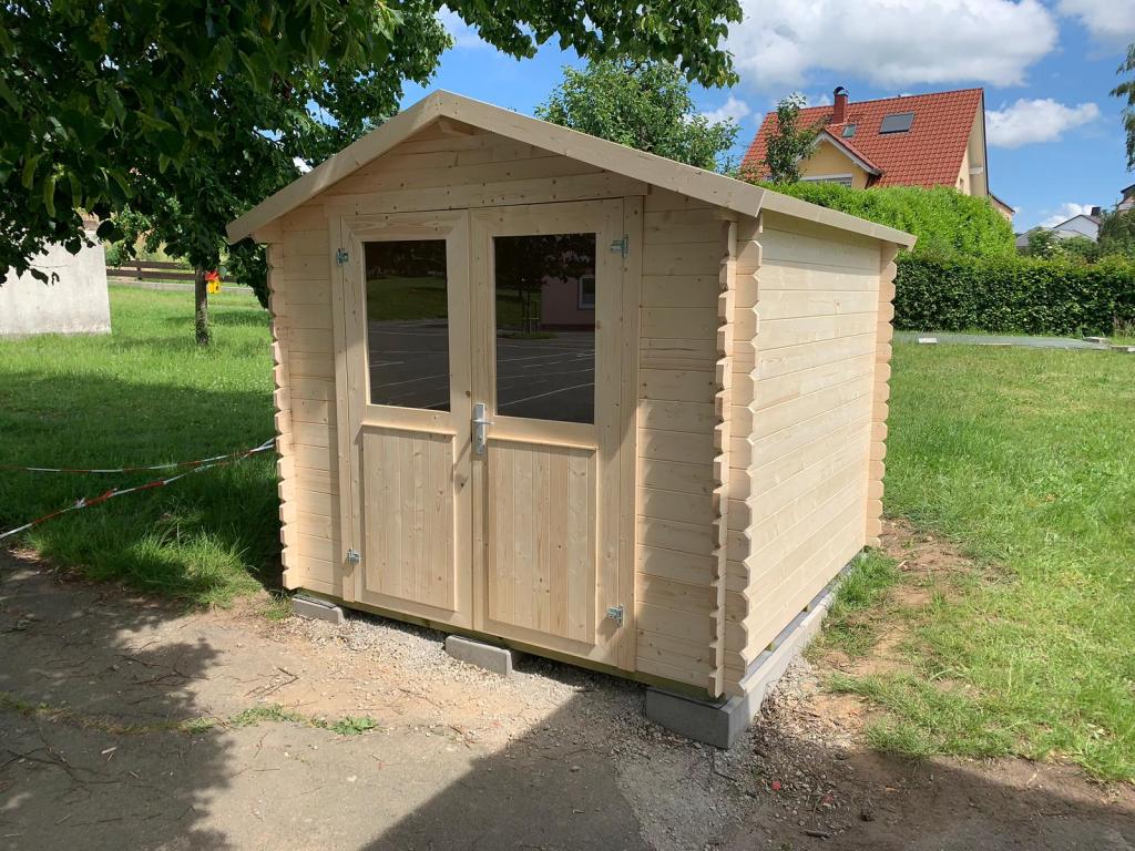 Um überhaupt Platz im Flur schaffen zu können, haben wir für die Schule ein Gerätehaus für das Außengelände gekauft. Hier können die Spielgeräte der Kinder geordnet und außerhalb des Flurs aufbewahrt werden.